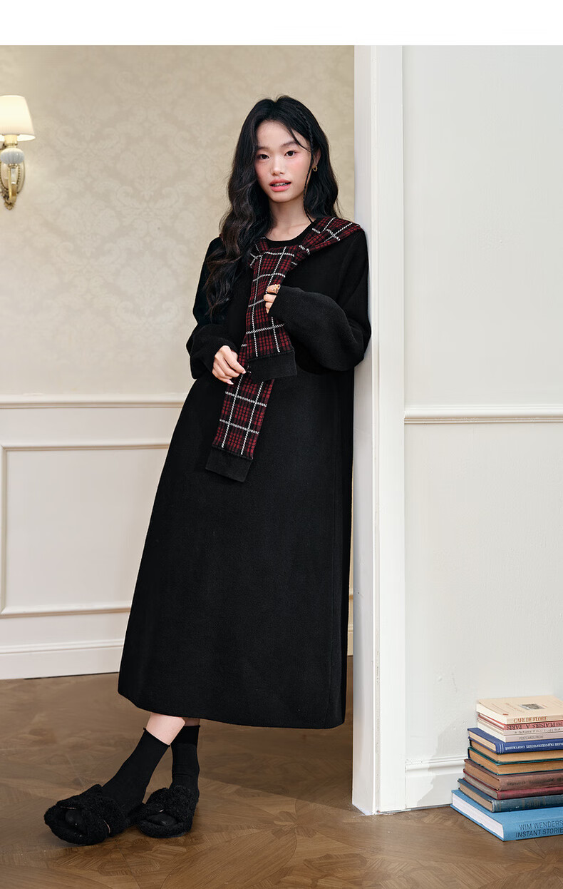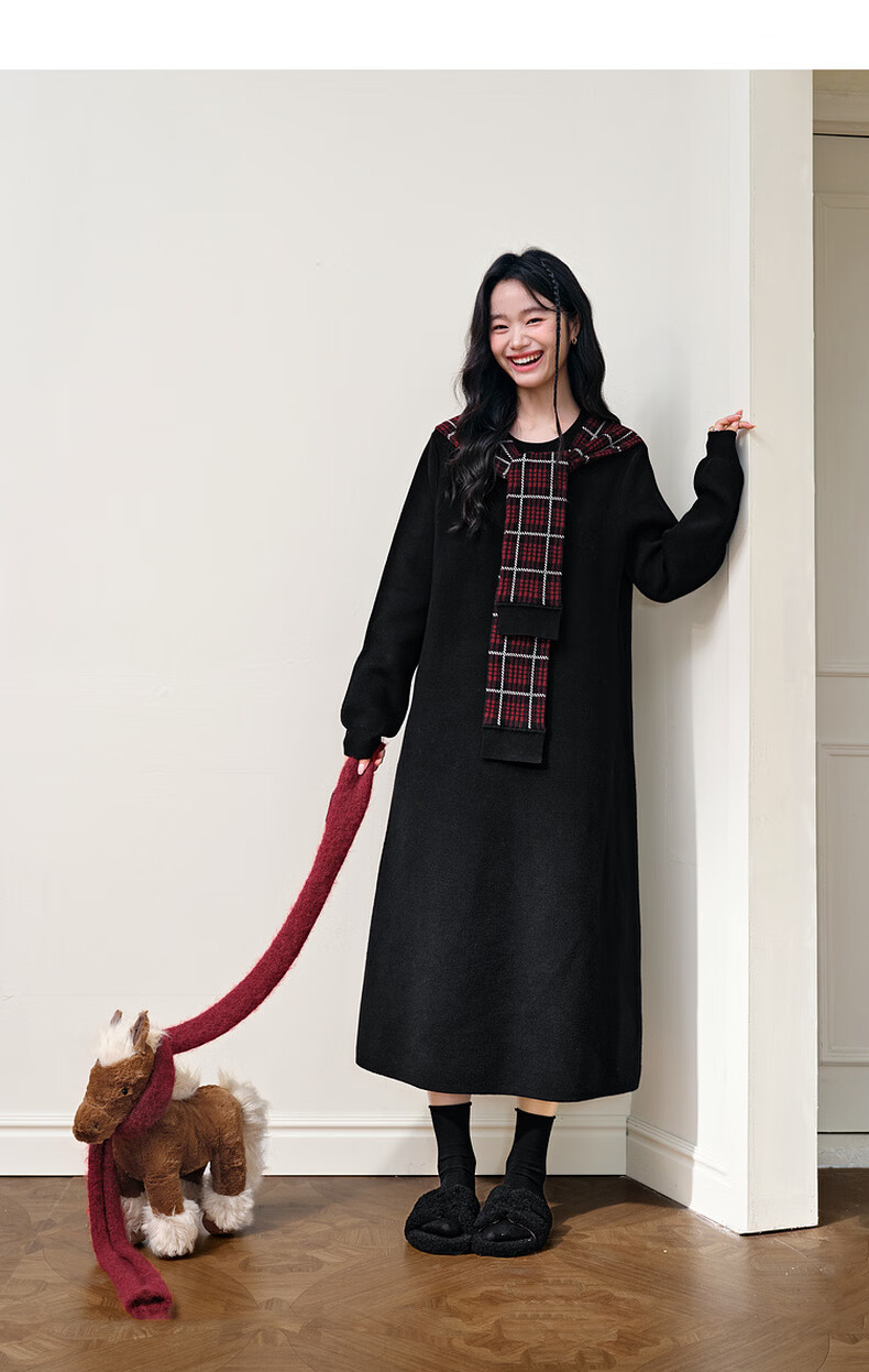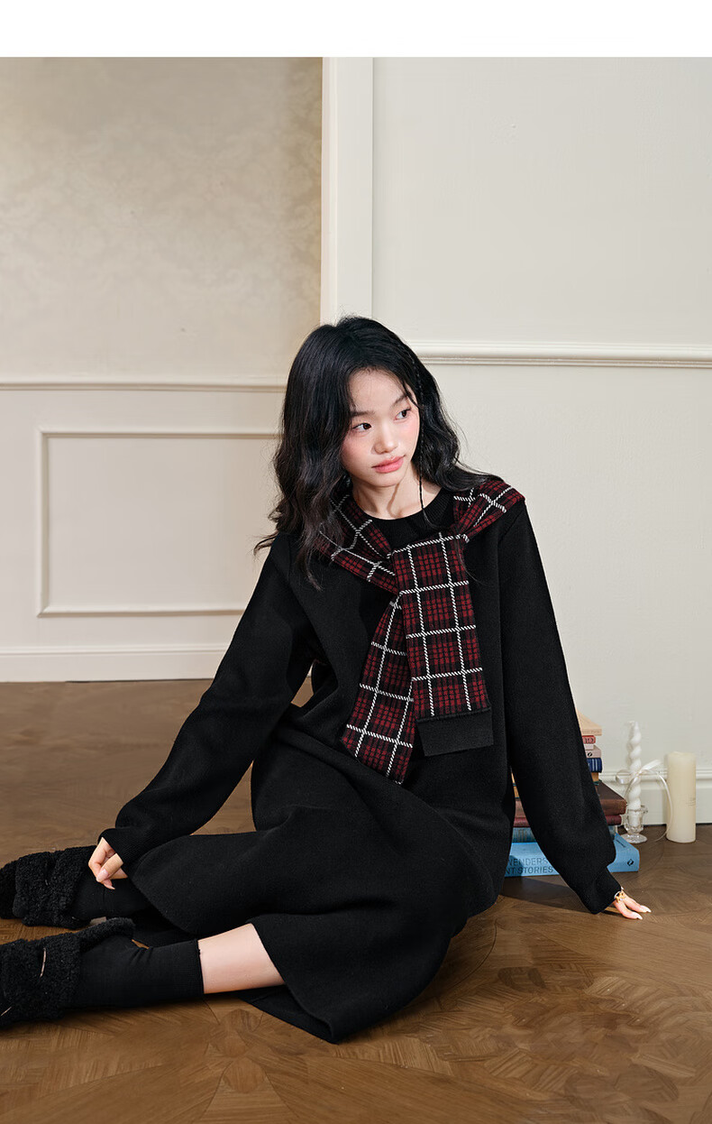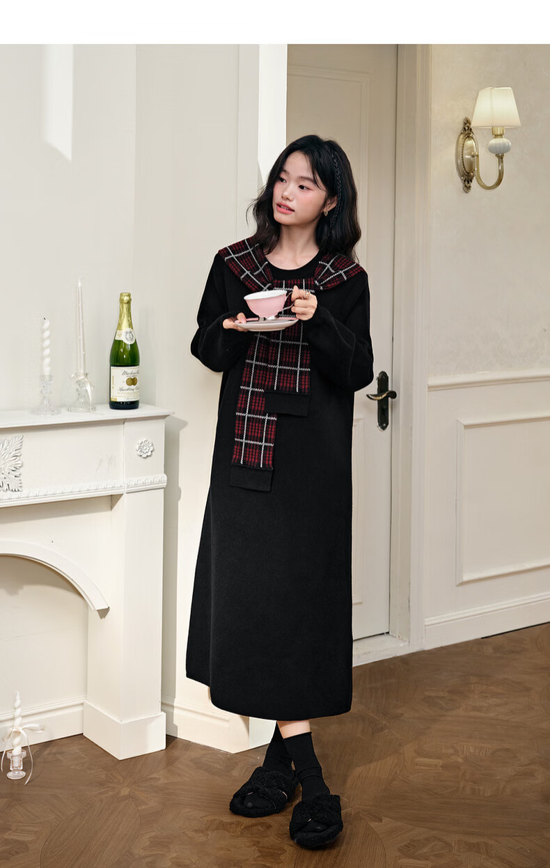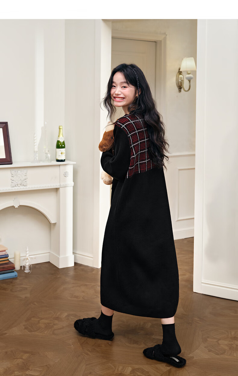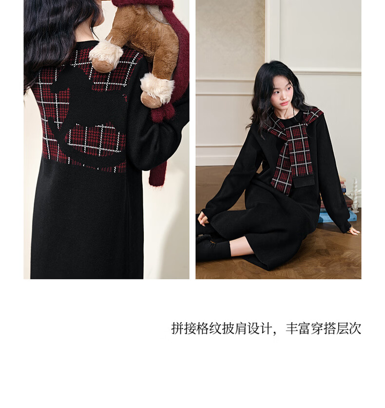 阔色圣诞拼接格纹披肩毛衣裙女2025秋冬季新款黑色针织连衣裙长裙 黑色 M