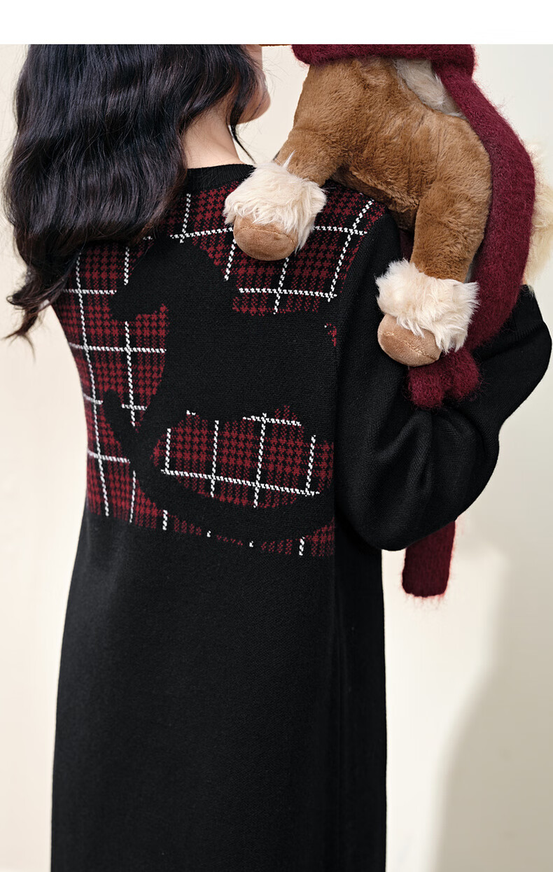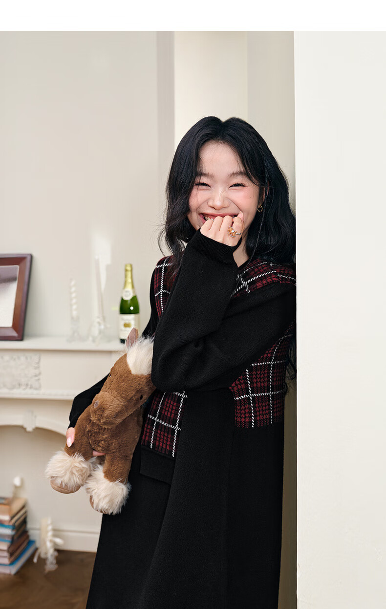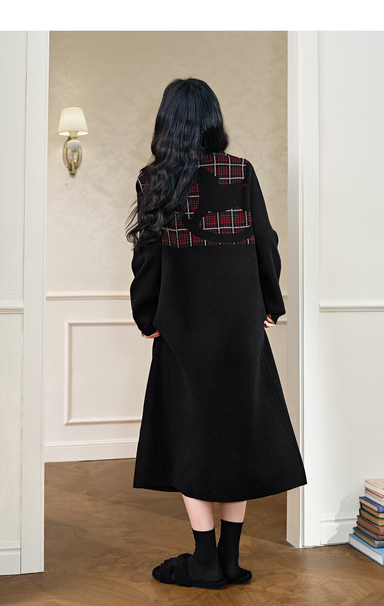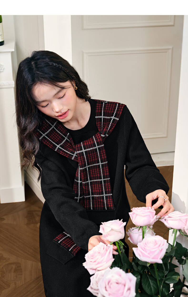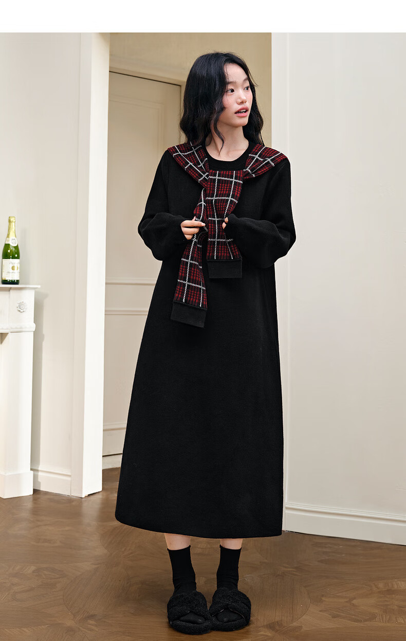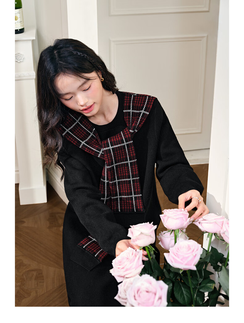 阔色圣诞拼接格纹披肩毛衣裙女2025秋冬季新款黑色针织连衣裙长裙 黑色 M