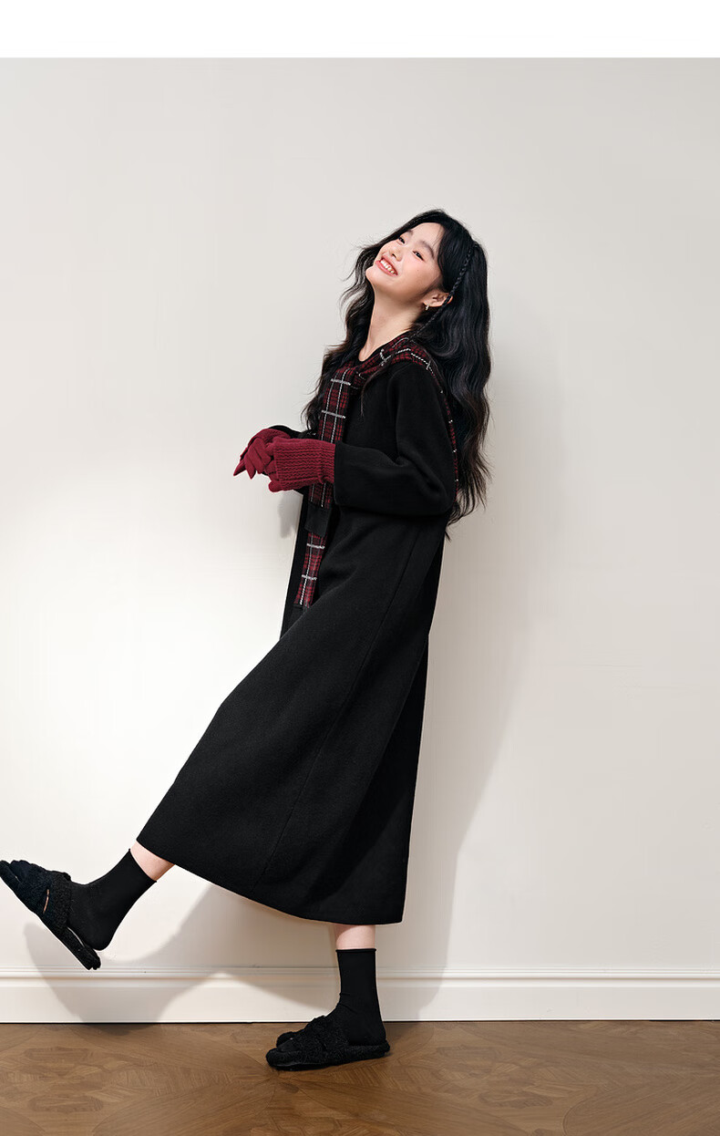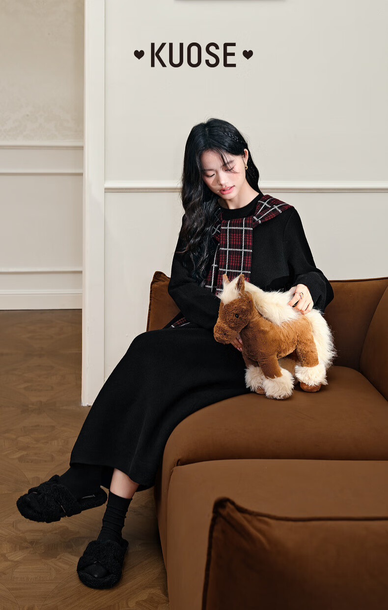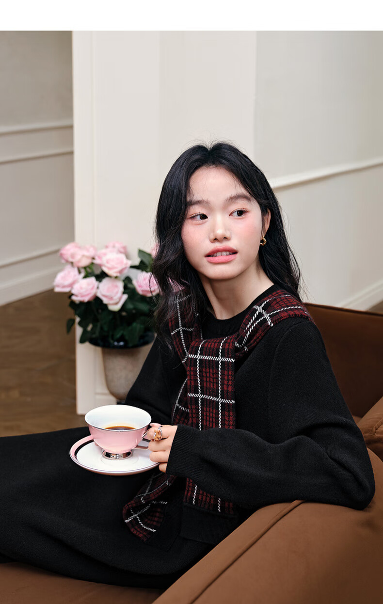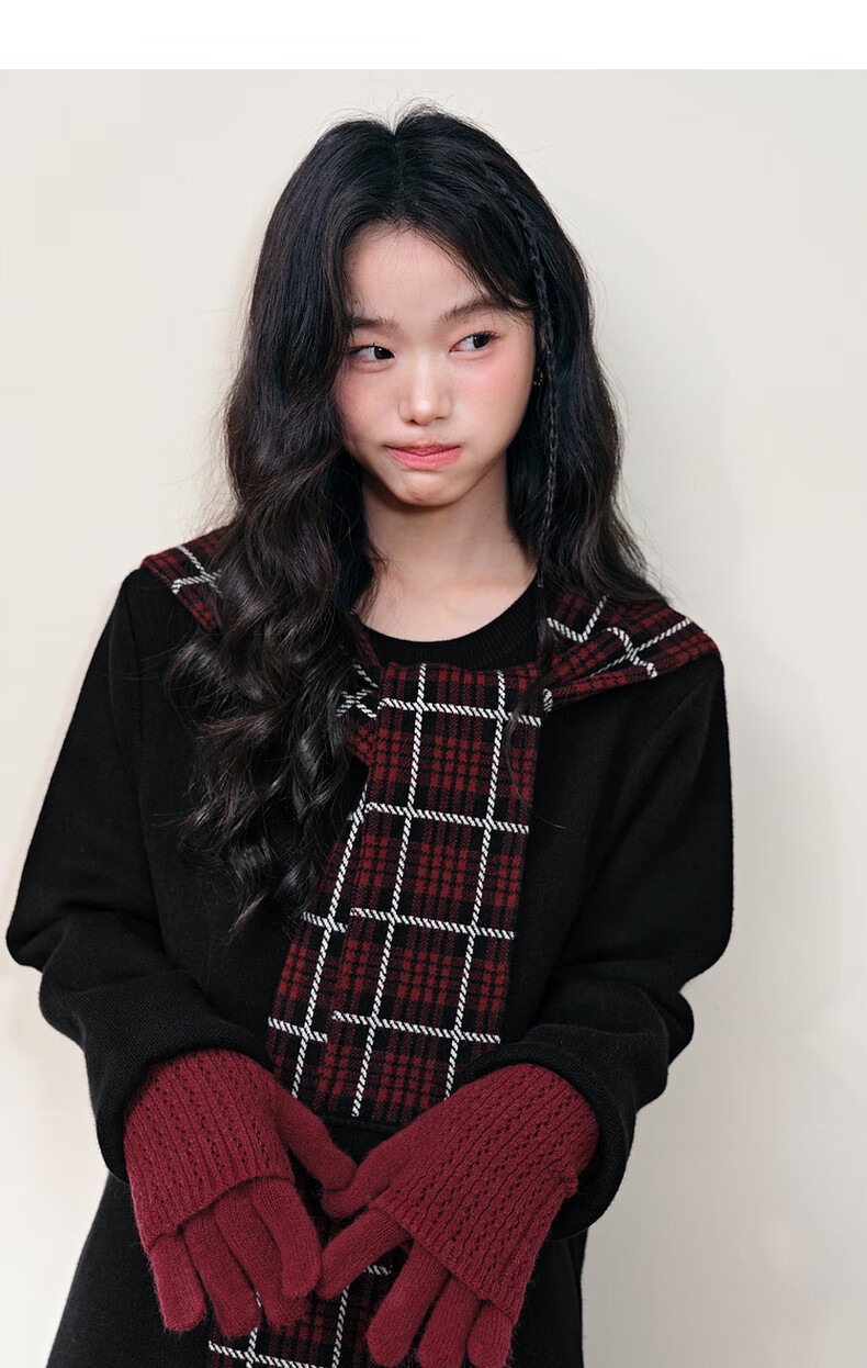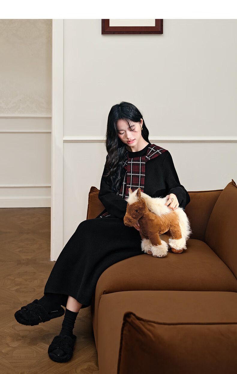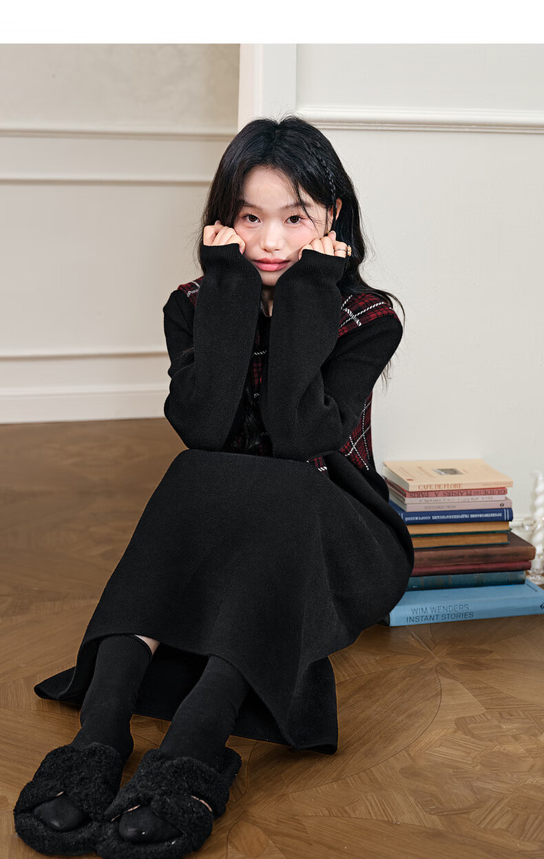 阔色圣诞拼接格纹披肩毛衣裙女2025秋冬季新款黑色针织连衣裙长裙 黑色 M