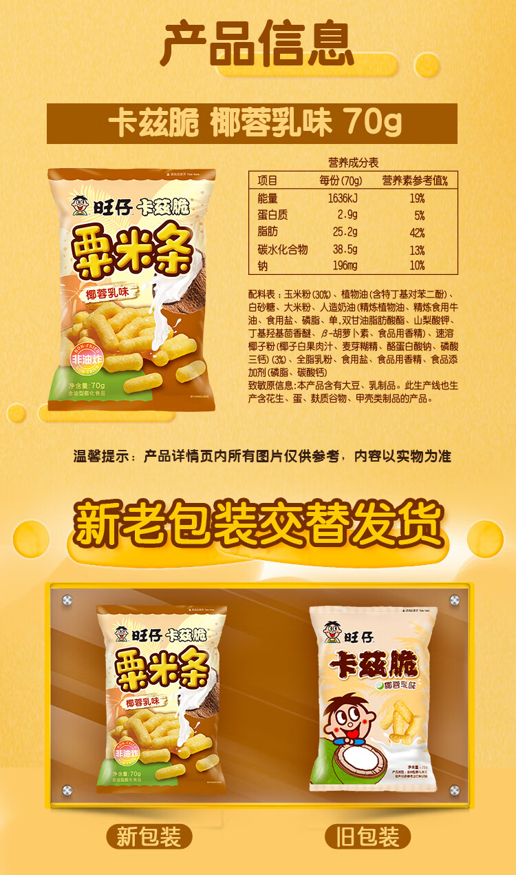 旺旺 旺仔卡兹脆 椰蓉乳味 70g 零食膨化休闲食品饼干糕点