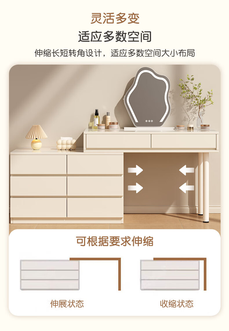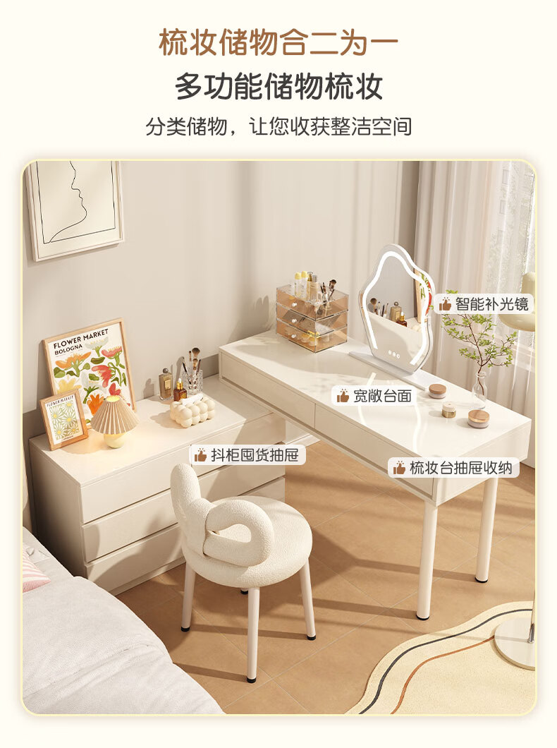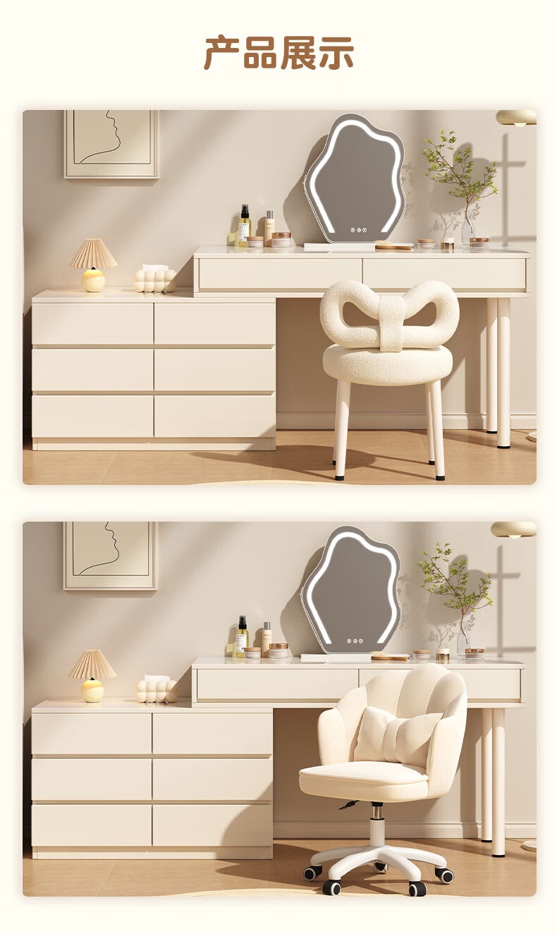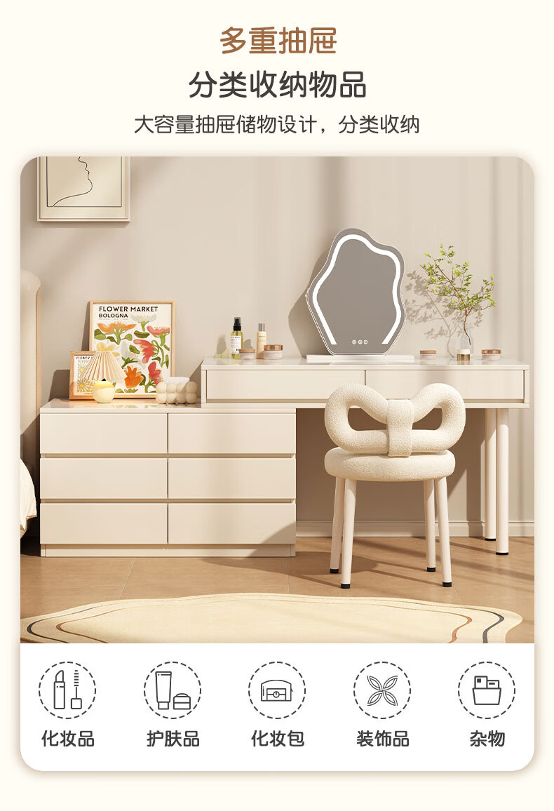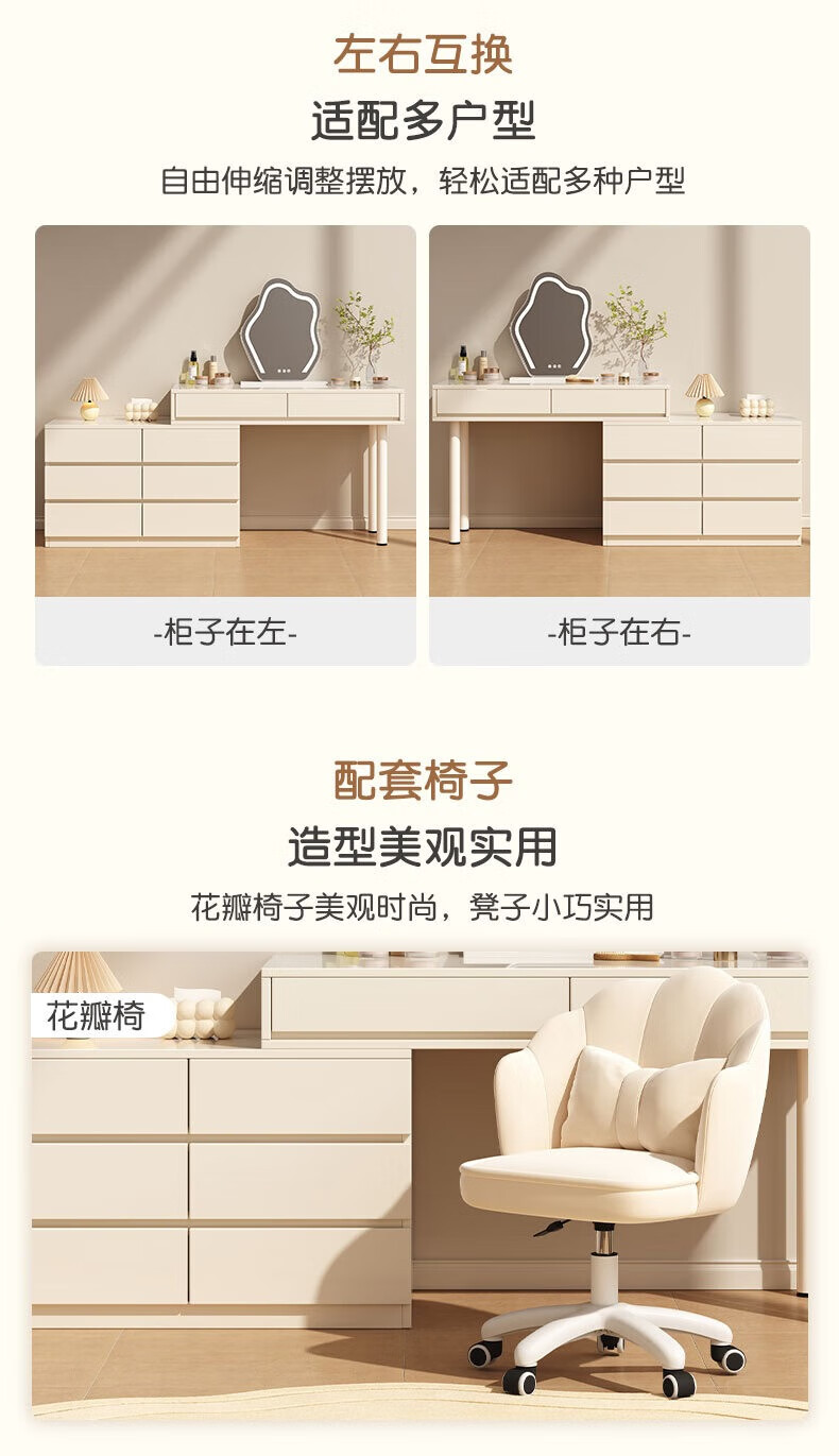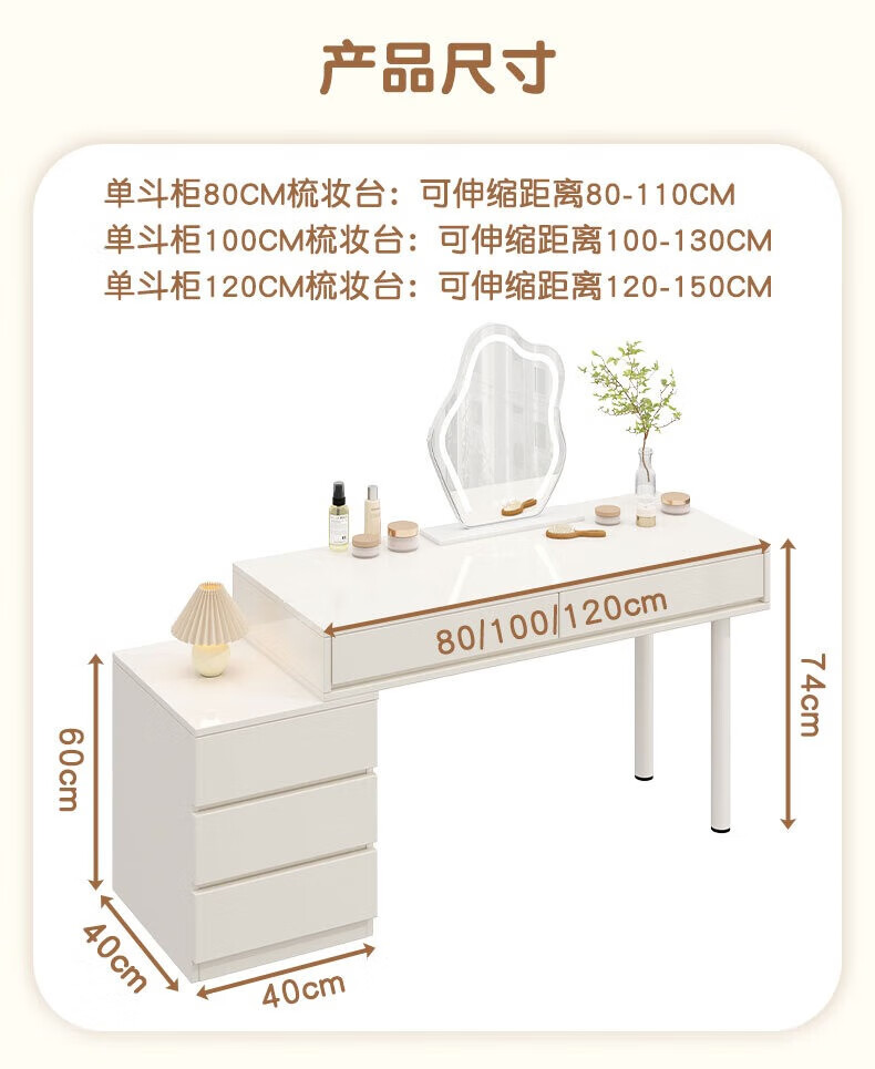 富禾实木梳妆台床头化妆桌斗柜一体可伸缩卧室小户型奶油风化妆台桌子 补贴【三抽边柜+云朵镜】80cm桌 【15mm实木板芯】自行组装