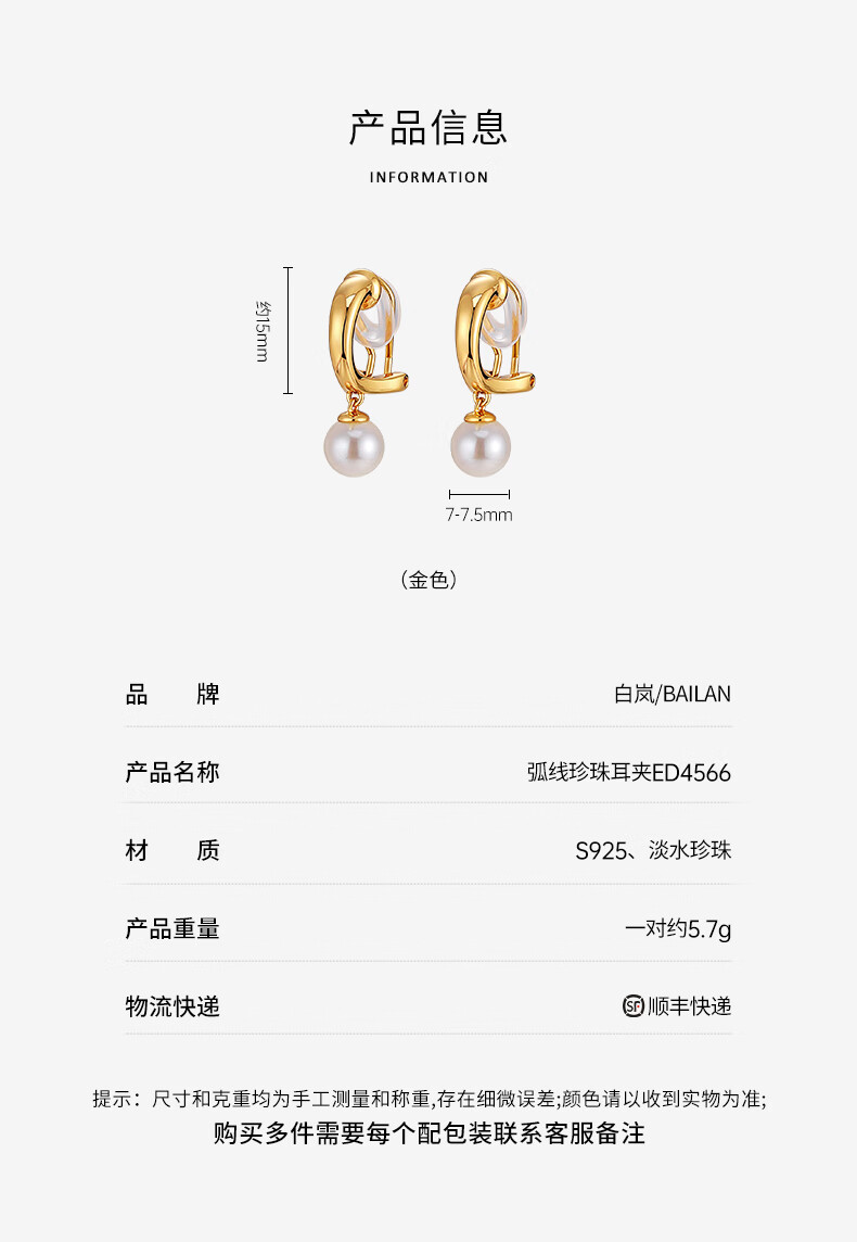 白岚弧线珍珠耳夹无耳洞耳饰女配饰新款轻奢时尚气质新年礼物送老婆 弧线珍珠耳夹