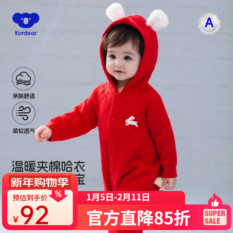 Kordear婴儿冬装夹棉连体衣红色连帽哈衣宝宝新年衣服拜冬年服 红色 90cm