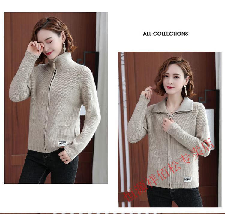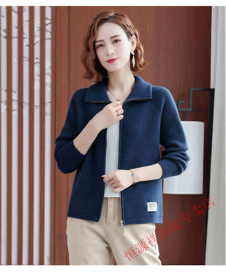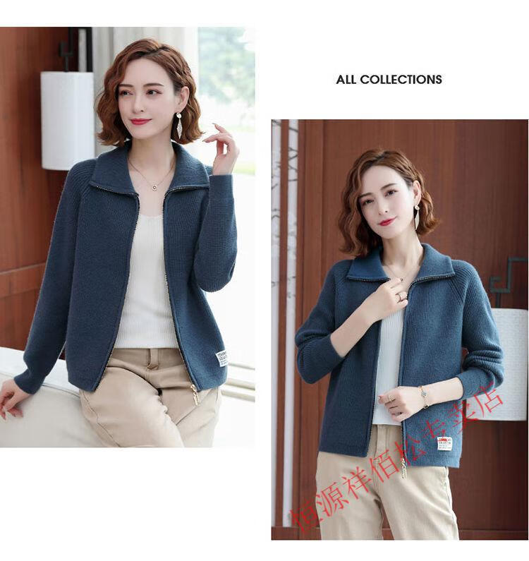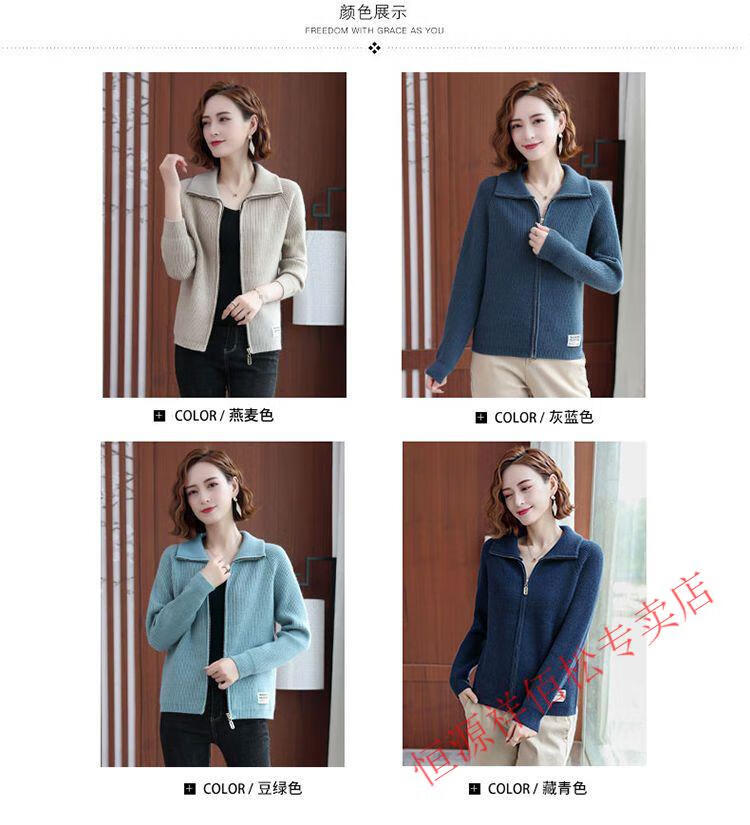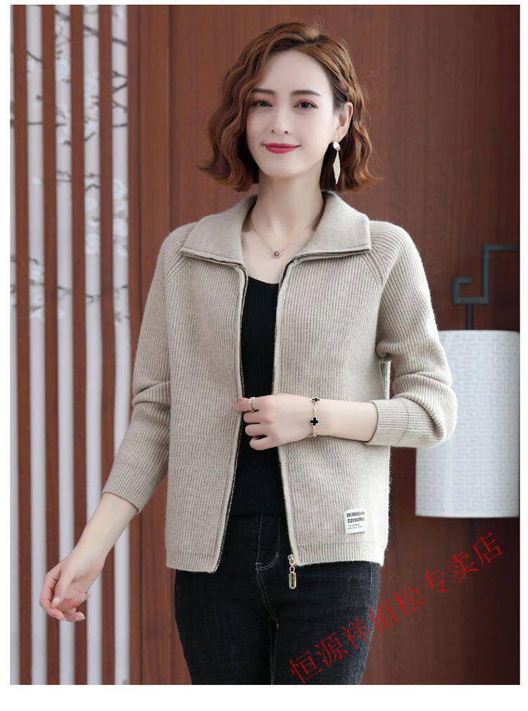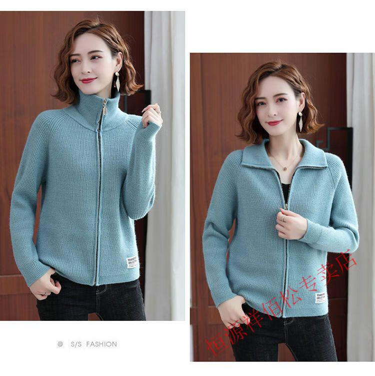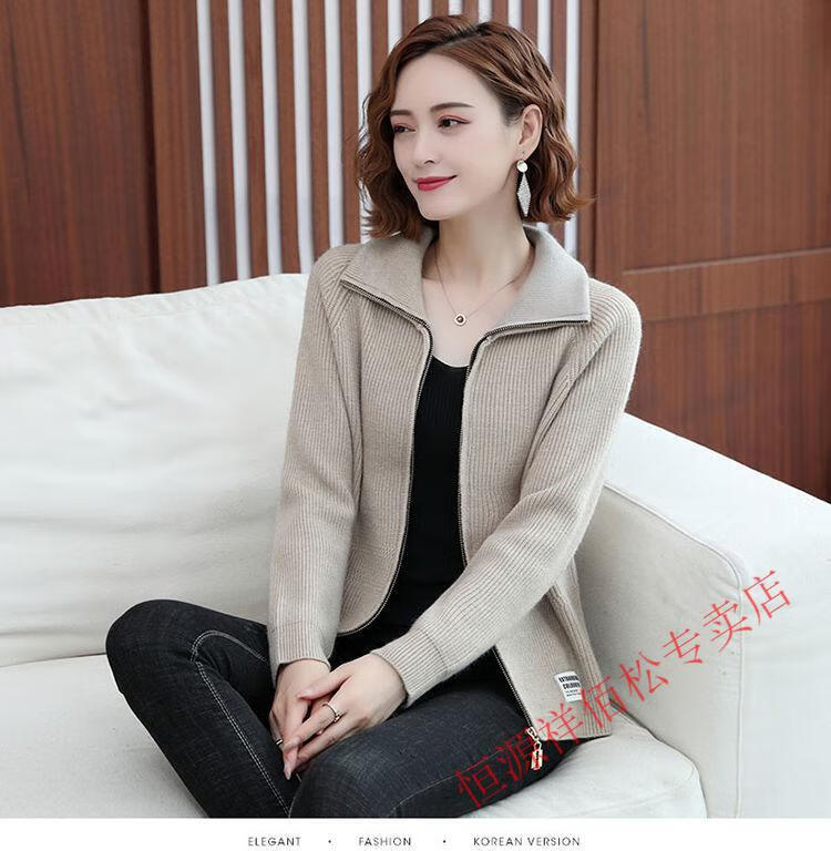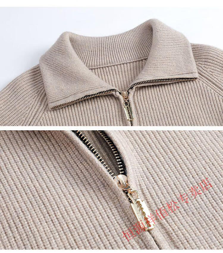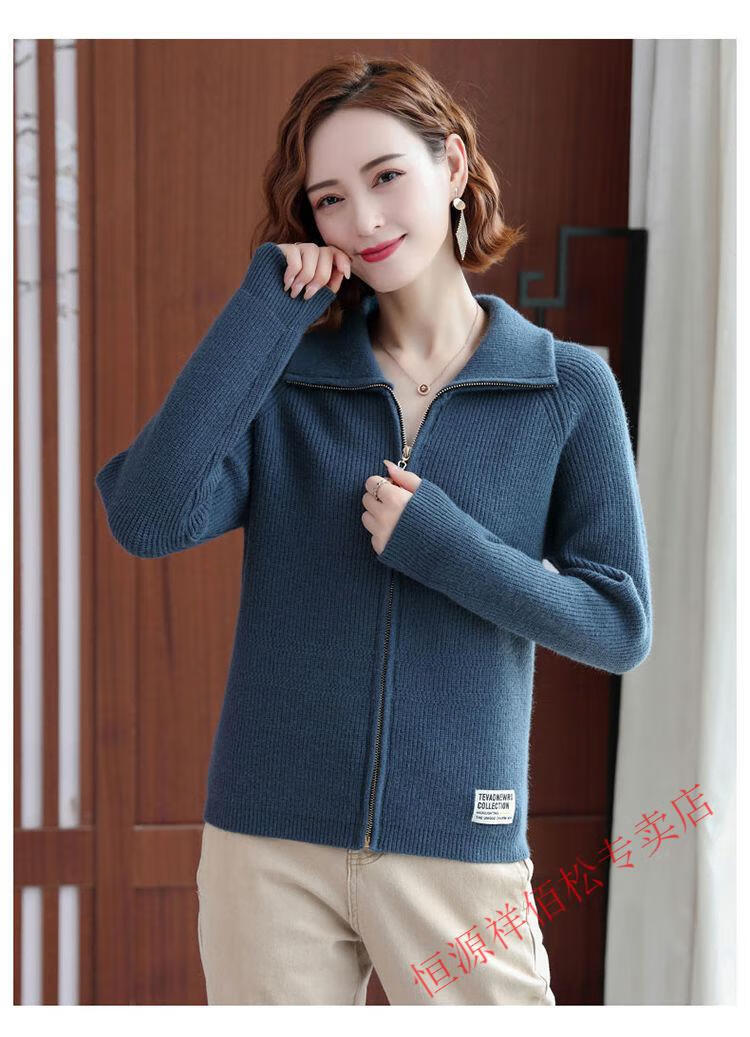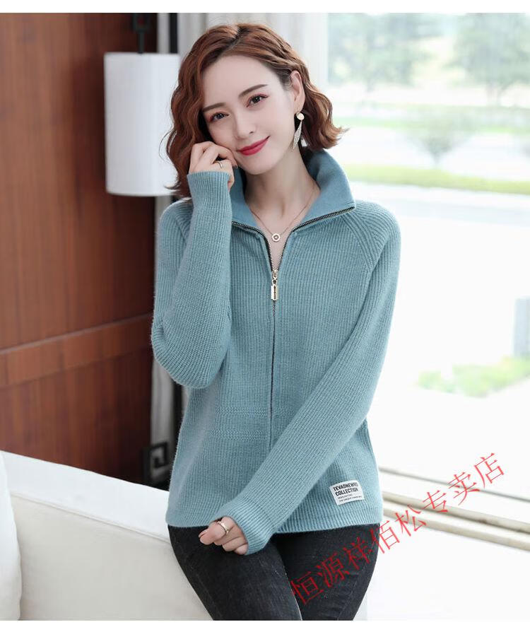 恒源祥品牌羊毛衫女加厚针织开衫秋冬新款拉链翻领纯色羊绒毛衣外套 豆绿色-不起球 2XL 适合130-140斤