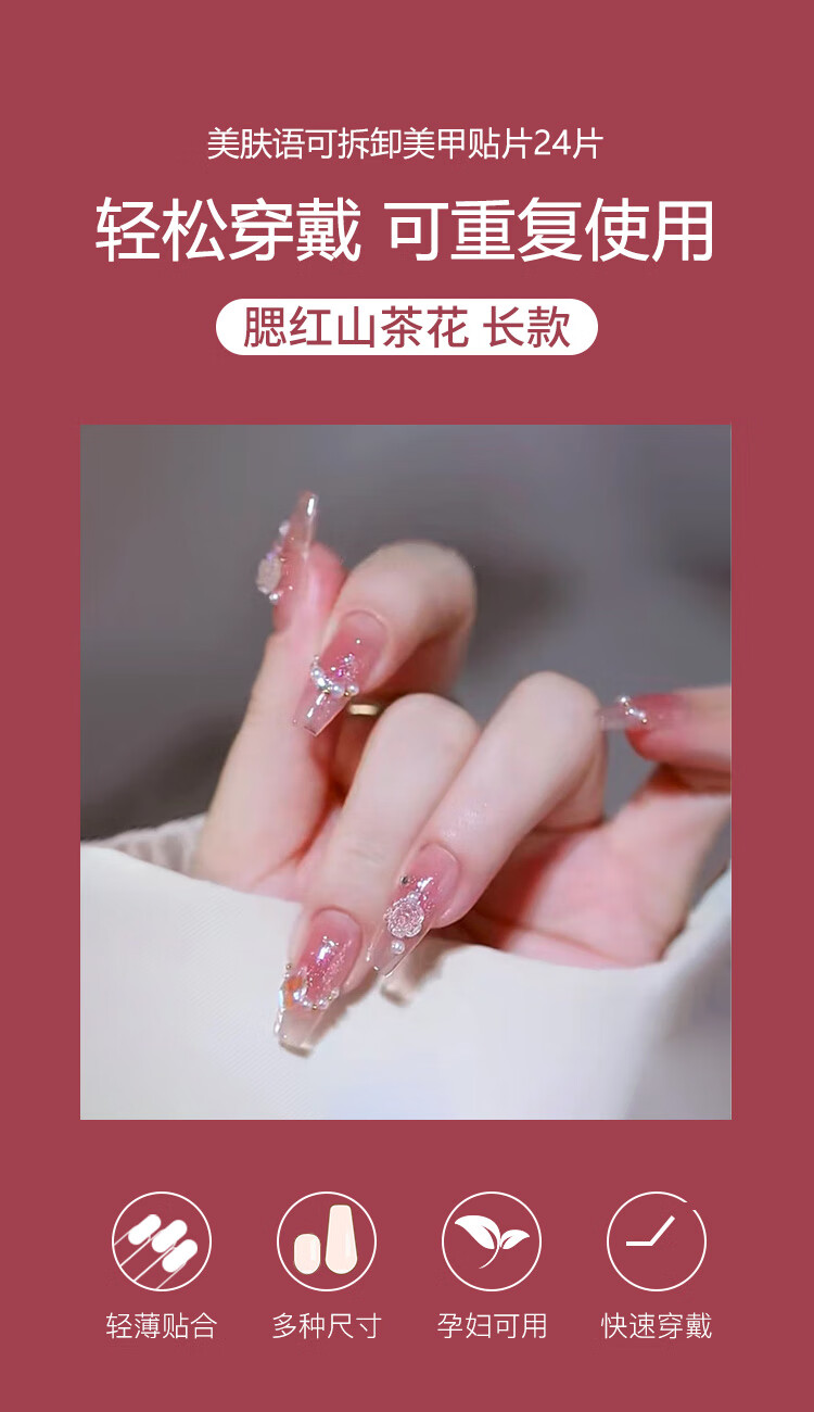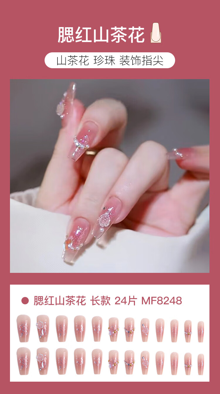 美肤语美甲贴片穿戴甲(腮红山茶花)长款假指甲果冻胶可拆带工具MF8248