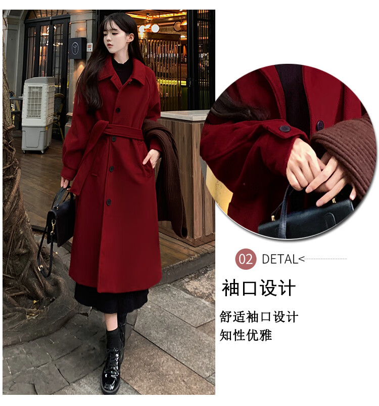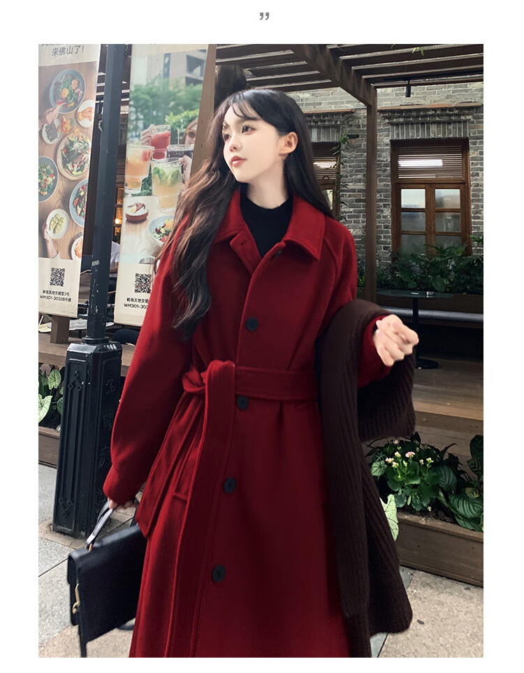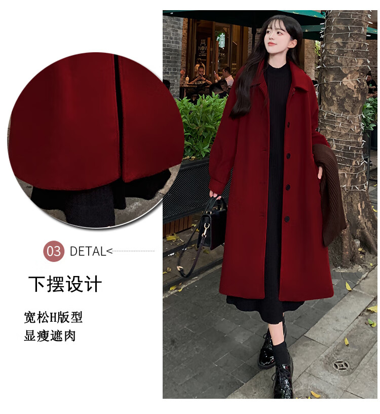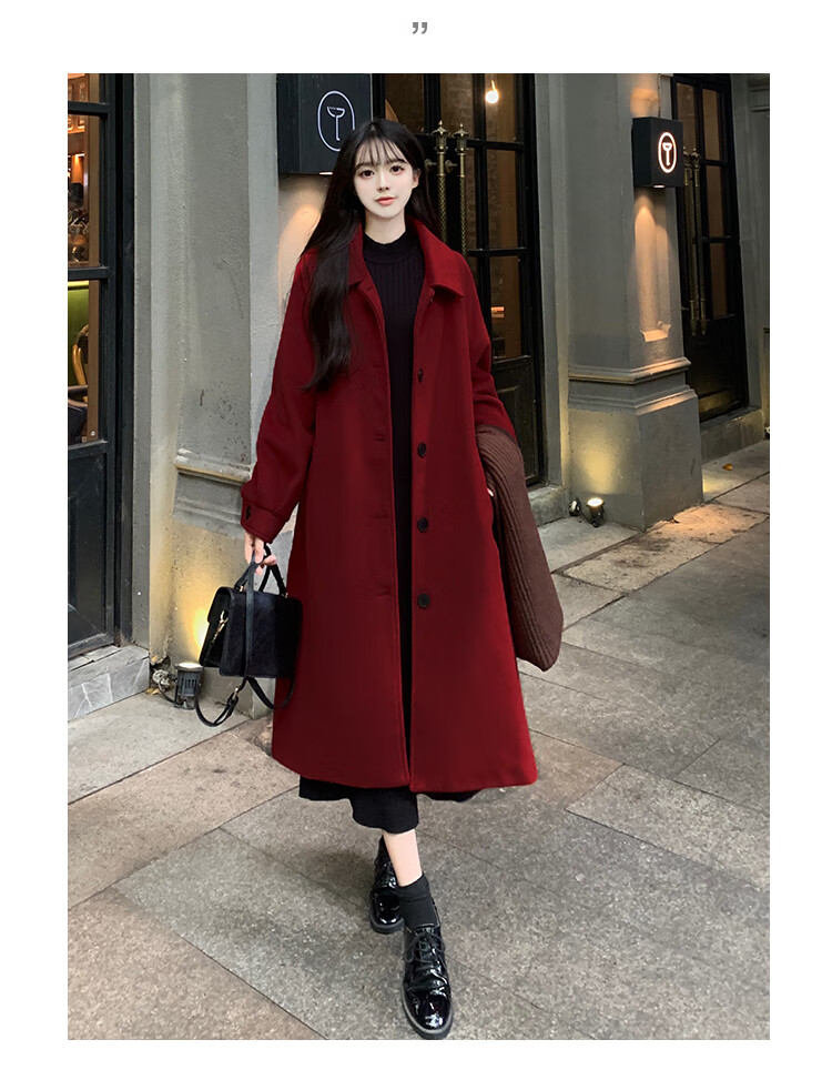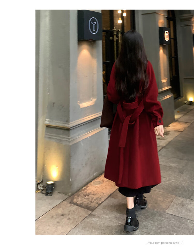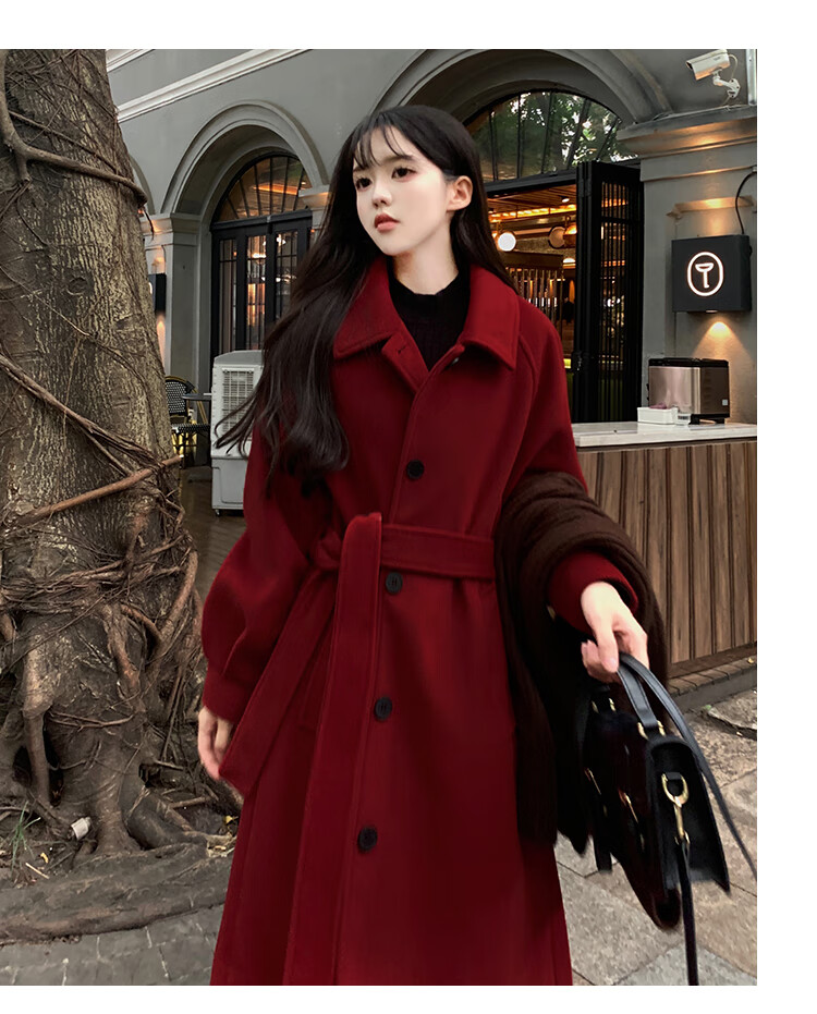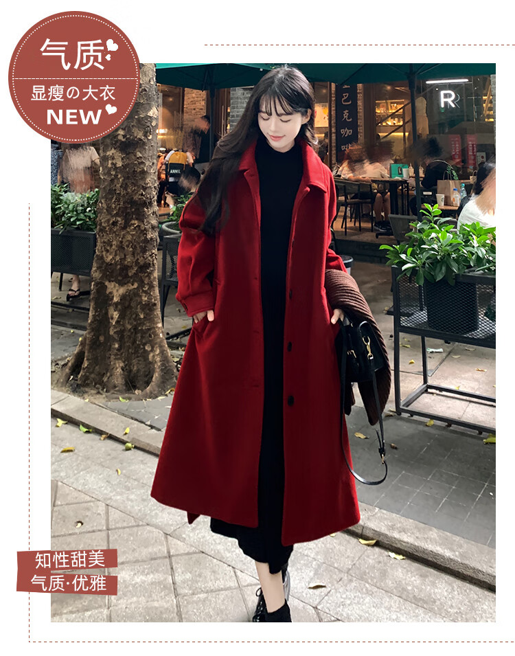啄木鸟秋冬红色双面仿羊绒大衣女中长款加厚毛呢外套宽松过膝呢子大衣 酒红色 M 【90-120斤】