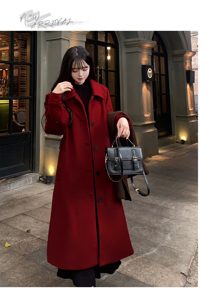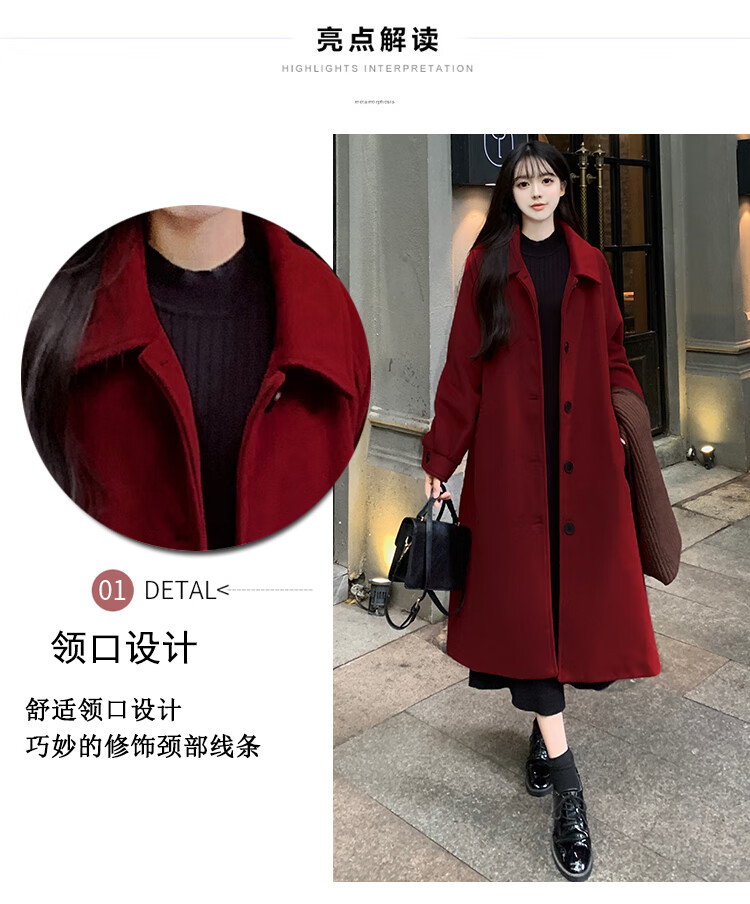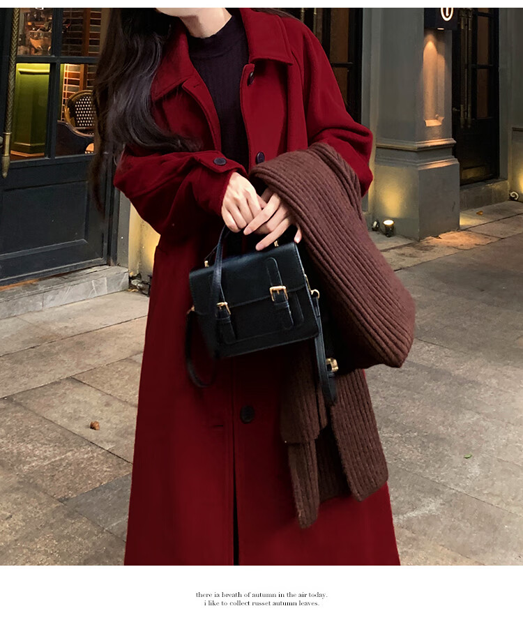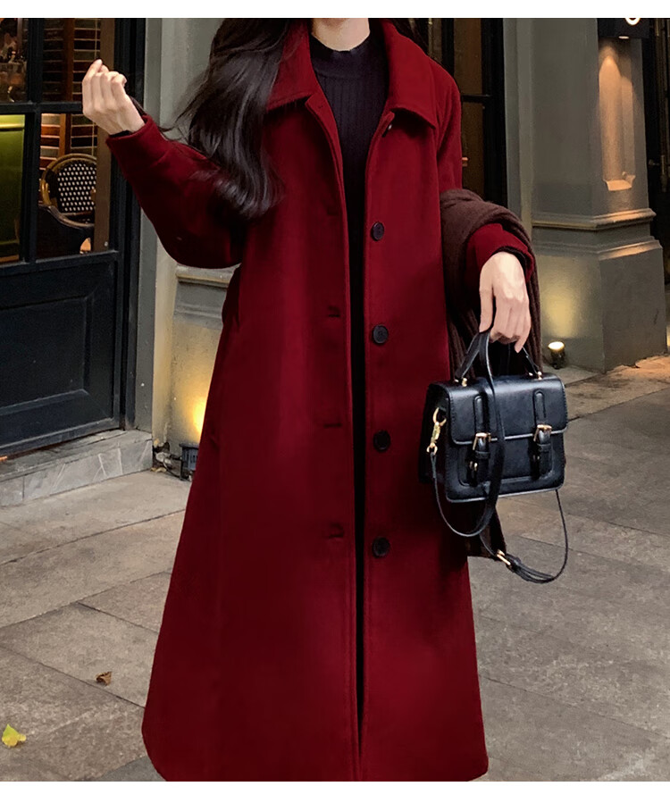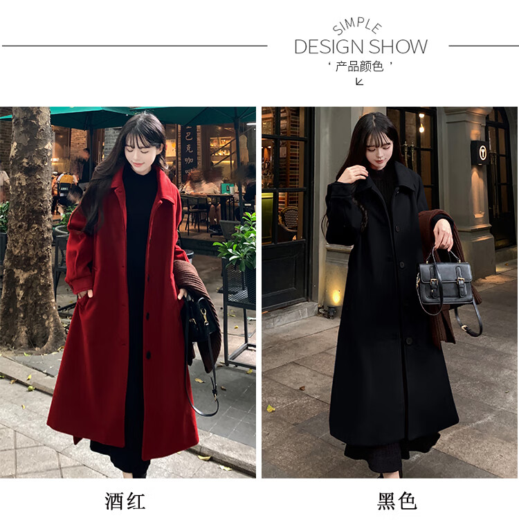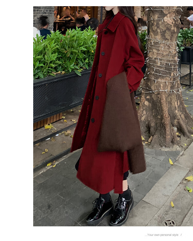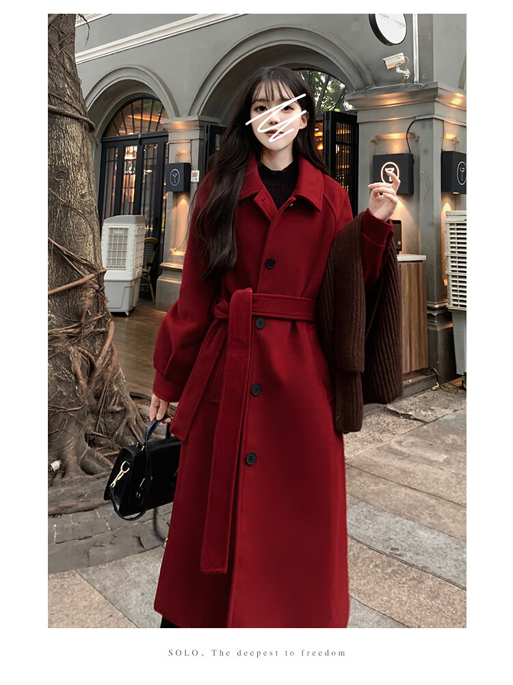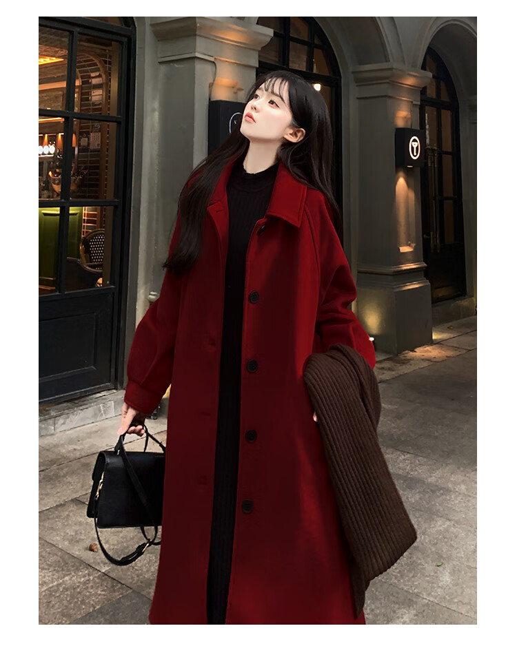 啄木鸟秋冬红色双面仿羊绒大衣女中长款加厚毛呢外套宽松过膝呢子大衣 酒红色 M 【90-120斤】