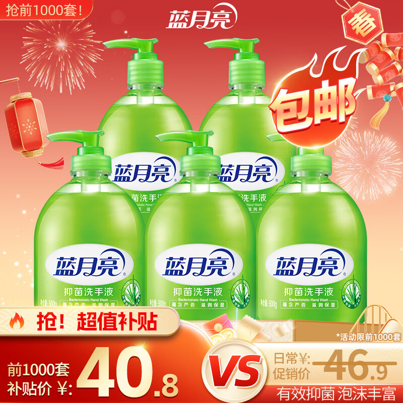 蓝月亮洗手液泡沫丰富滋润保湿芦荟健康抑菌99.9%500g*3瓶+300g*2瓶