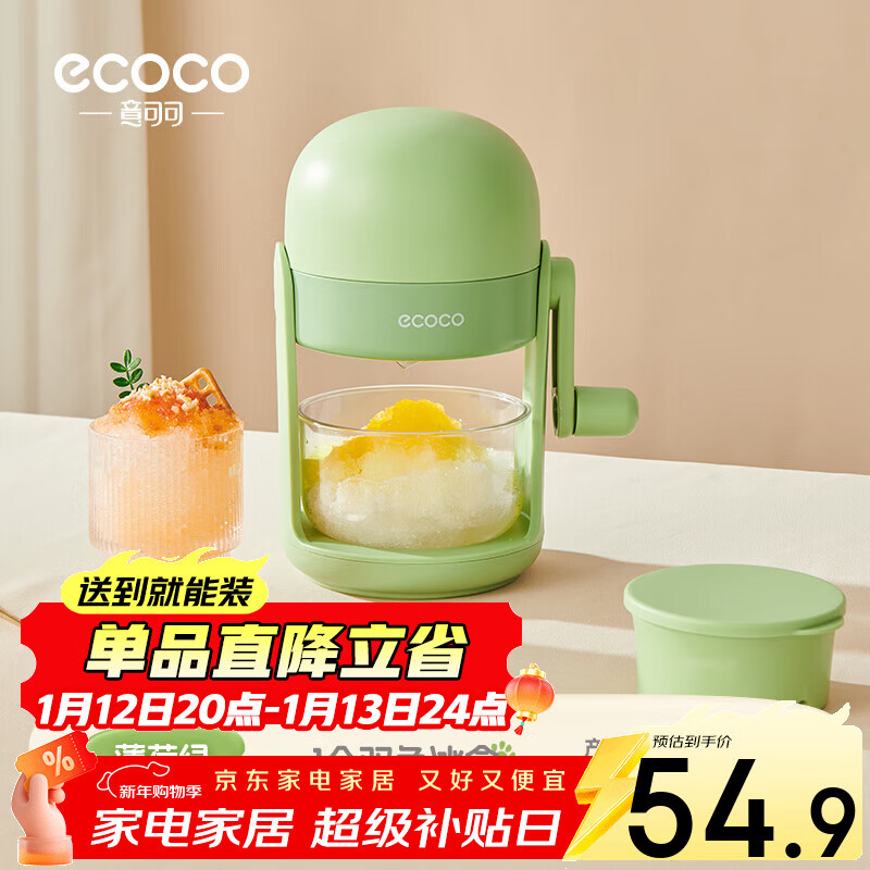 ecoco刨冰机家用摆摊不插电绵绵冰小型雹冰机手摇碎冰机 E25032绿