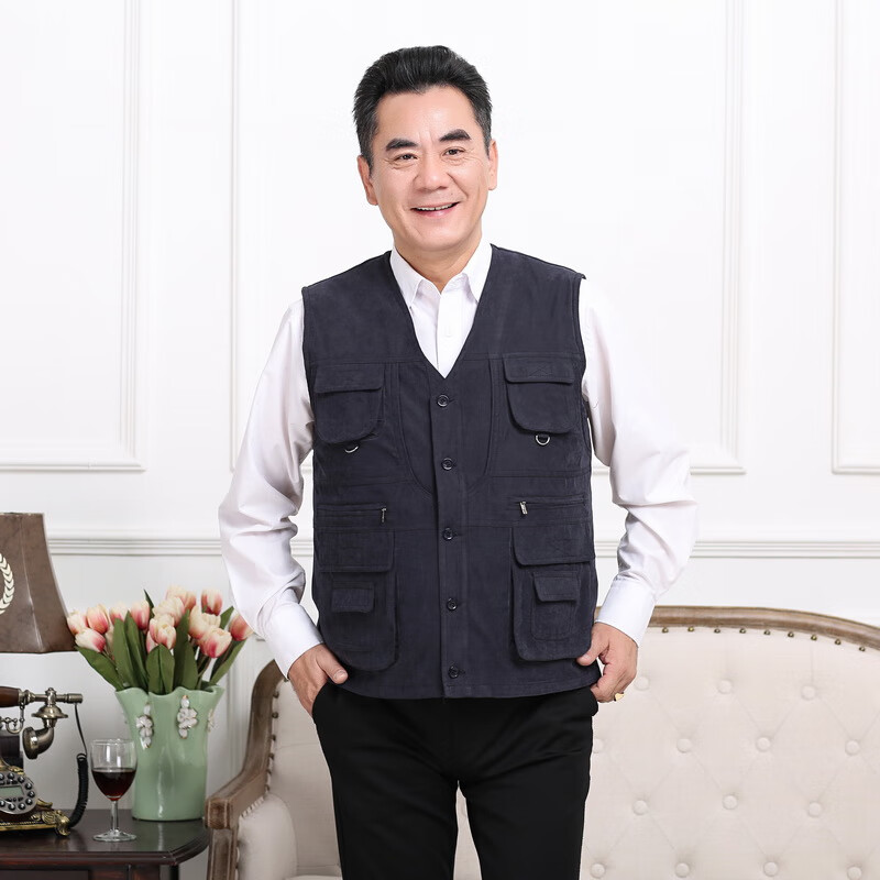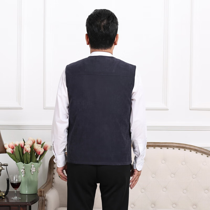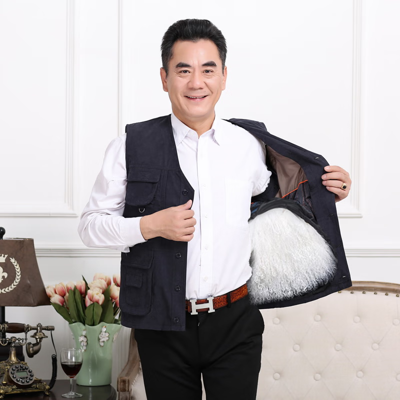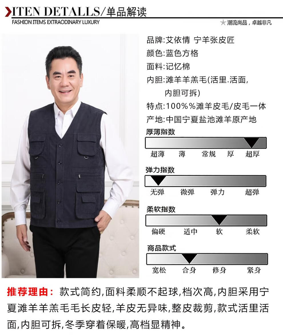 中老年男羊羔毛马甲宁夏滩羊毛马夹皮毛一体坎肩冬季抗寒保暖背心 黑蓝色 2XL