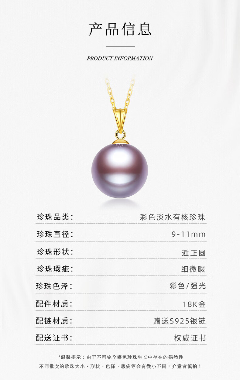 大溪地彩色爱迪生珍珠吊坠 11-12mm18K金淡水珍珠项链新年礼物送女生