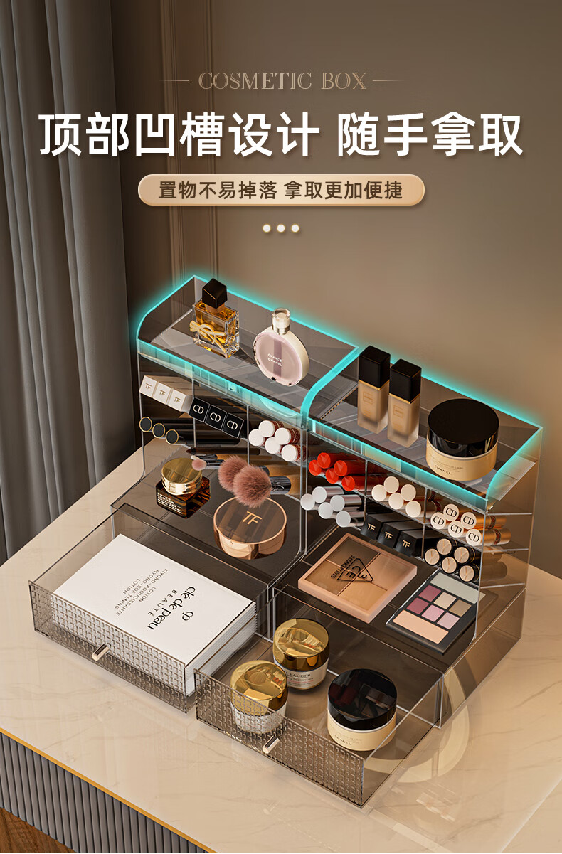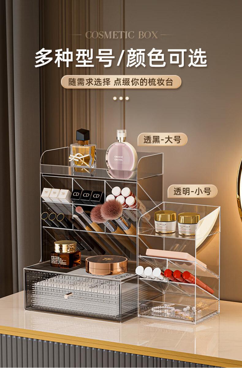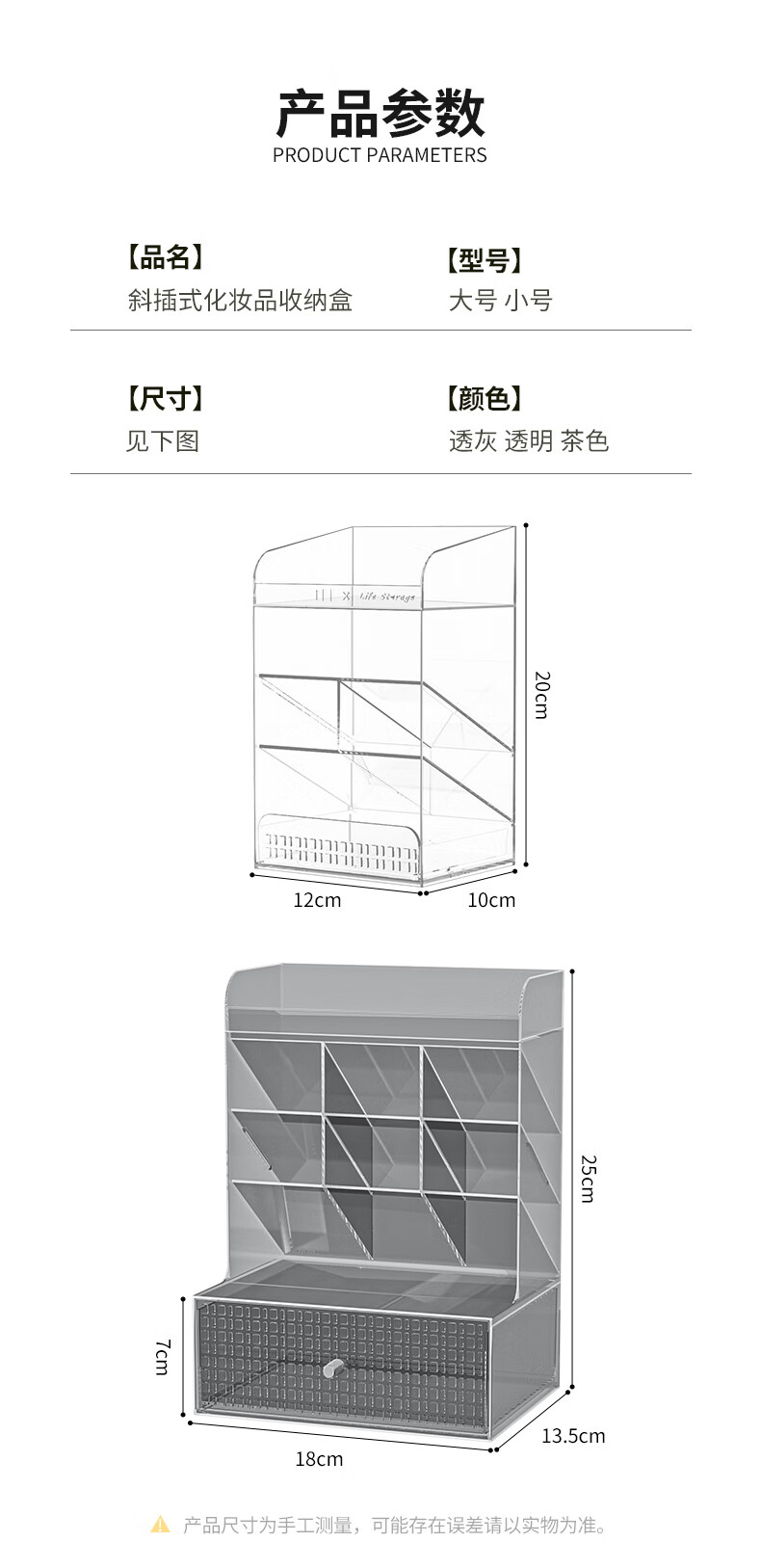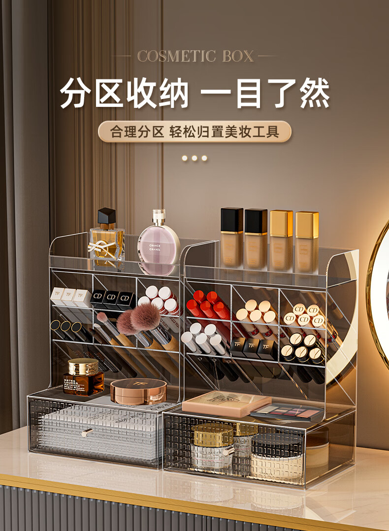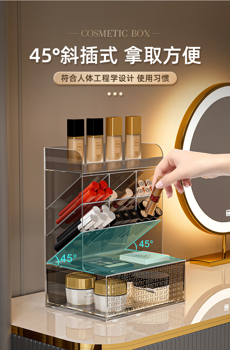 KAMAN斜插式化妆品收纳盒高级感大容量抽屉式整理盒梳妆台口红置物架 小号【透茶】1个