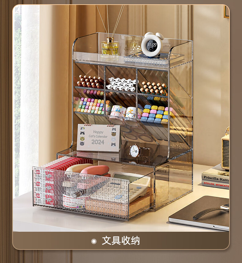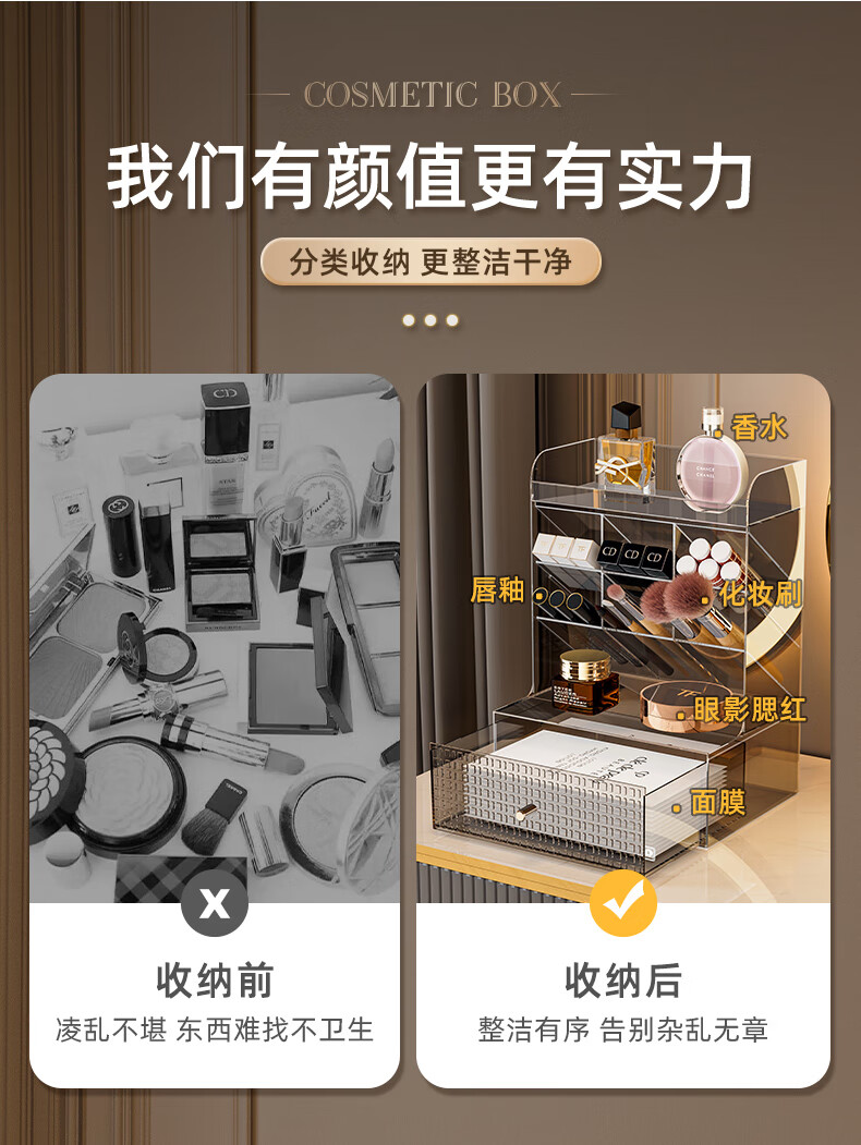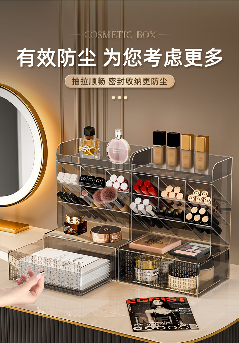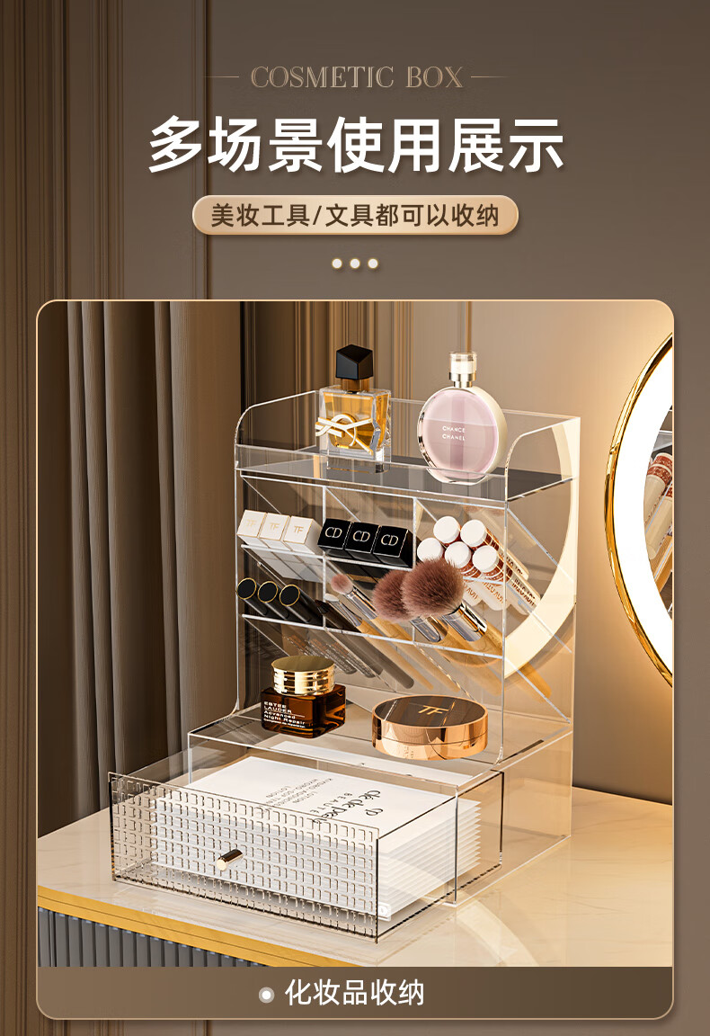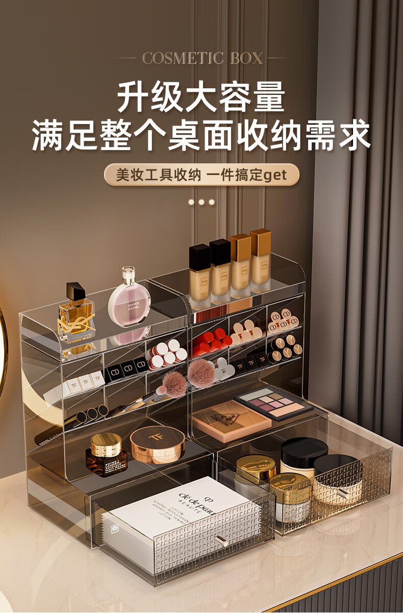 KAMAN斜插式化妆品收纳盒高级感大容量抽屉式整理盒梳妆台口红置物架 小号【透茶】1个