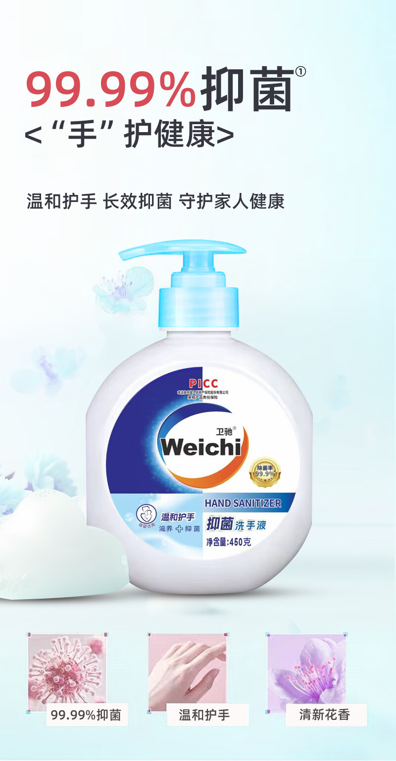【爆品推荐】卫驰抑菌洗手液倍护滋润泡沫细腻温和清洁母可用按压 450克*1瓶+1按压泵头【体验装】