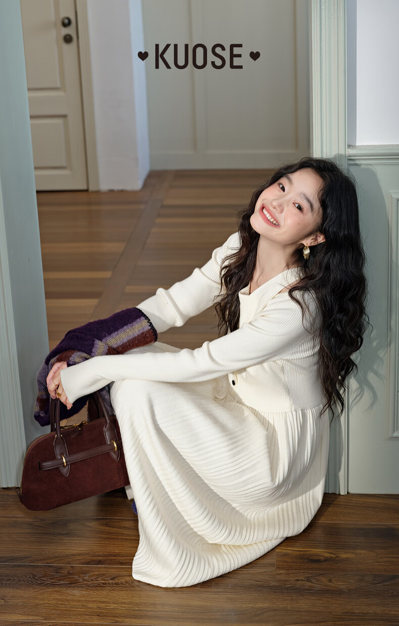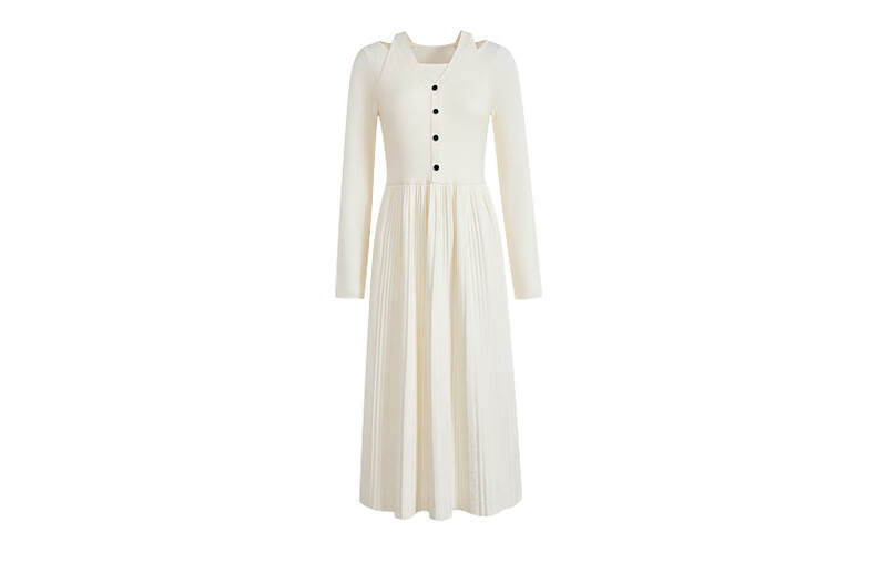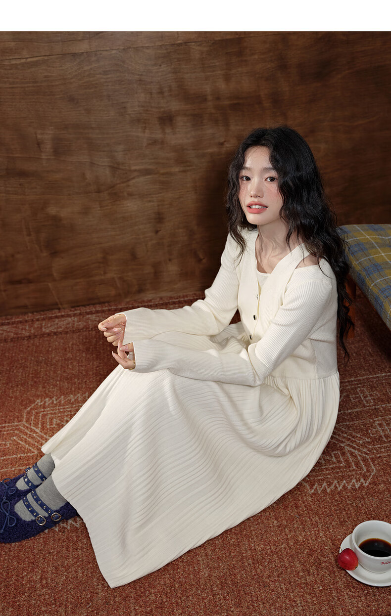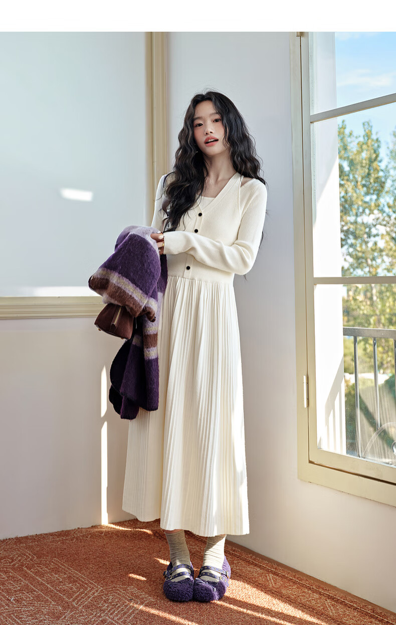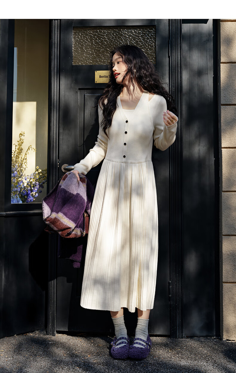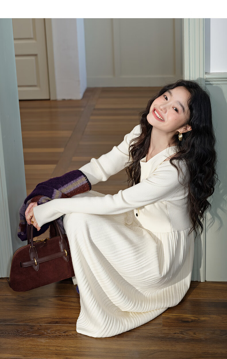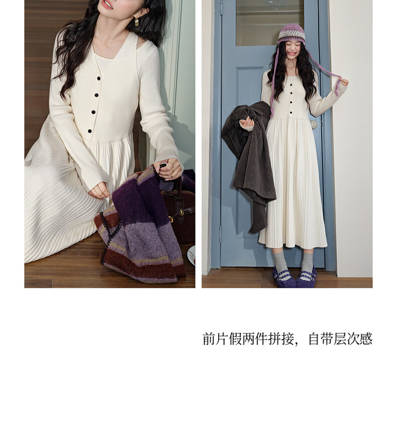 阔色气质挂脖假两件长袖连衣裙内搭裙25秋冬季新款女毛衣裙长裙子 杏色 S