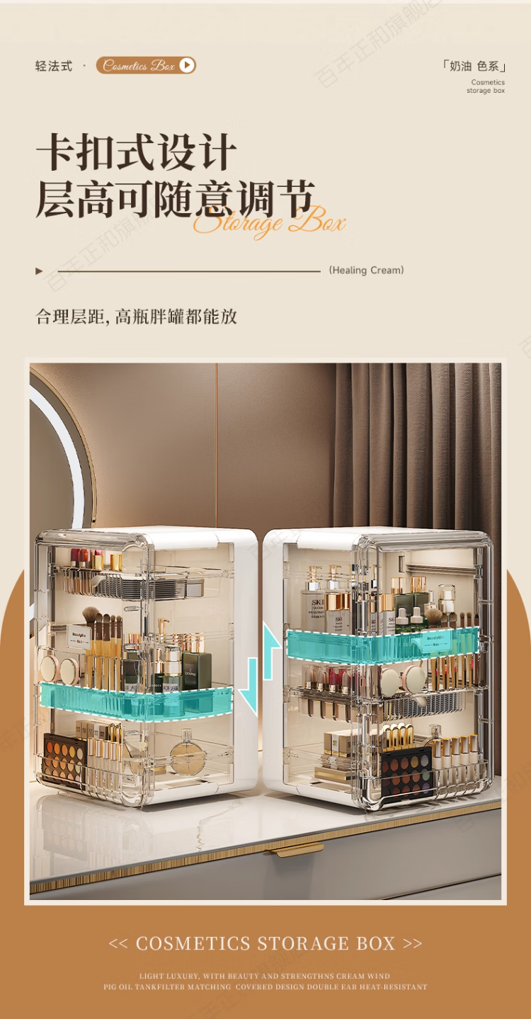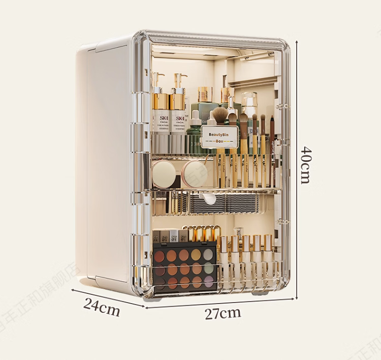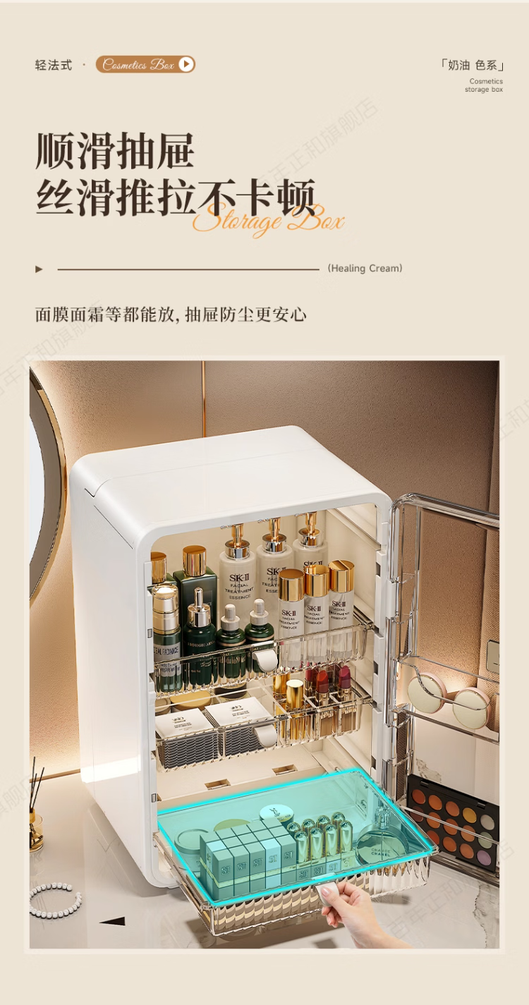 新年礼物 高级感化妆品收纳盒透明桌面护肤品口红置物架梳妆台 奶油色【加大容量】 27*24*40cm