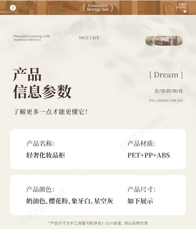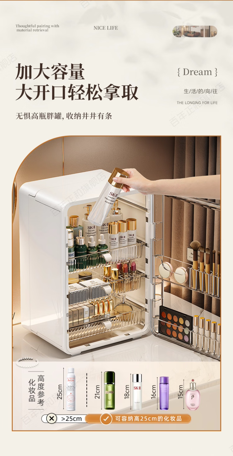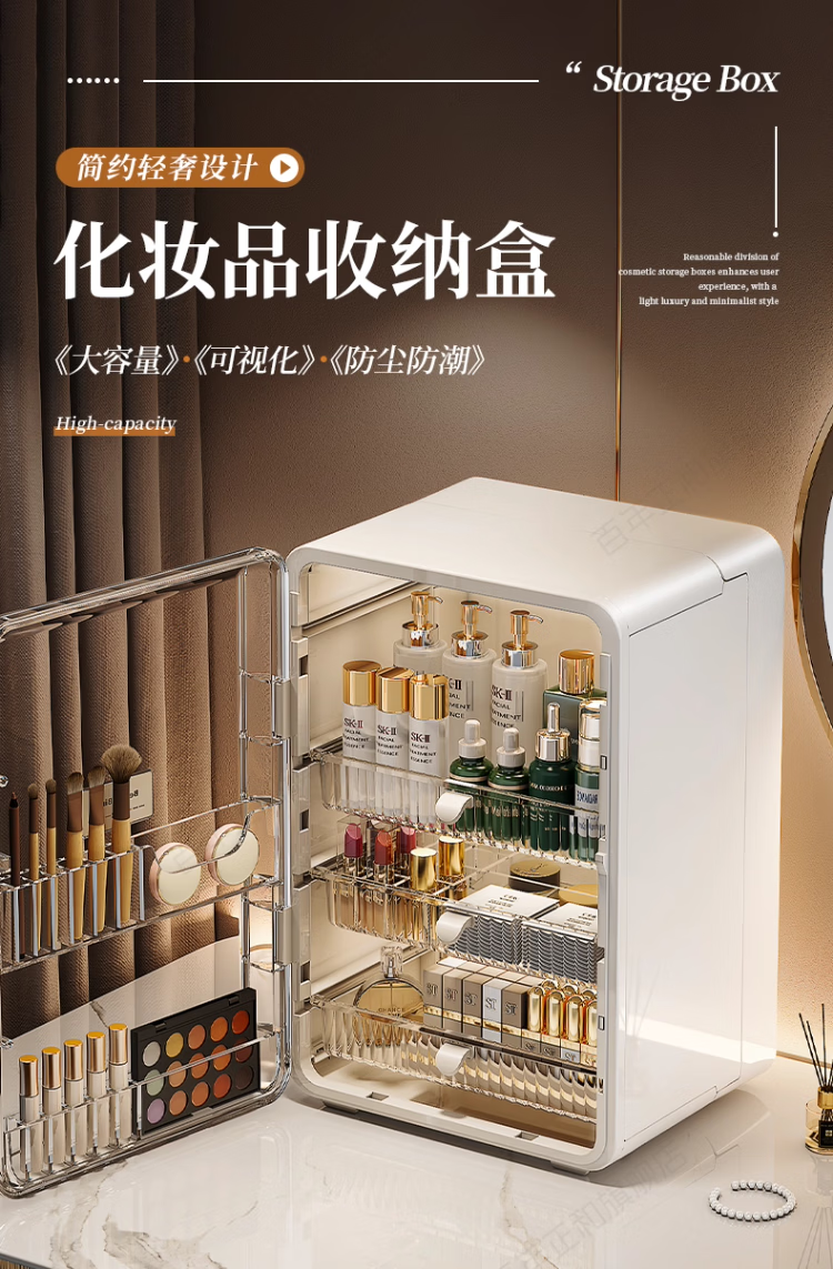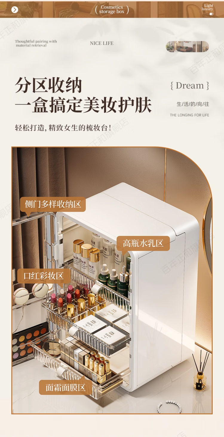 新年礼物 高级感化妆品收纳盒透明桌面护肤品口红置物架梳妆台 奶油色【加大容量】 27*24*40cm