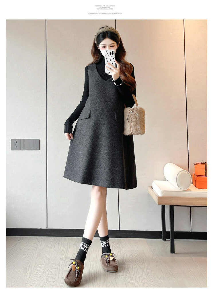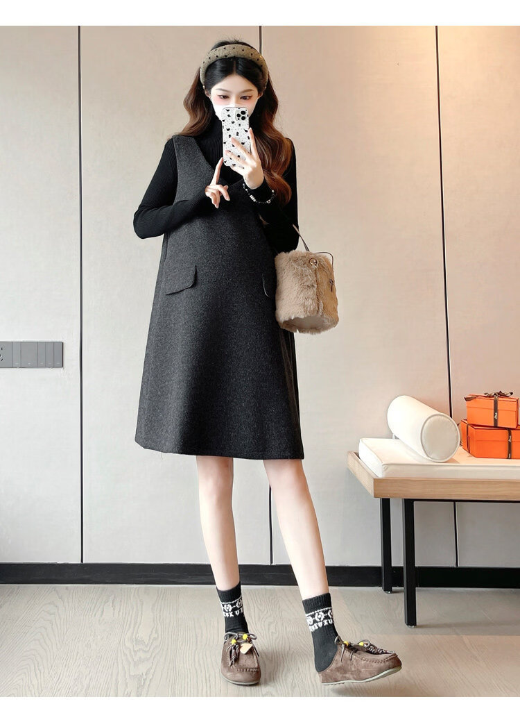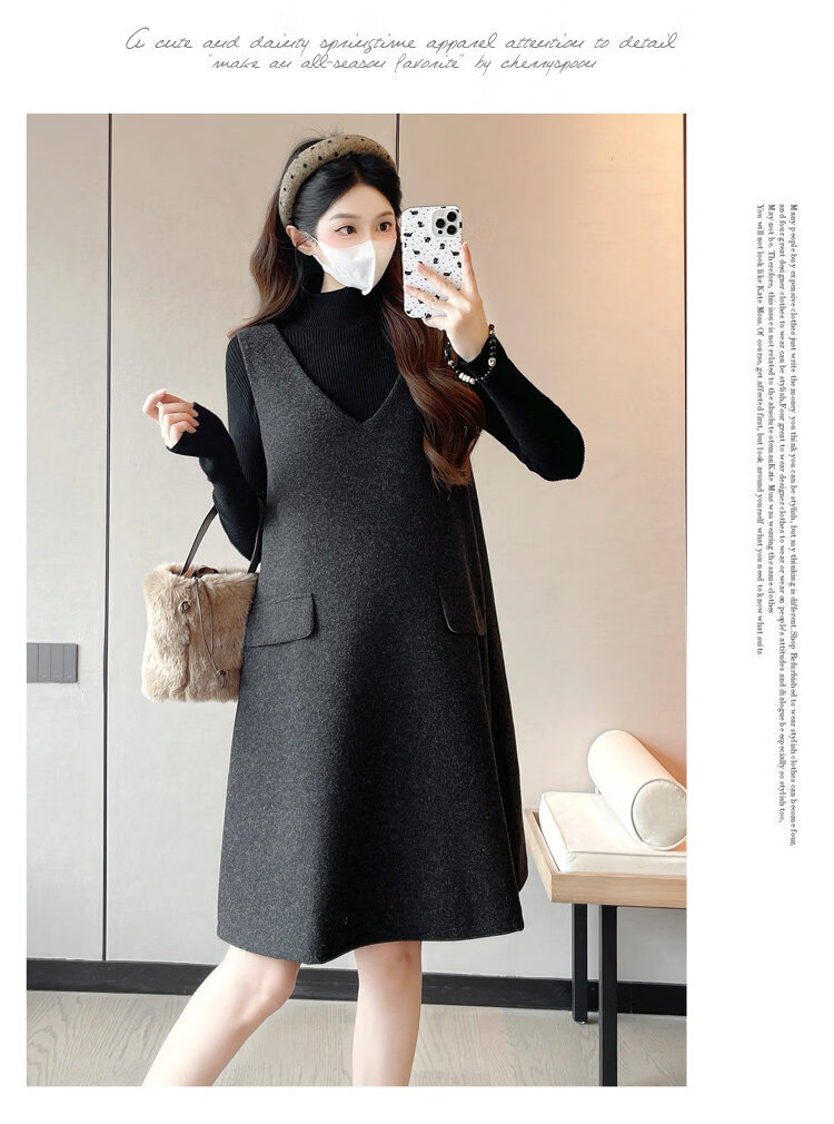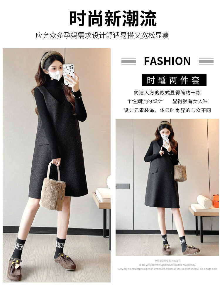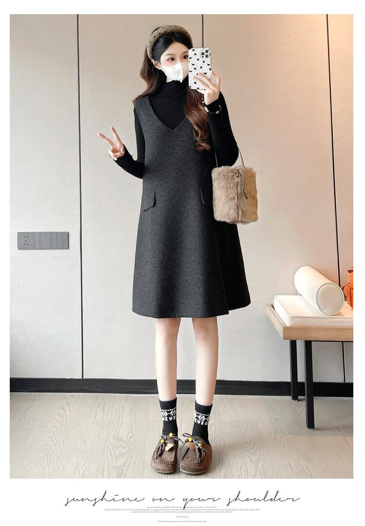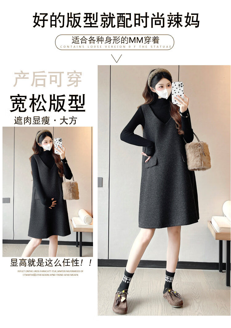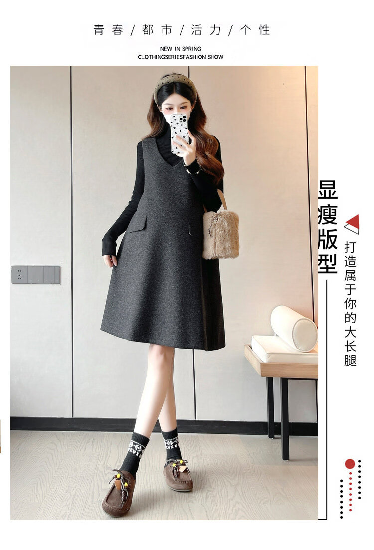 Fickan孕妇冬装套装连衣裙孕妈穿搭洋气宽松外出秋冬毛呢裙怀孕穿的 深灰色背心裙 M