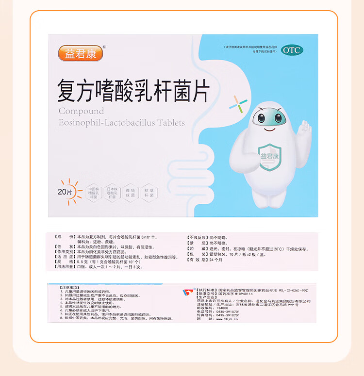 益君康 复方嗜酸乳杆菌片 0.5g*20片/盒 儿童益生菌活菌片 肠胃消化用药 便秘药 幽门螺旋杆菌四联用药