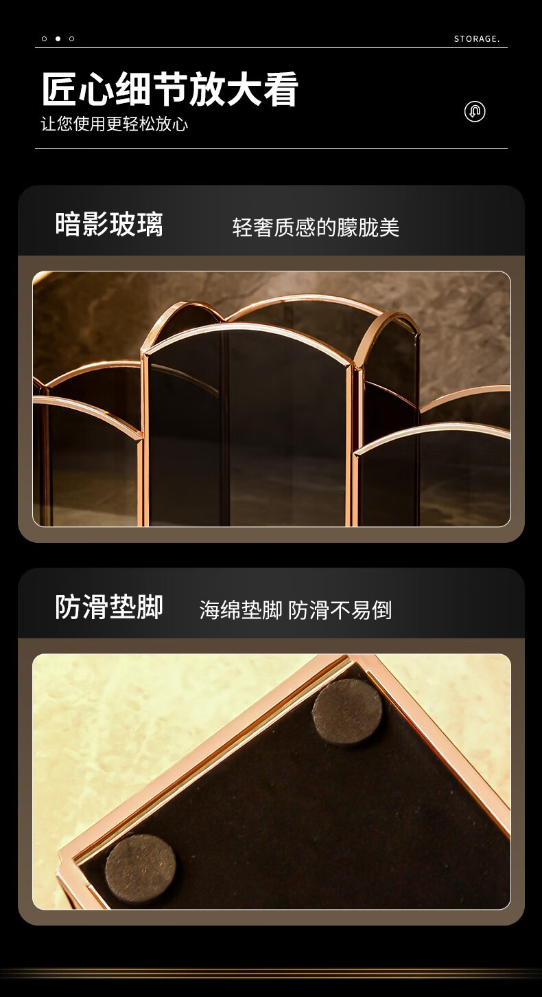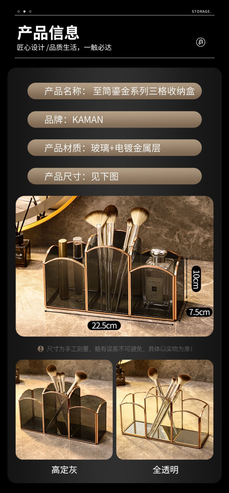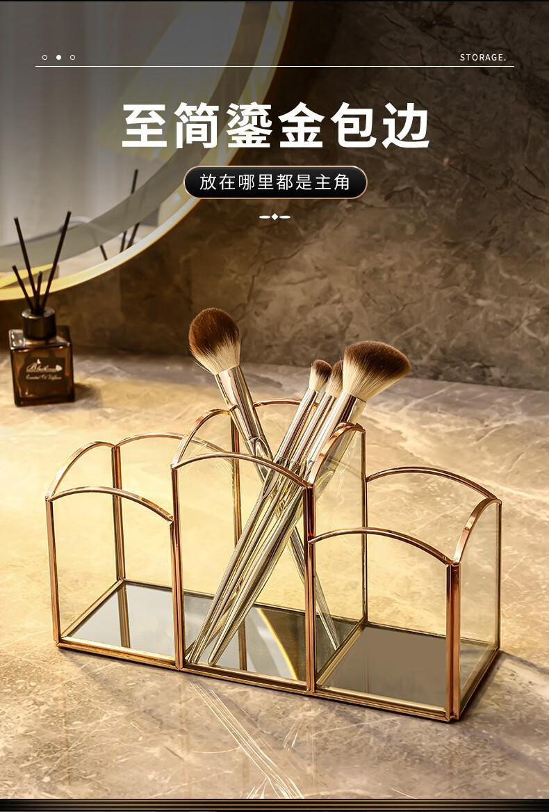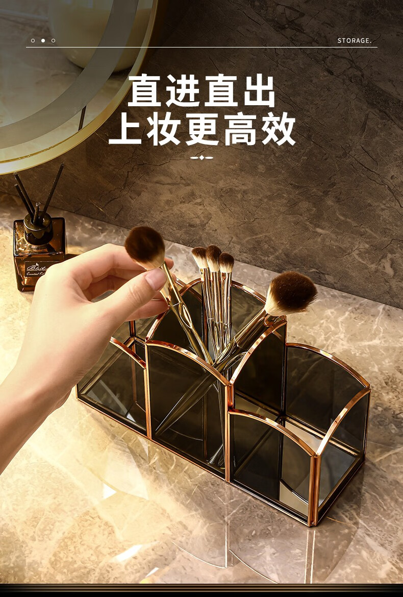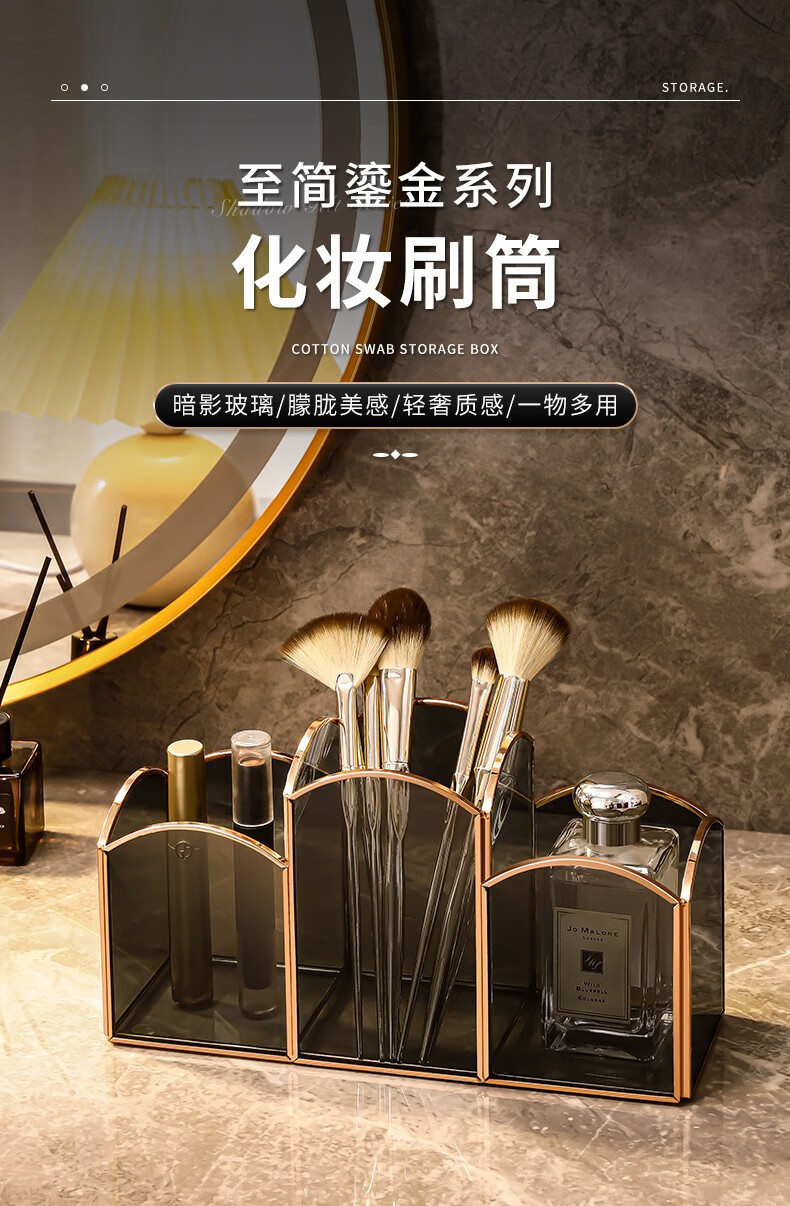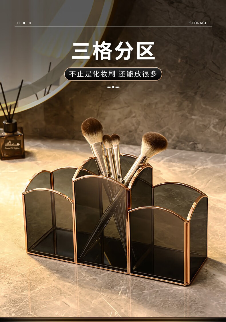 KAMAN 玻璃化妆刷收纳筒桌面分格眉笔口红盒美妆刷桶轻奢笔刷收纳盒 三格化妆刷筒【高定灰】