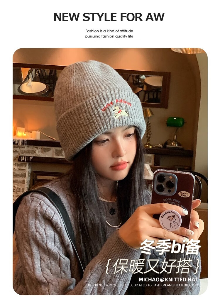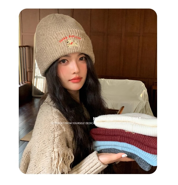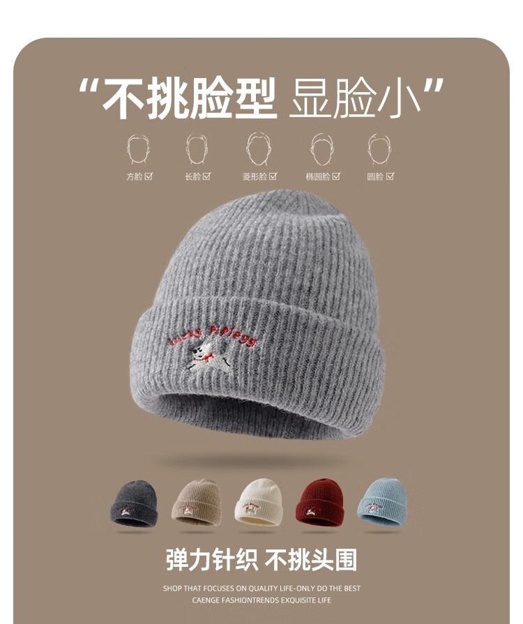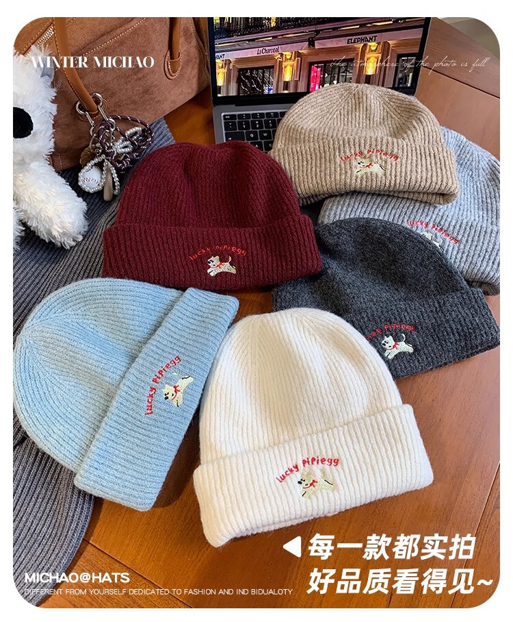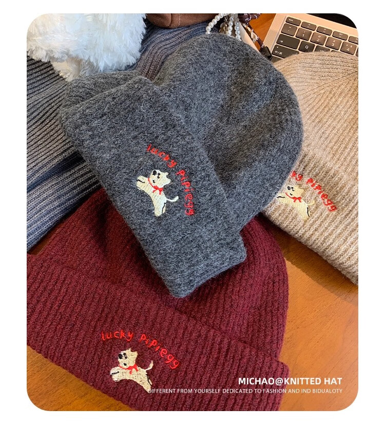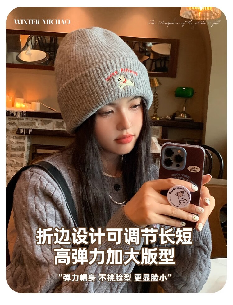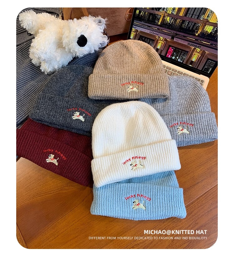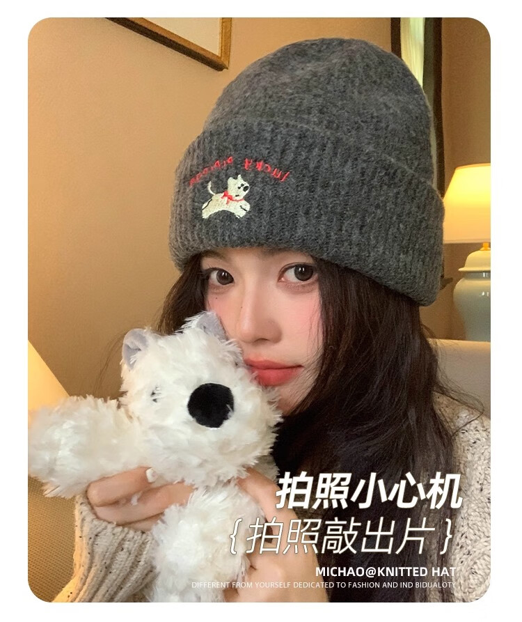 户外运动骑行帽可爱小狗针织帽子女毛线帽秋冬季保暖包头冷帽百搭 浅灰色-1顶 有弹性(54-60cm)