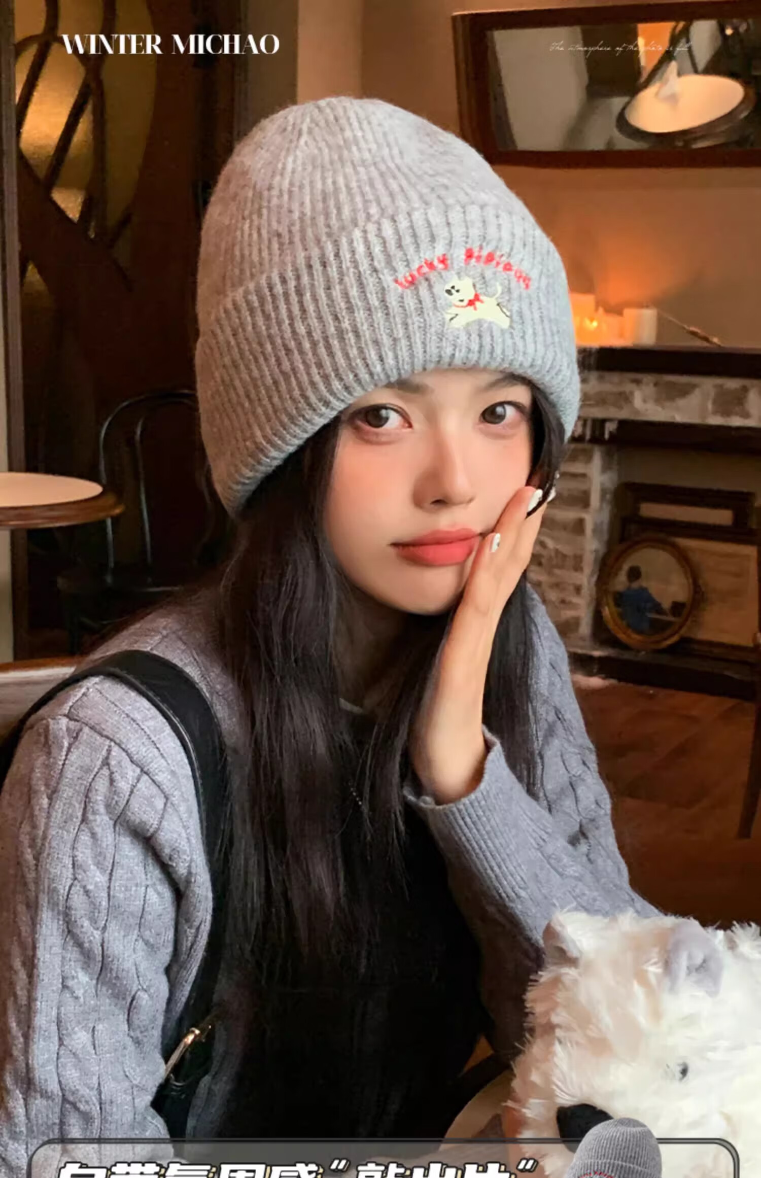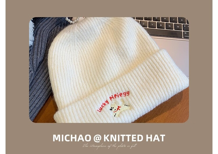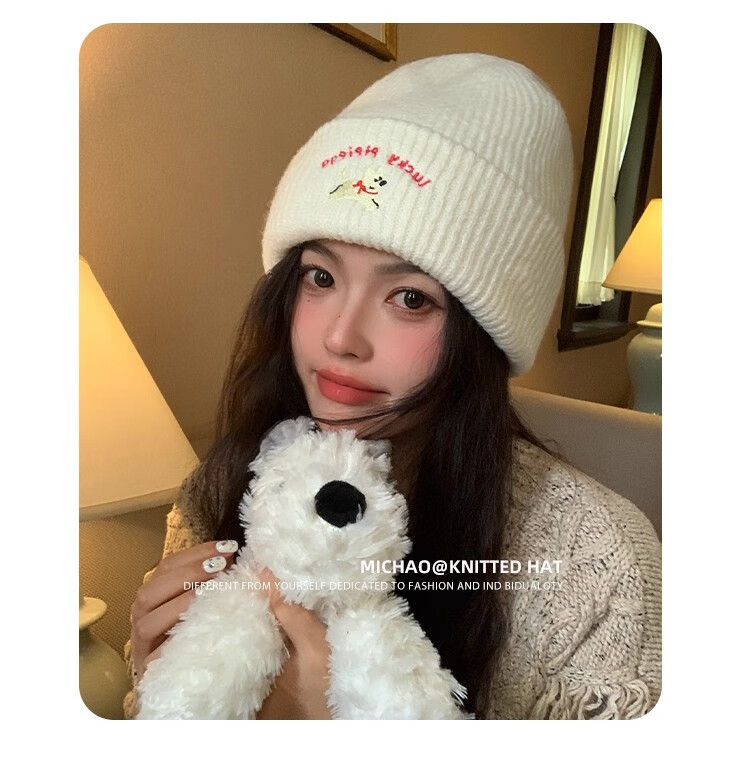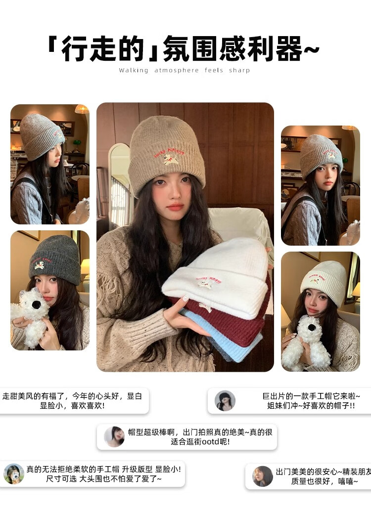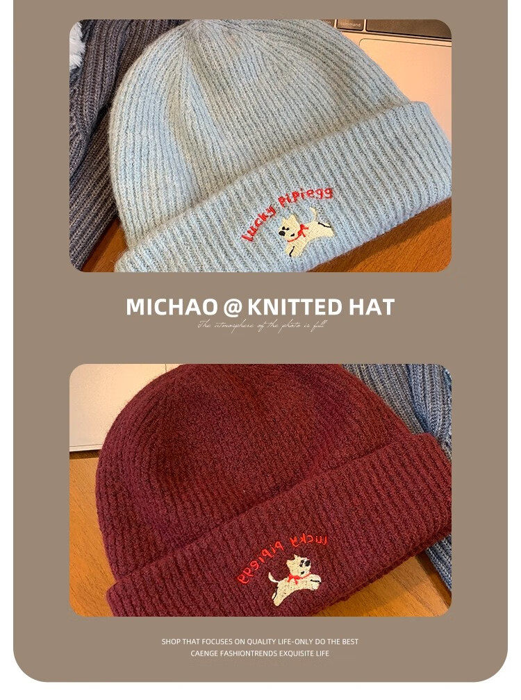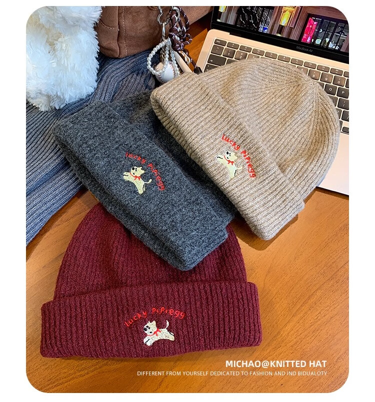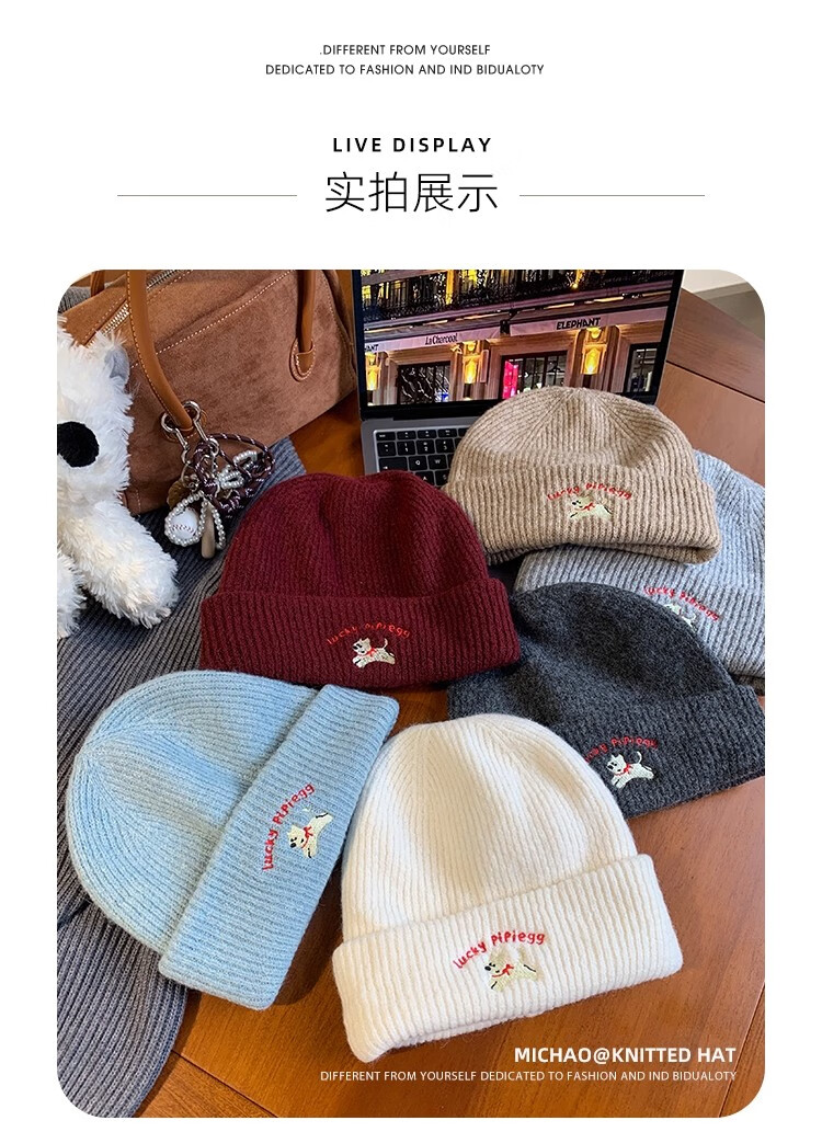 户外运动骑行帽可爱小狗针织帽子女毛线帽秋冬季保暖包头冷帽百搭 浅灰色-1顶 有弹性(54-60cm)