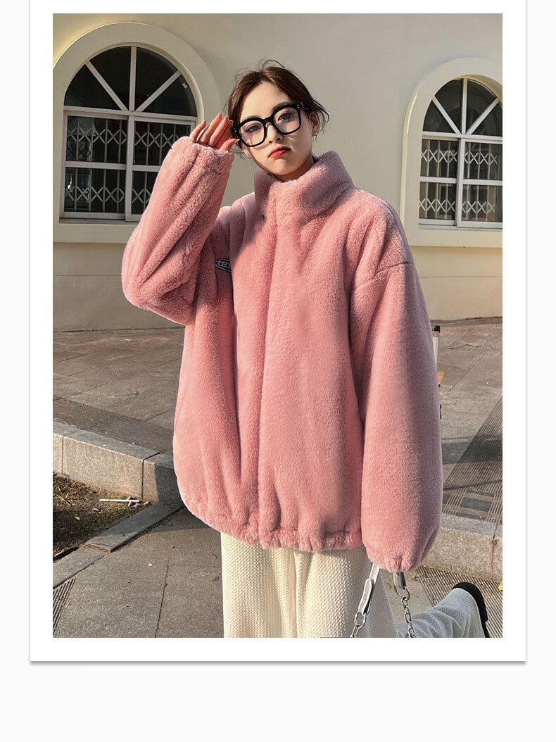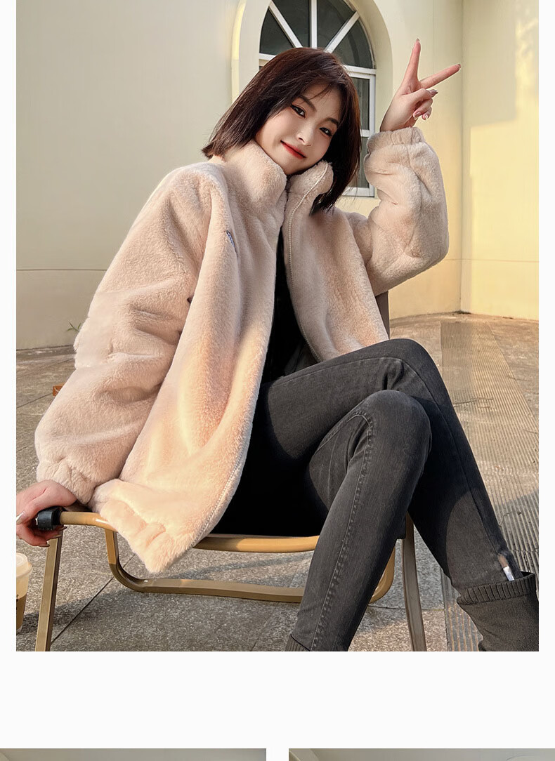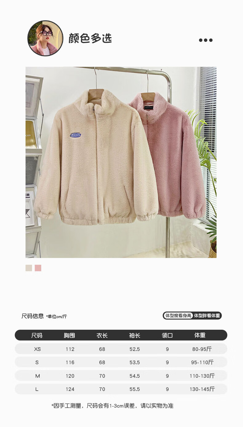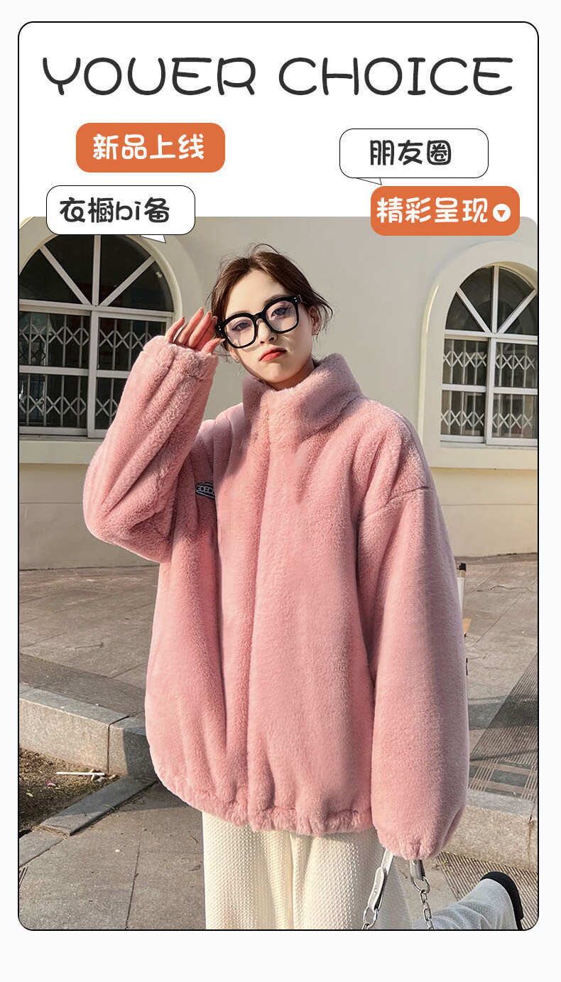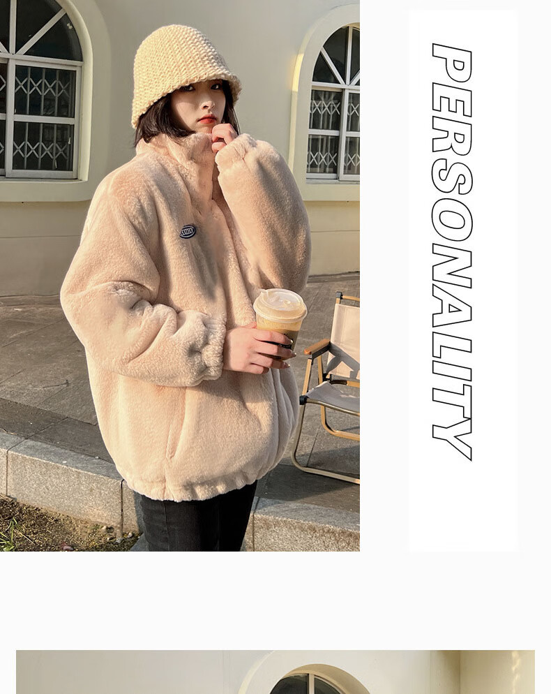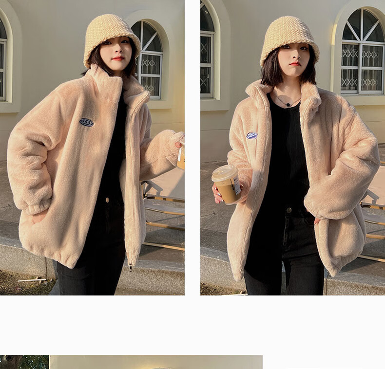 夹棉羊羔绒外套女秋冬宽松立领毛绒卫衣学生百搭加厚保暖上衣J068 杏色 S (90-110斤)