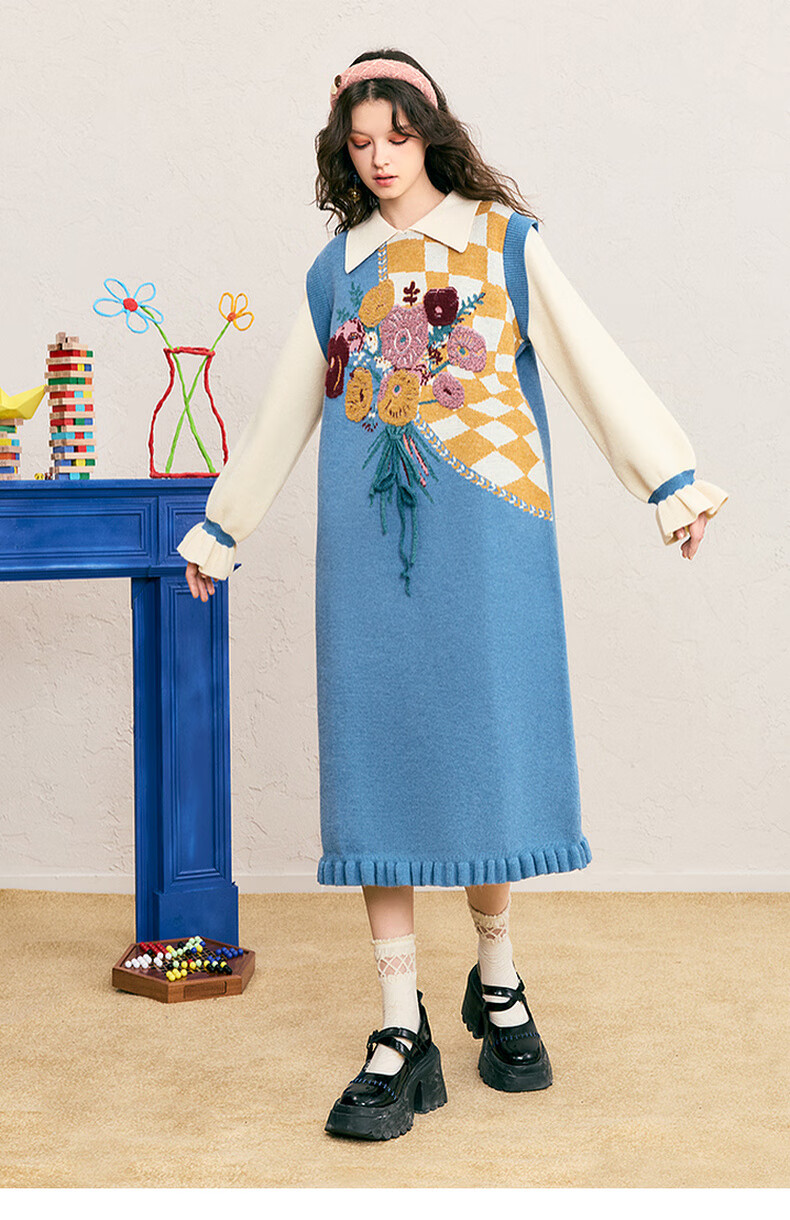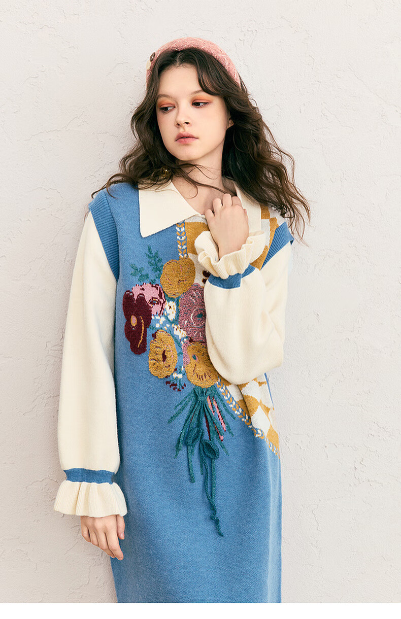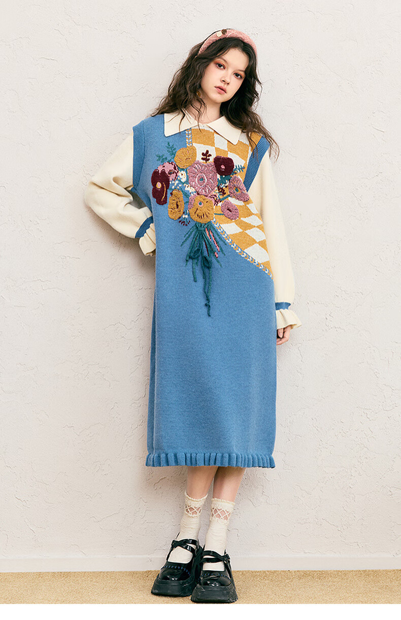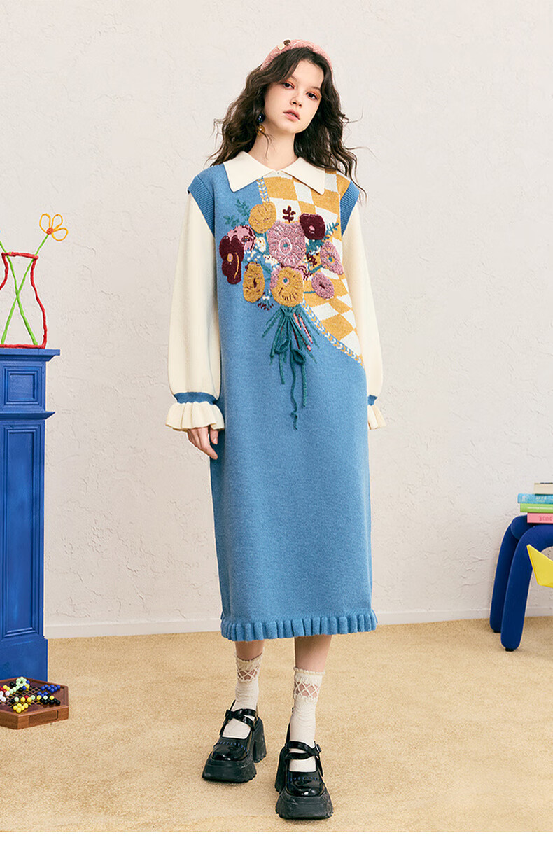 两三事冬季针织连衣裙女2025秋冬季新款毛衣裙长款毛衣裙子花神迷宫 蓝色 L