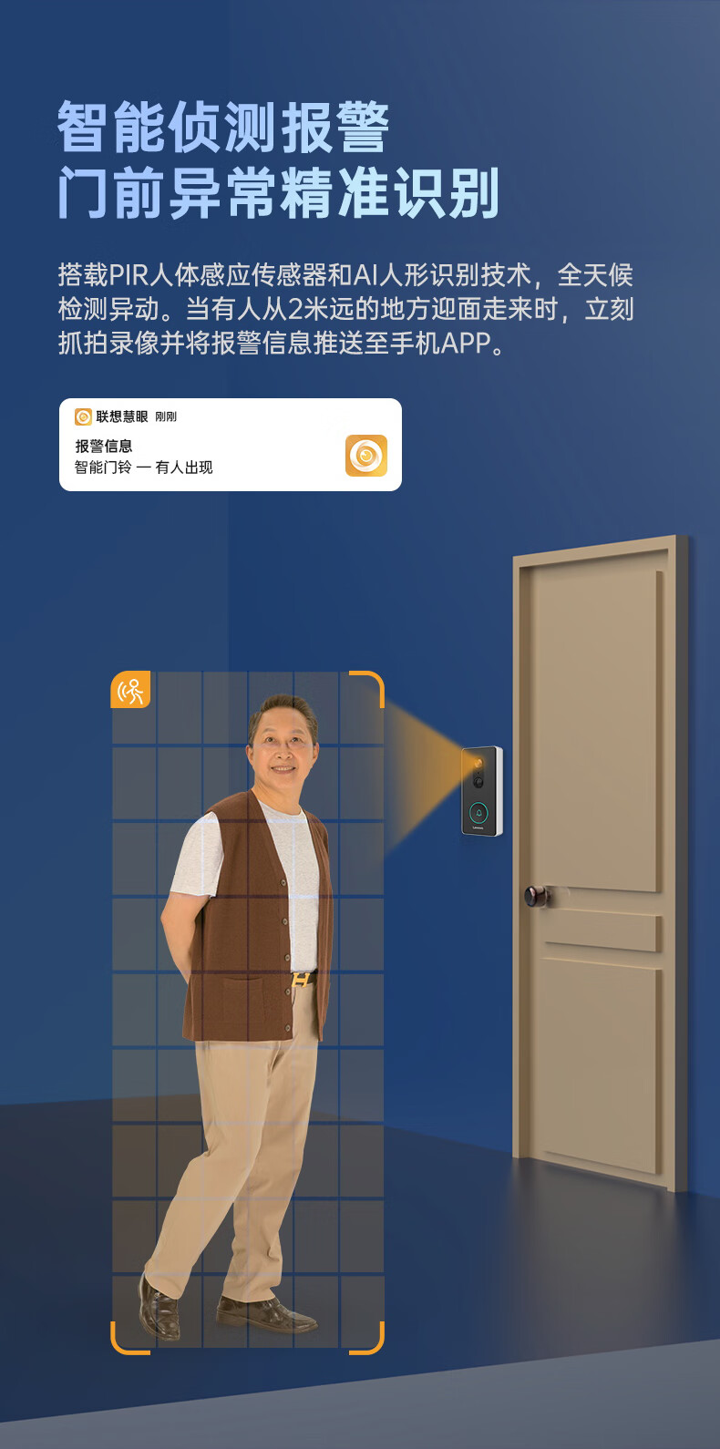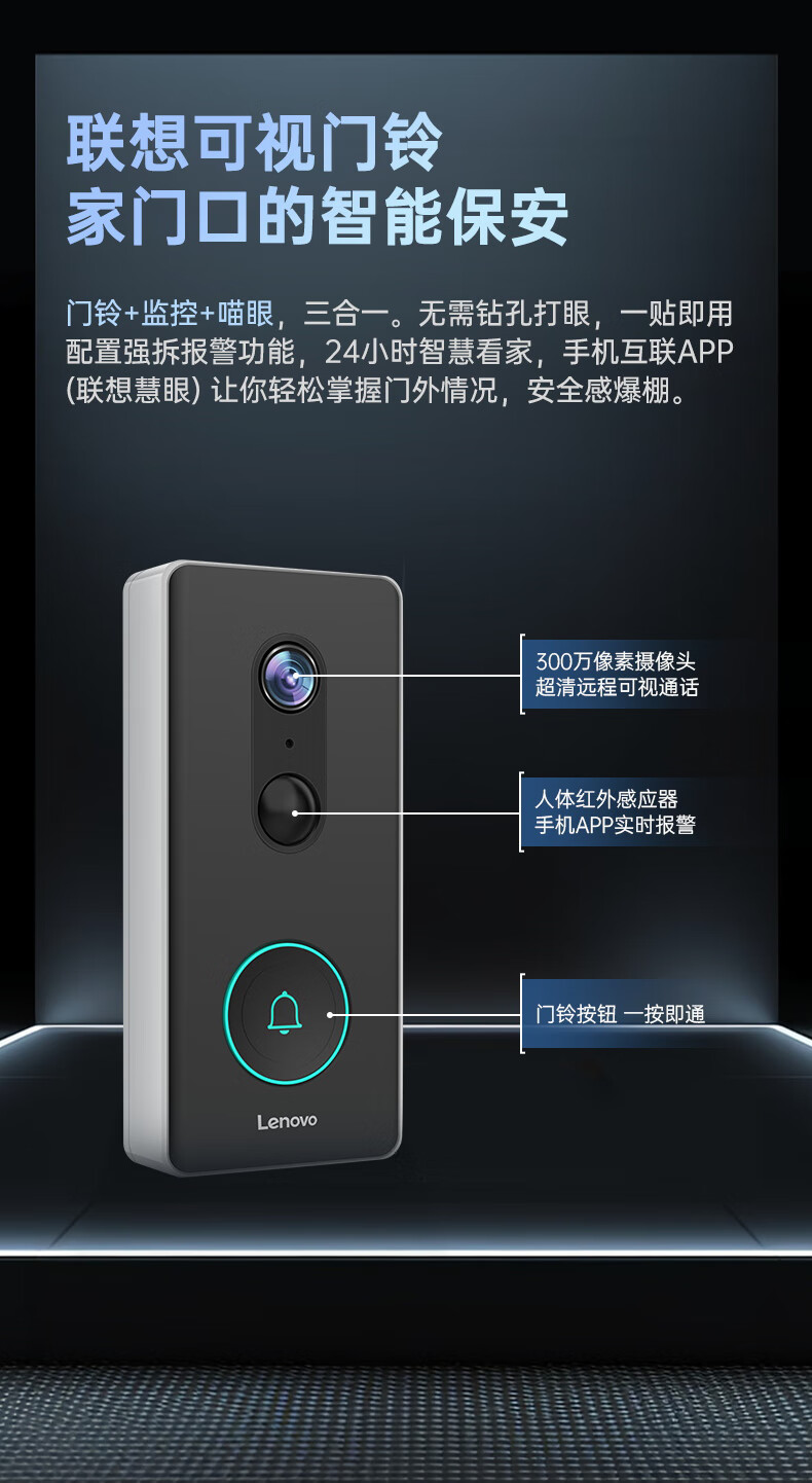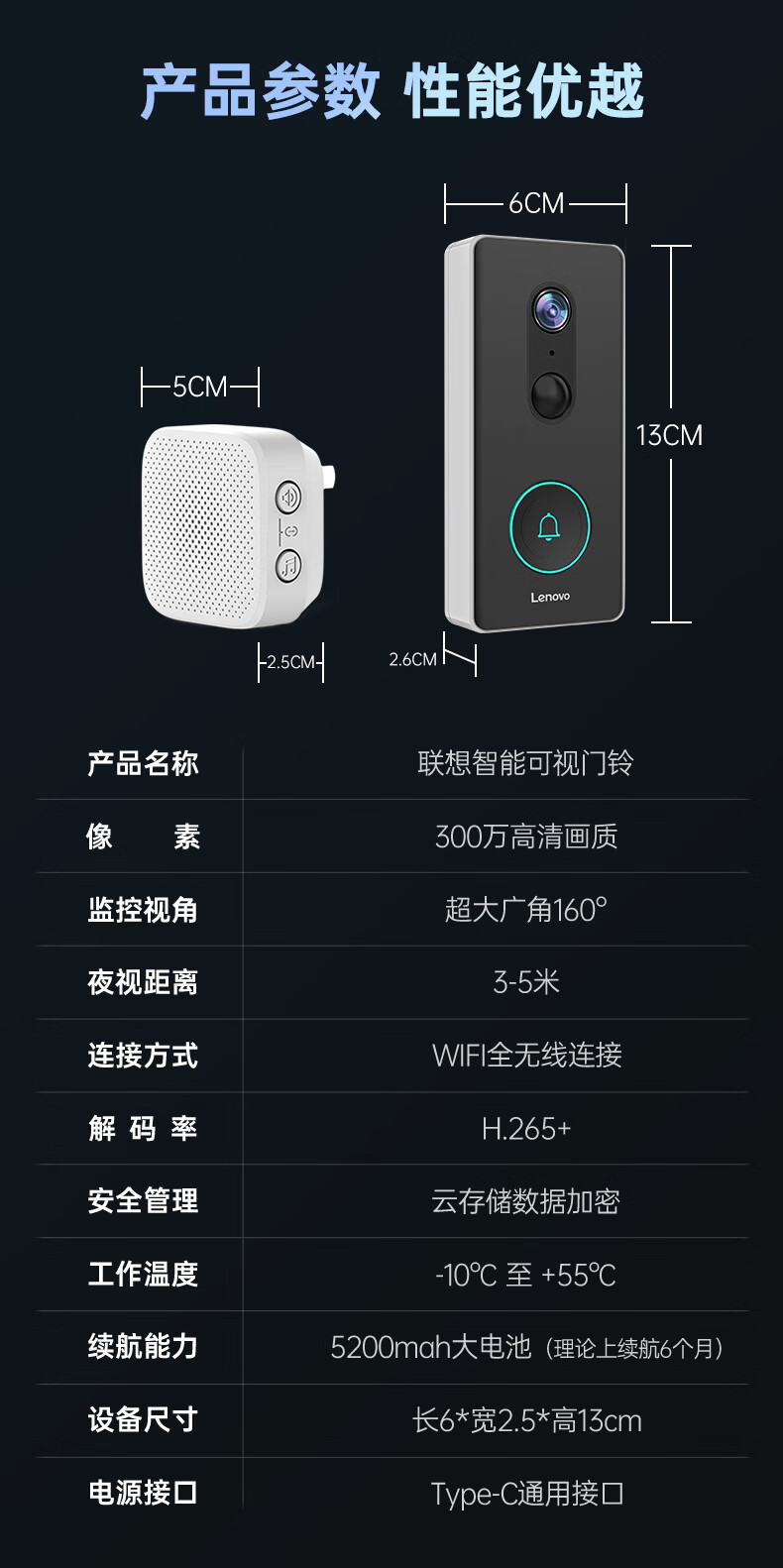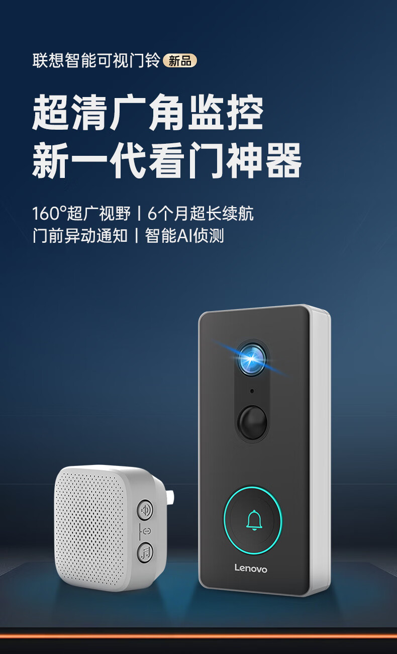 联想(Lenovo)300万可视门铃监控入户门口摄像头家用电子防盗智能猫眼手机无线远程可视通话超长续航