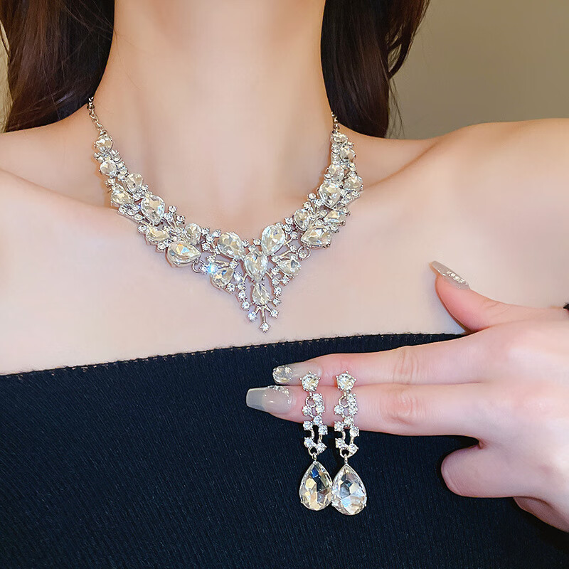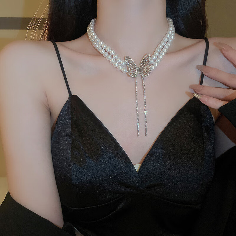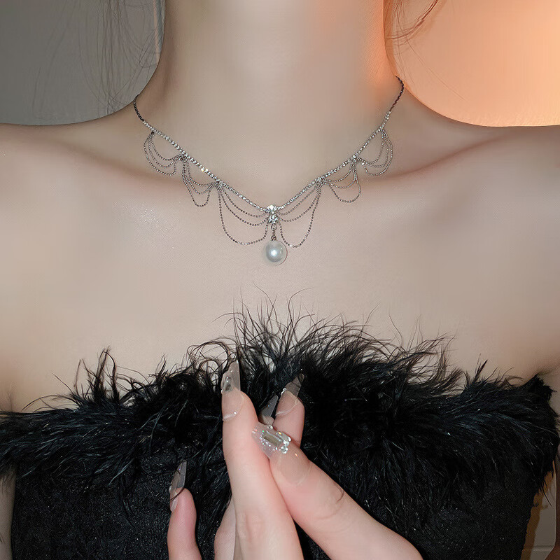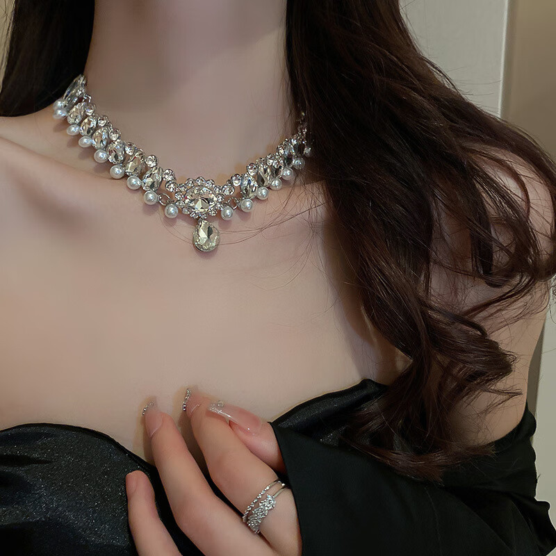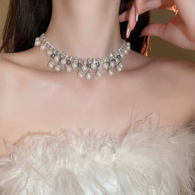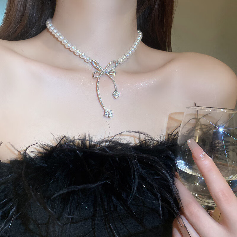 法式镶钻花朵珍珠项链时尚轻奢气质锁骨链小众送女友礼物饰品配饰 43#项链-银色(两件套)