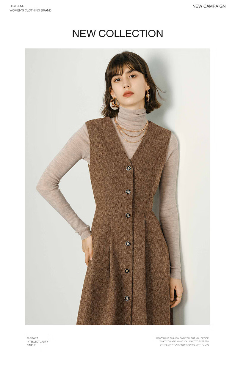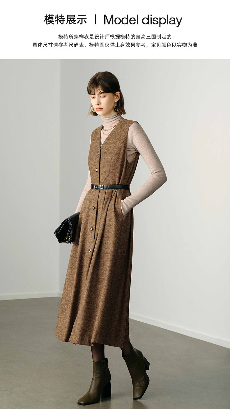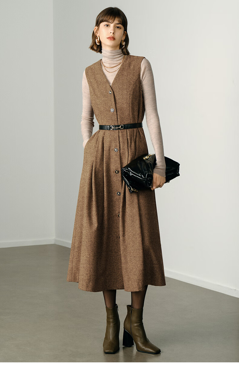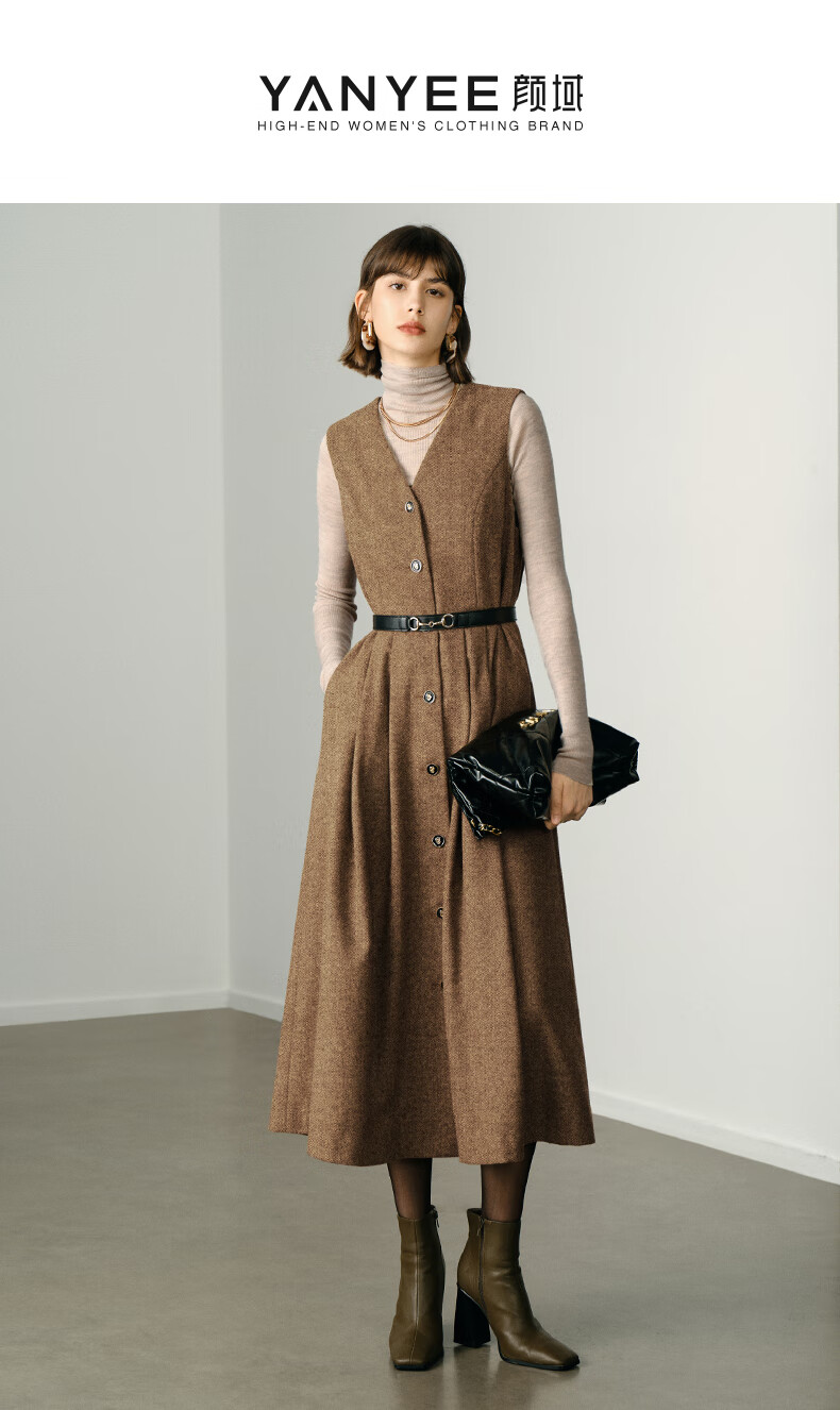 颜域毛呢中长款V领连衣裙冬装女2025简约裙子气质背心裙 驼色1 L