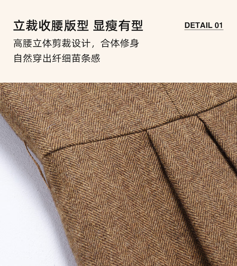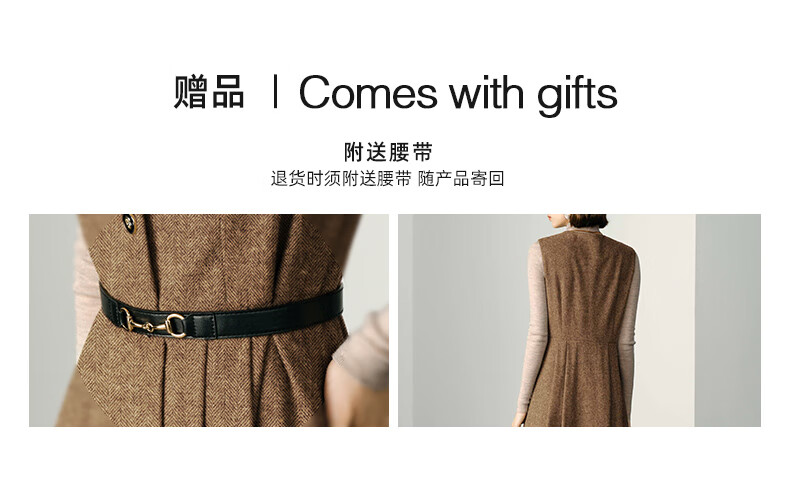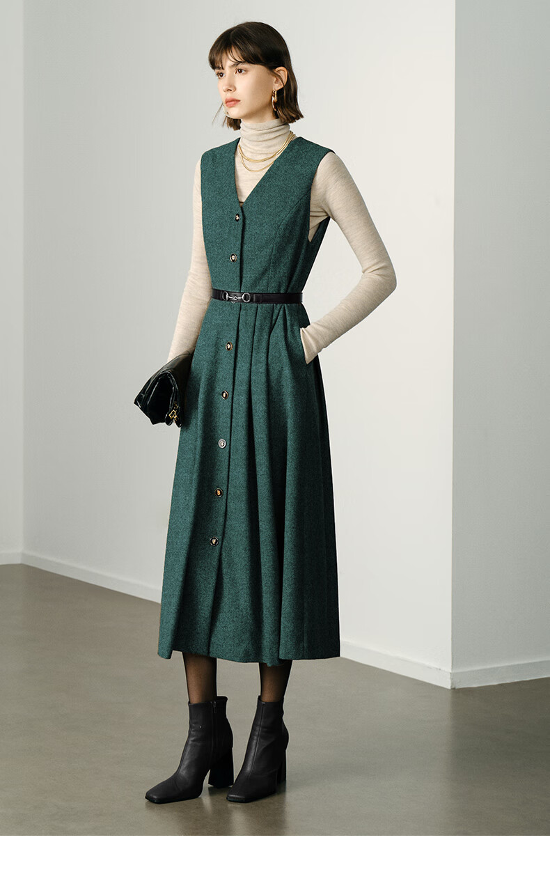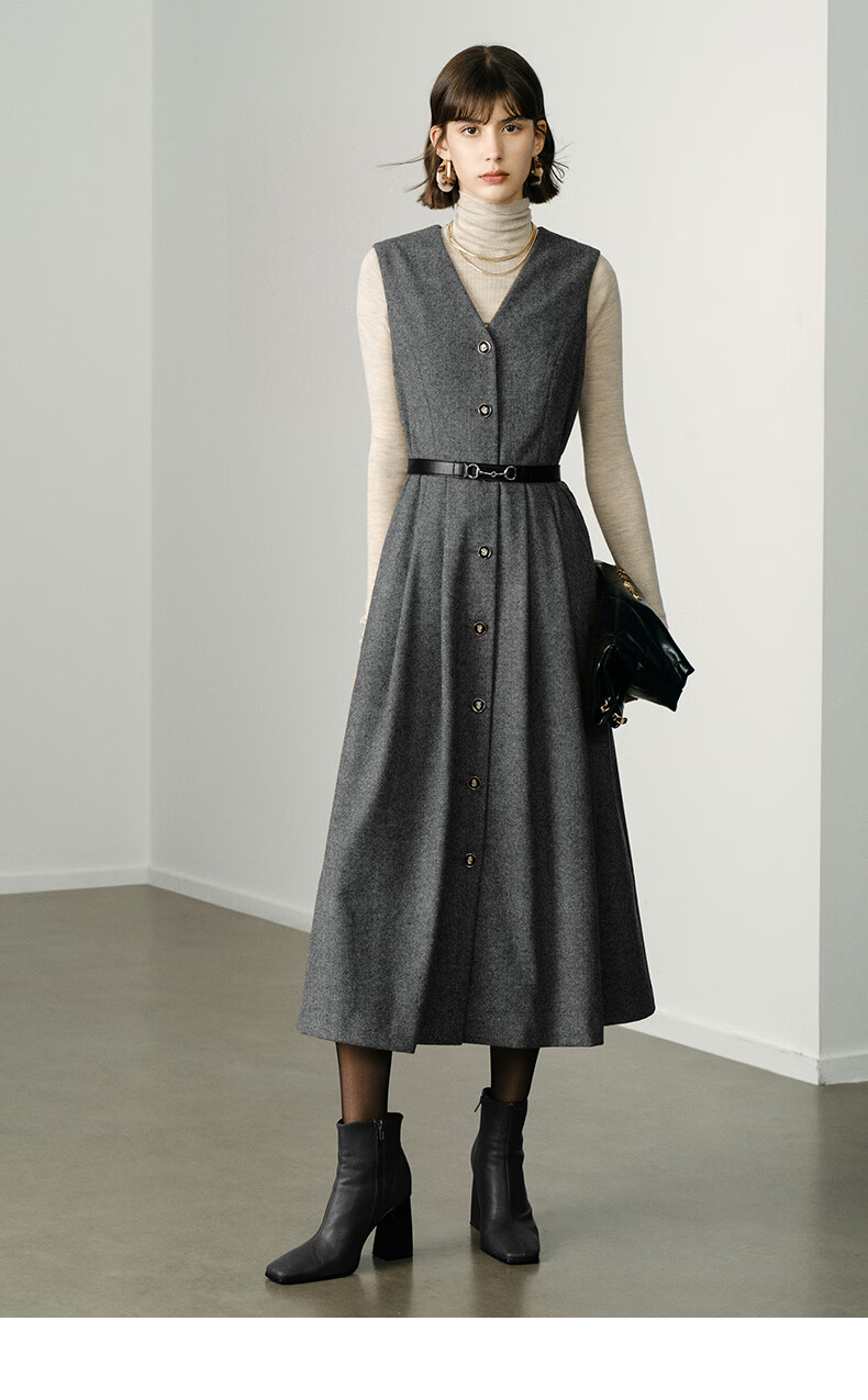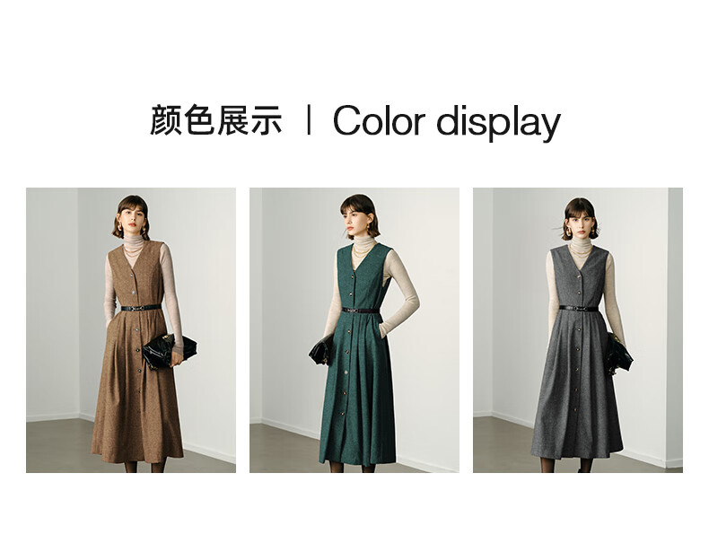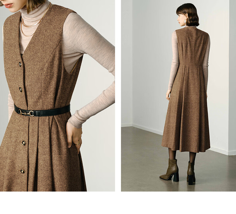 颜域毛呢中长款V领连衣裙冬装女2025简约裙子气质背心裙 驼色1 L