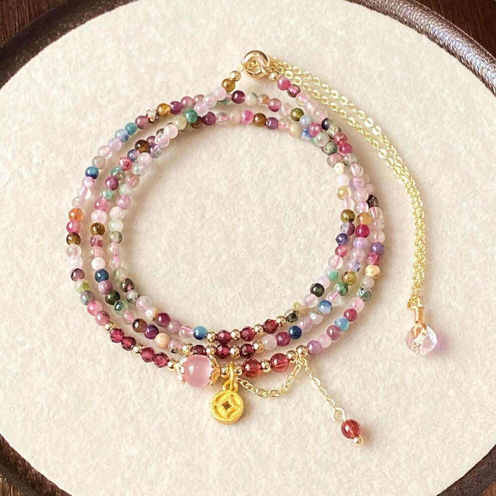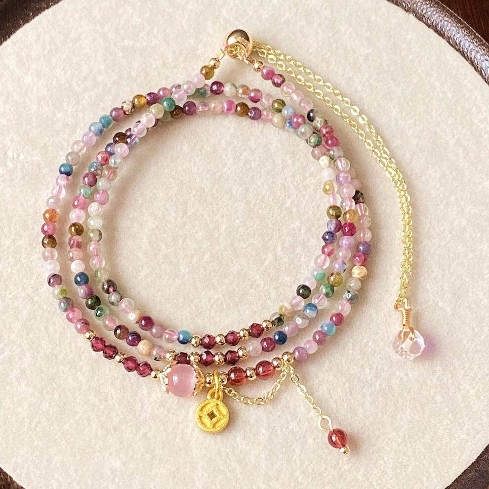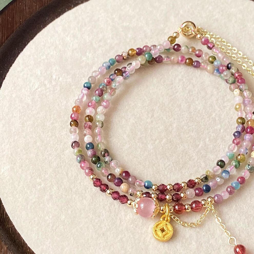 花饰庄园水晶珠宝切面石榴石圆珠彩碧玺红碧玺绿碧玺三圈多层手链手串