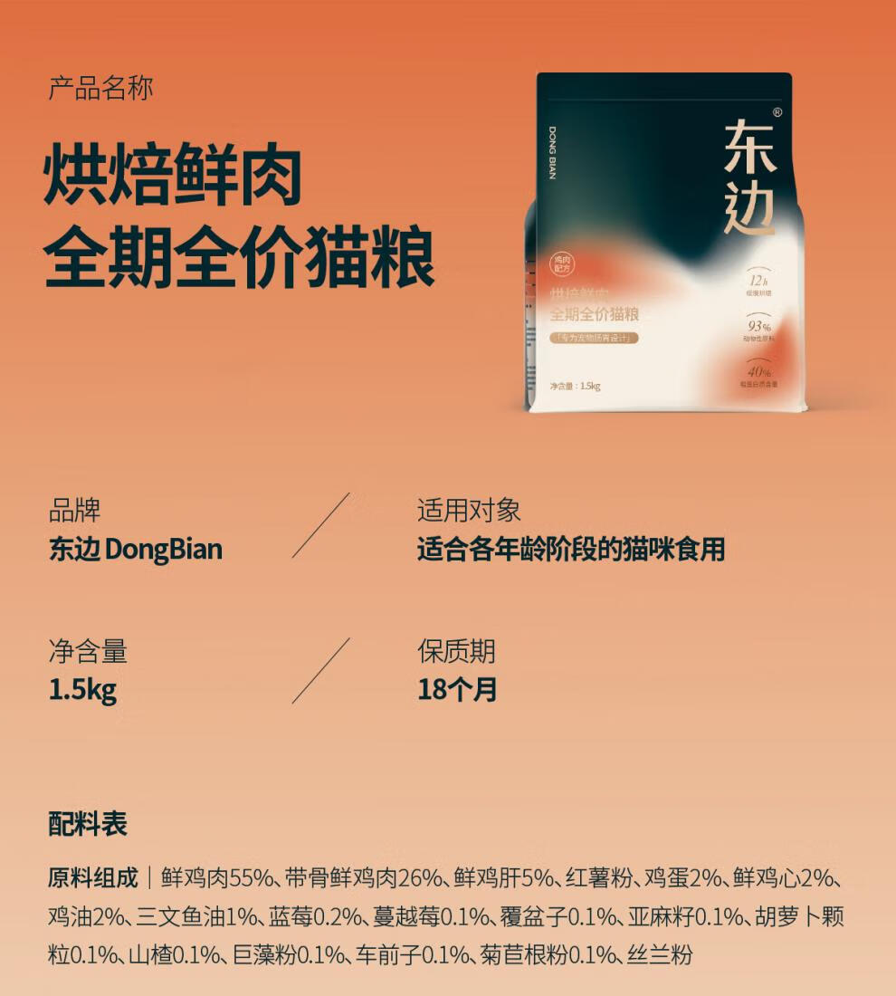 东边低温烘焙鲜肉全期全价猫粮试吃装 160g(40gx4包)