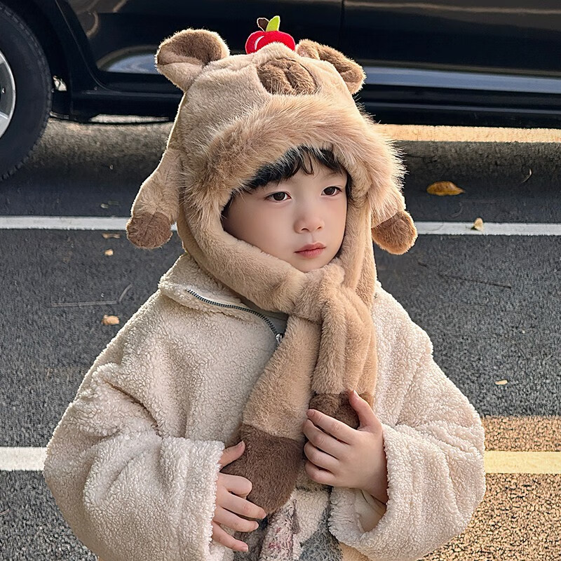木木屋(mumuwu)卡皮巴拉帽子围巾一体儿童捏耳朵会动的2025新款秋冬季男女孩冬天