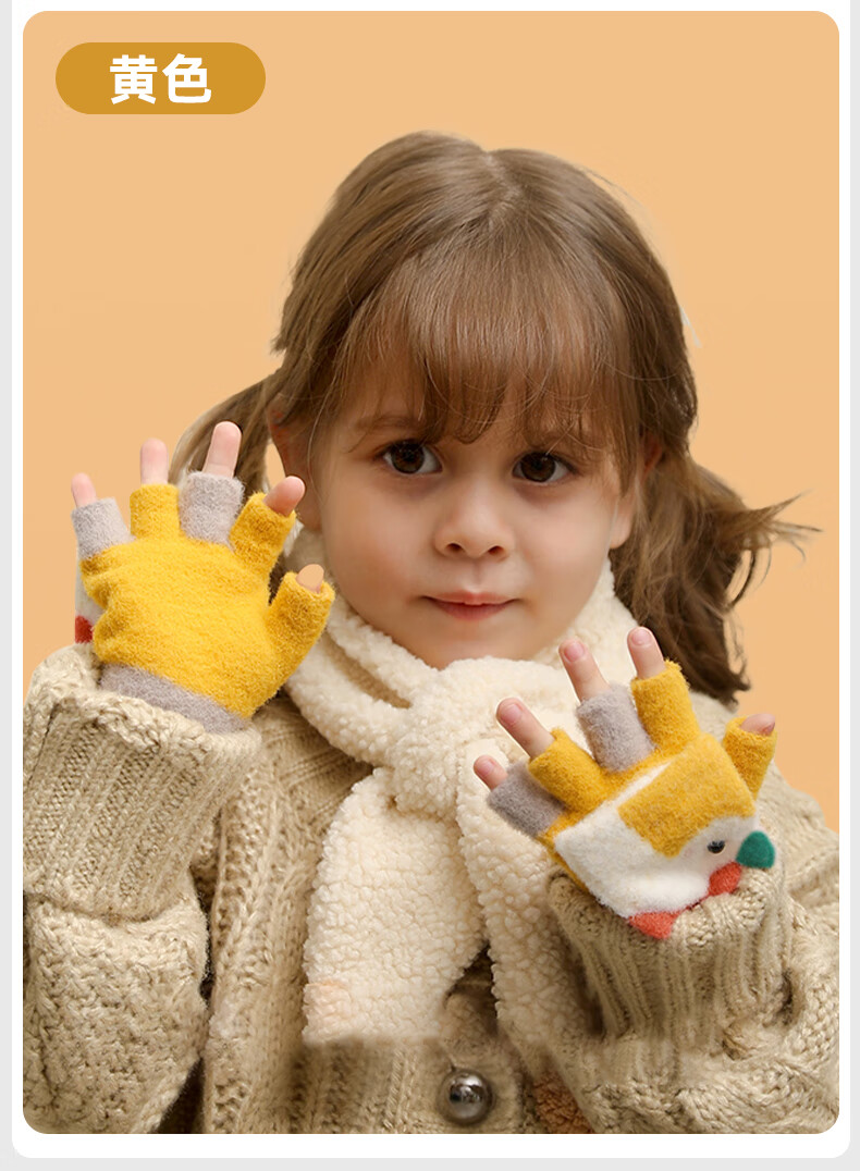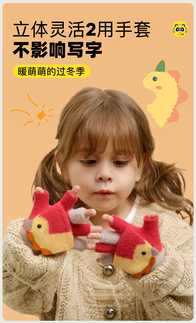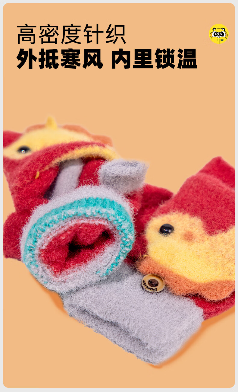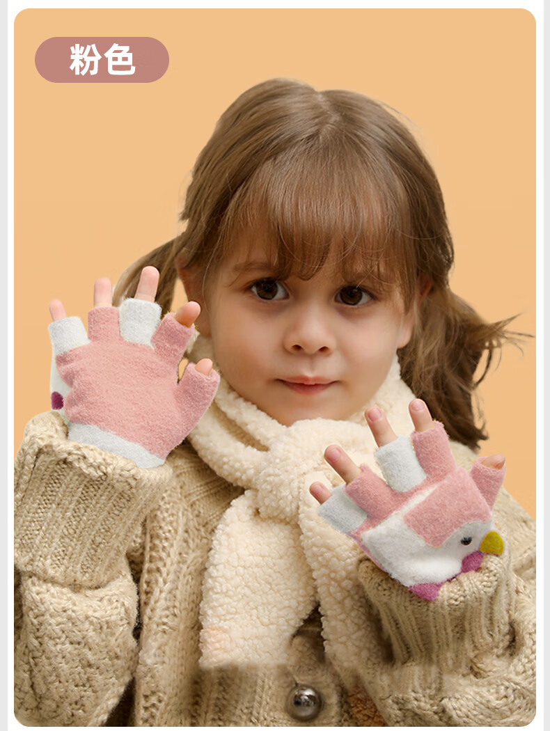 牧萌儿童手套男童女童冬季翻盖手套宝宝冬季写字半指手套 红色独角兽