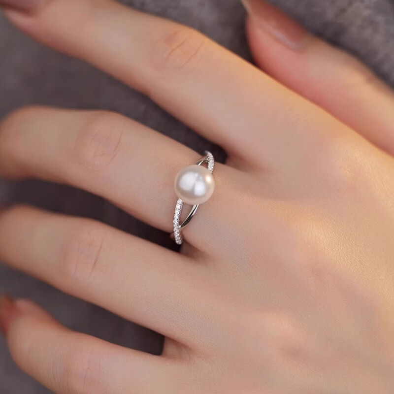 花饰庄园轻奢小众正圆仿珍珠戒指女ins交叉设计简约叠戴开口指环 白金色