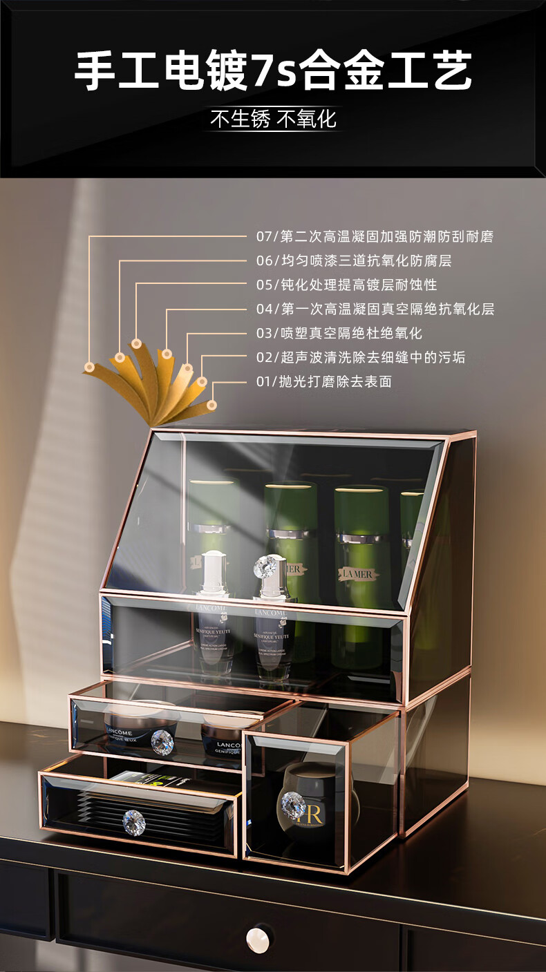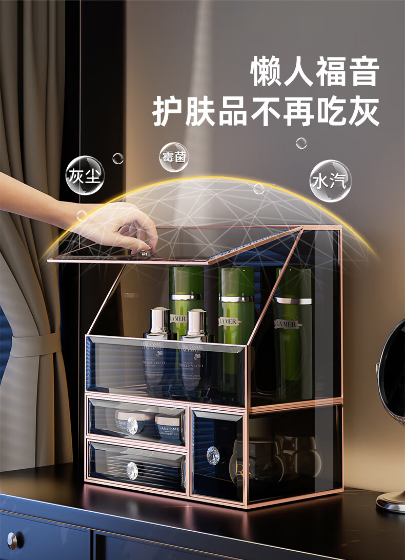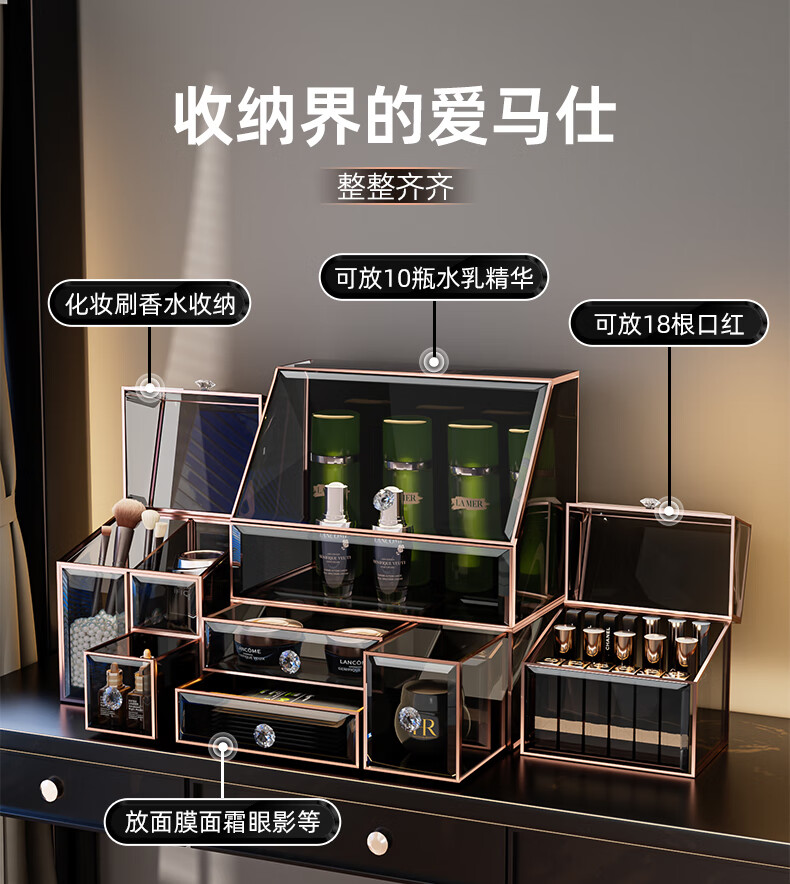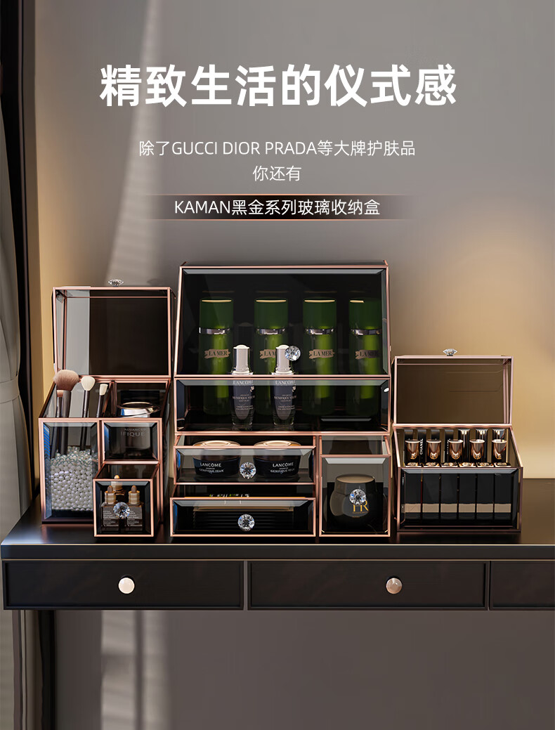 KAMAN玻璃化妆品收纳盒防尘桌面高级感护肤品口红香水置物架生日礼物 三件套【顶+抽+三合一】