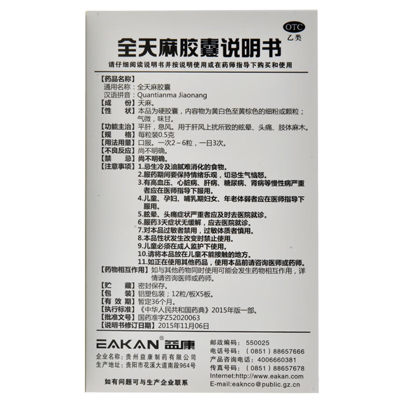 [益康]全天麻胶囊 0.5g*60粒 3盒装 60粒 平肝息风用于肝风上扰所致的眩晕头痛肢体麻木