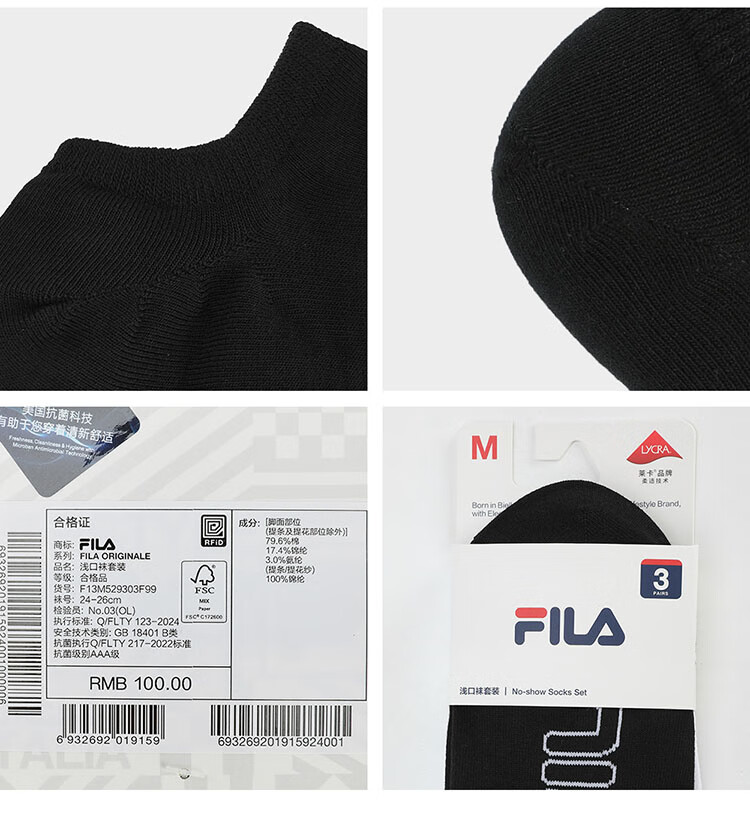 FILA 斐乐官方男士袜子浅口袜套装夏季新品船袜舒适休闲袜子3双装 组合色-99 XS