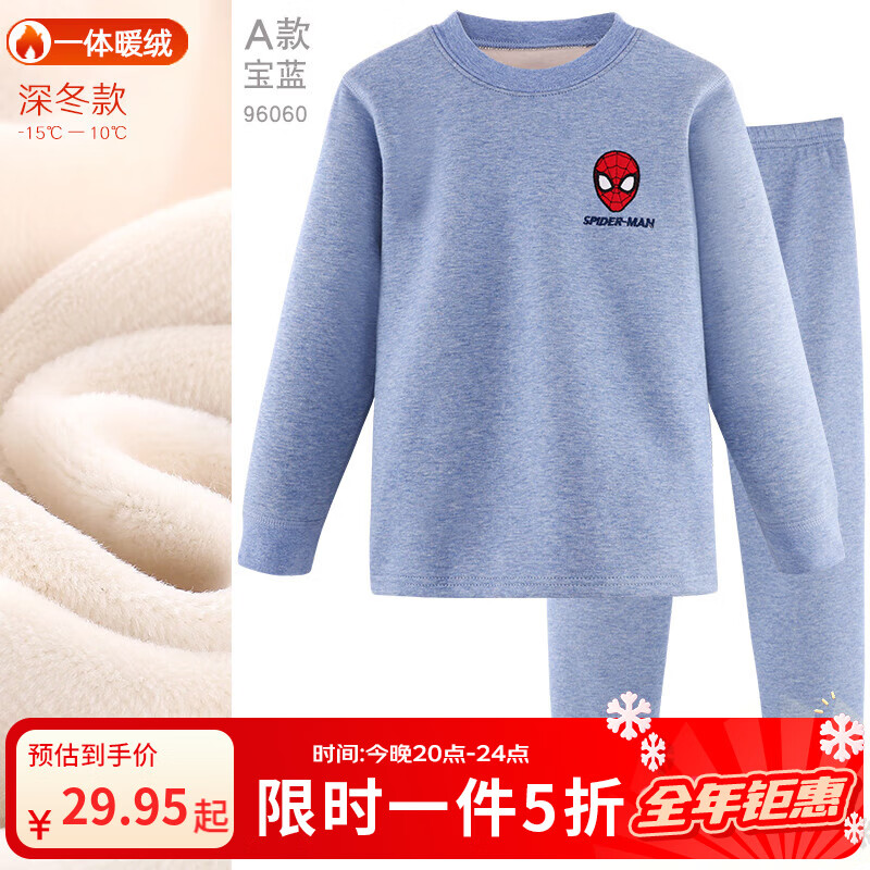 迪士尼儿童保暖内衣套装纯棉加厚加绒男童秋衣秋裤宝宝睡衣大童装 A款 【A类 加绒加厚】蜘蛛侠 宝蓝 96060 165
