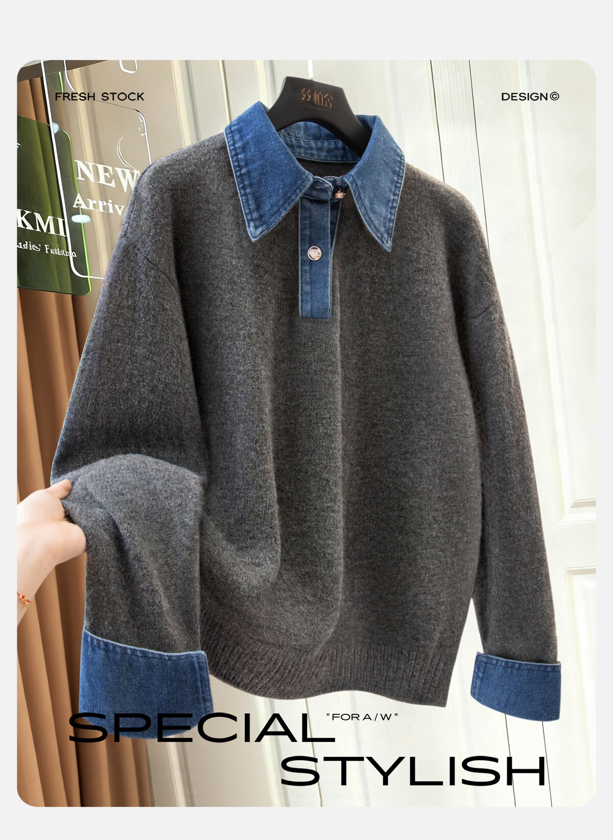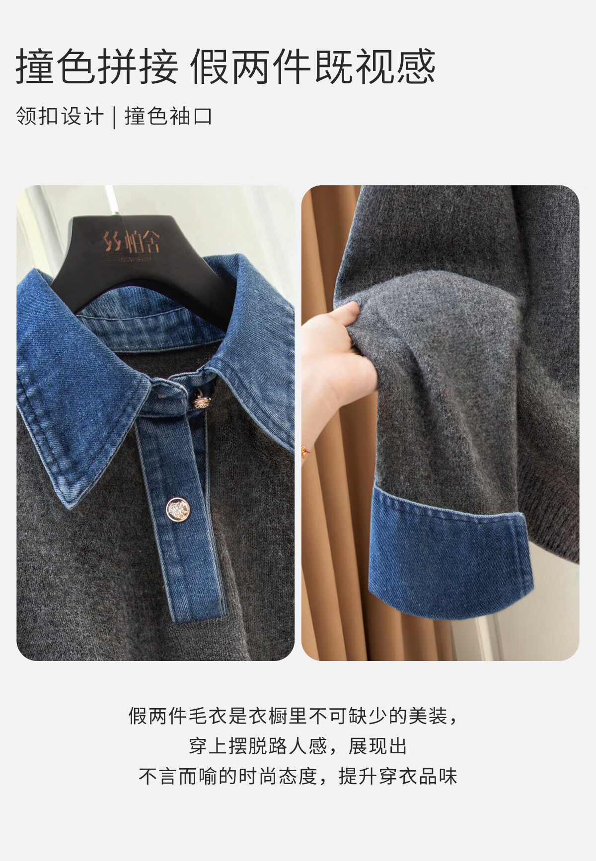 丝柏舍翻领拼接假两件毛衣女2025秋冬新款时尚宽松长袖套头上衣