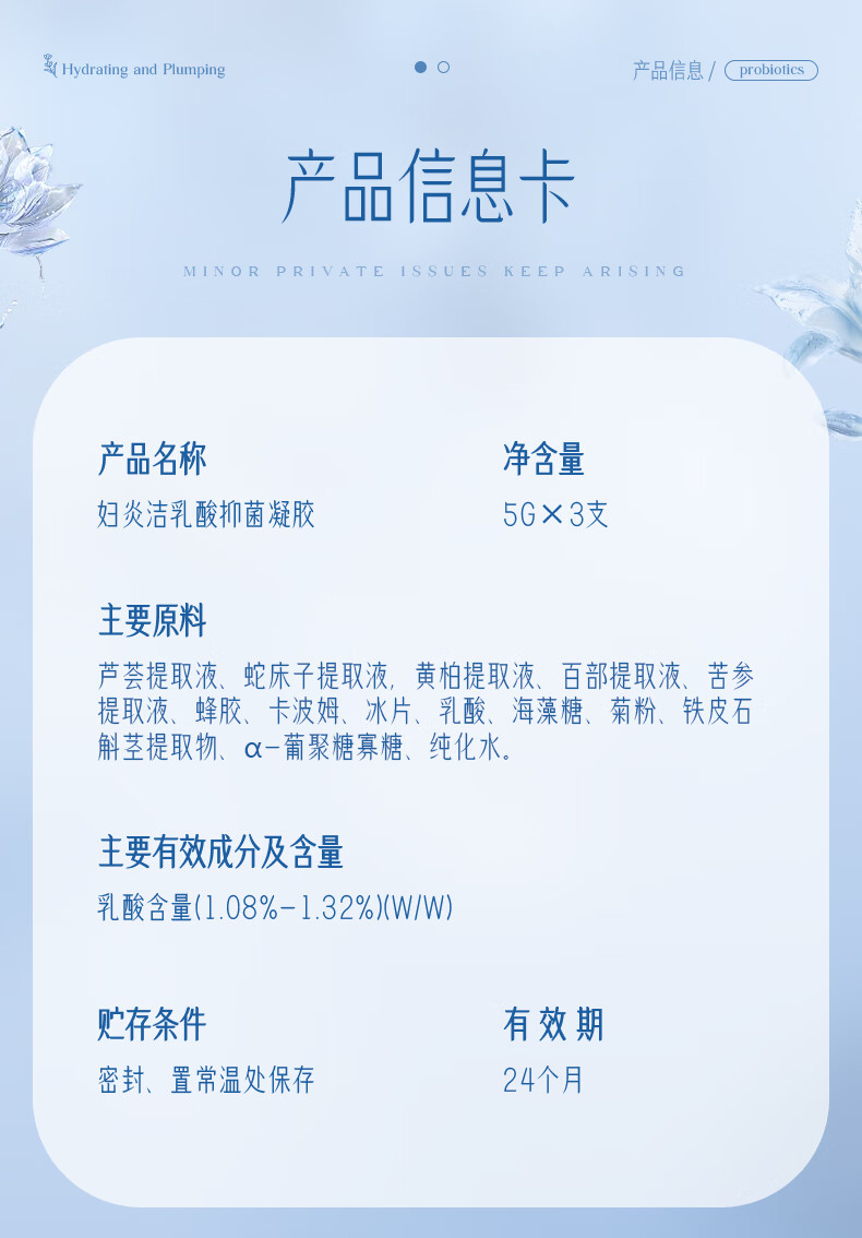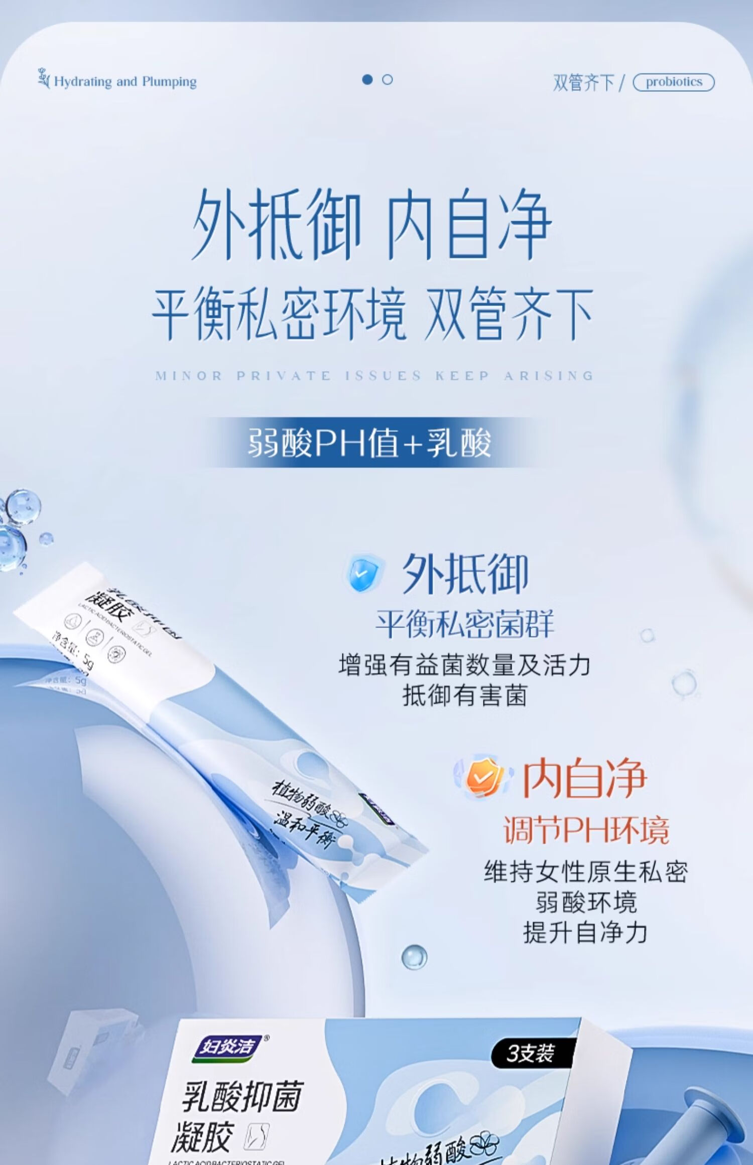 妇炎洁私护凝胶乳酸菌抑菌凝胶止痒去异味补水保养产后护理5g*3支/盒