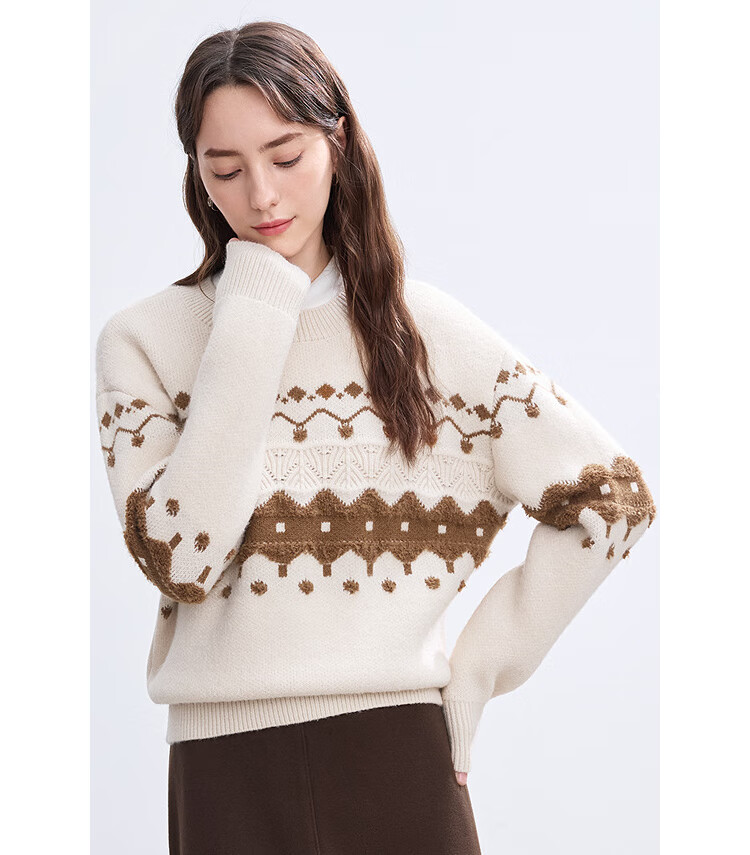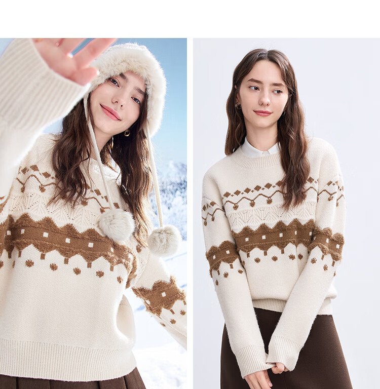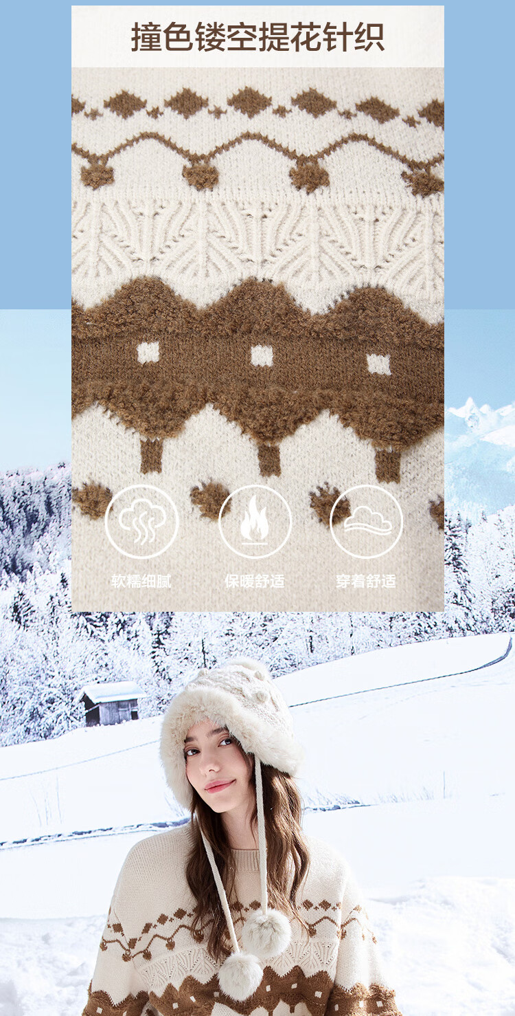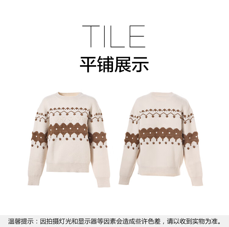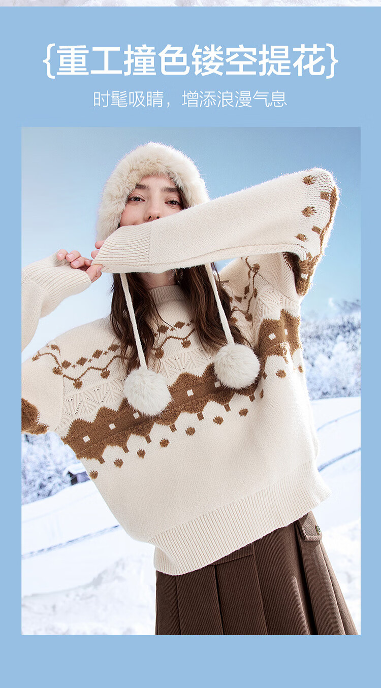 百图betu女装冬季新款毛衣圆领撞色镂空提花设计套头毛衫2411T41 杏色 L