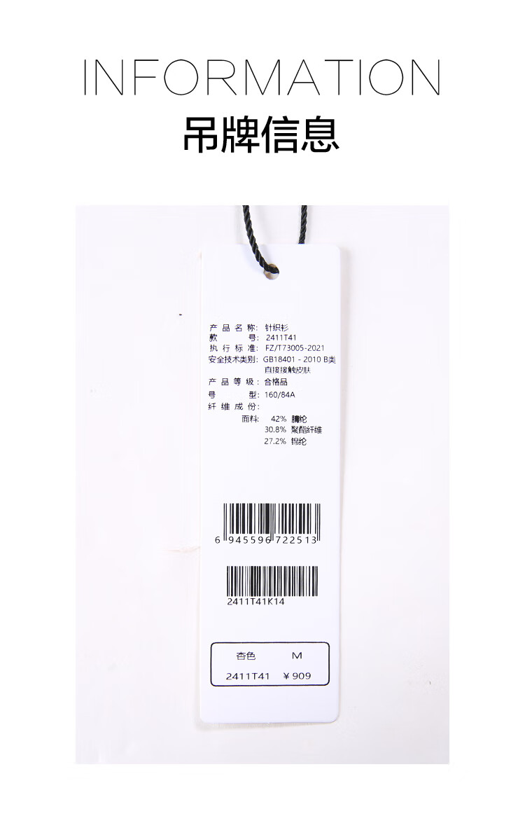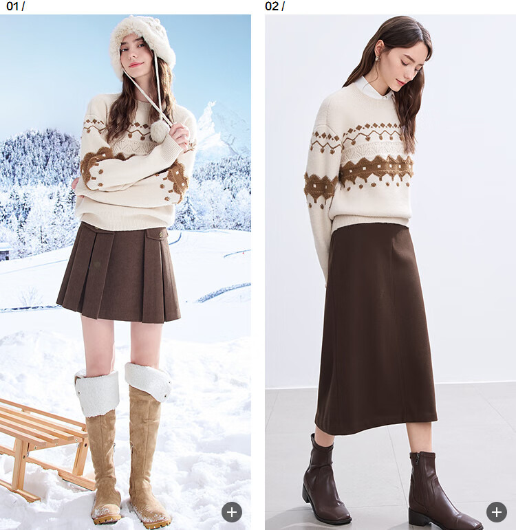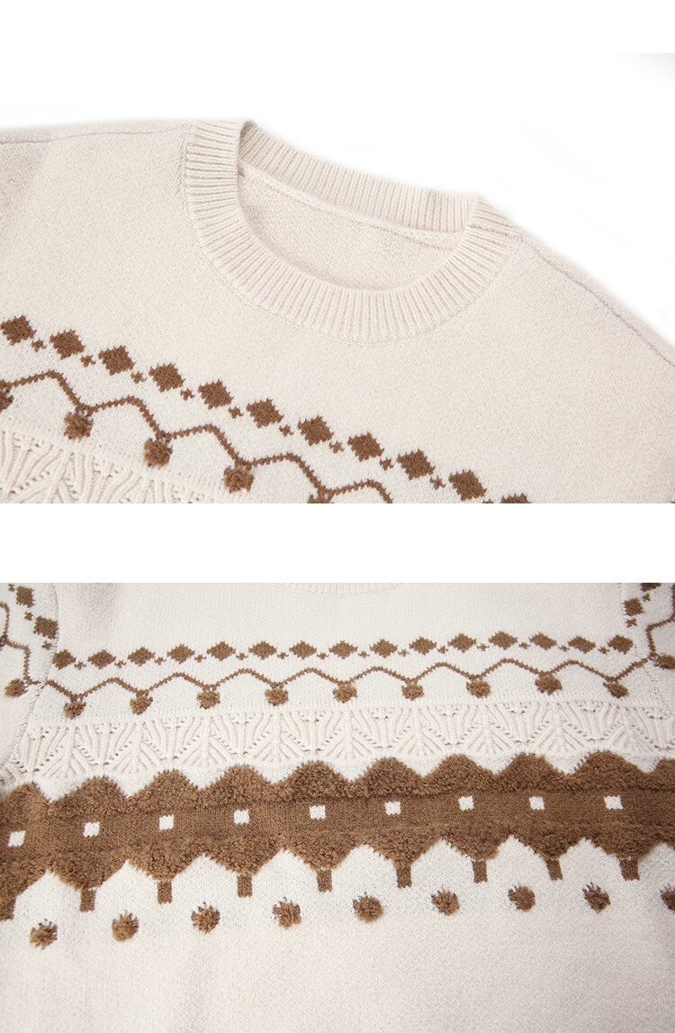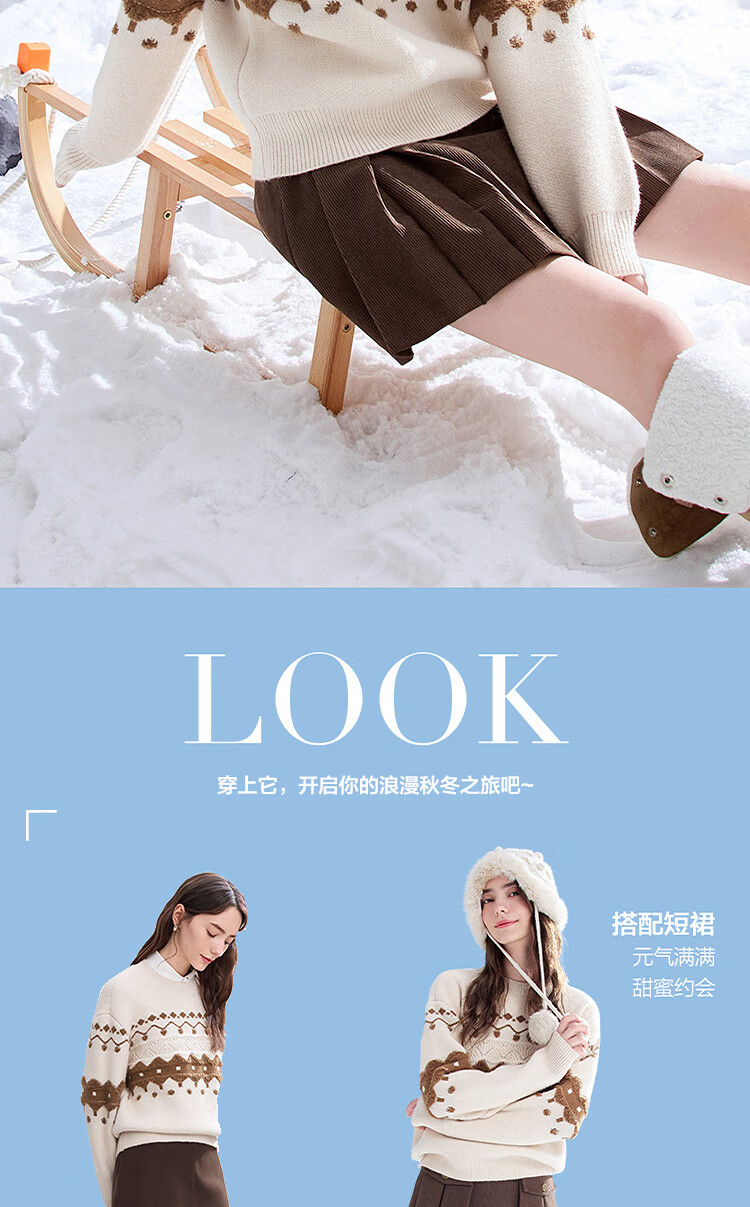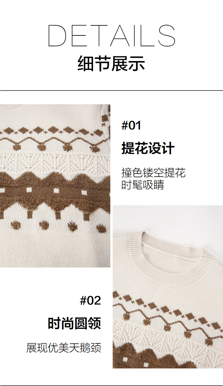 百图betu女装冬季新款毛衣圆领撞色镂空提花设计套头毛衫2411T41 杏色 L
