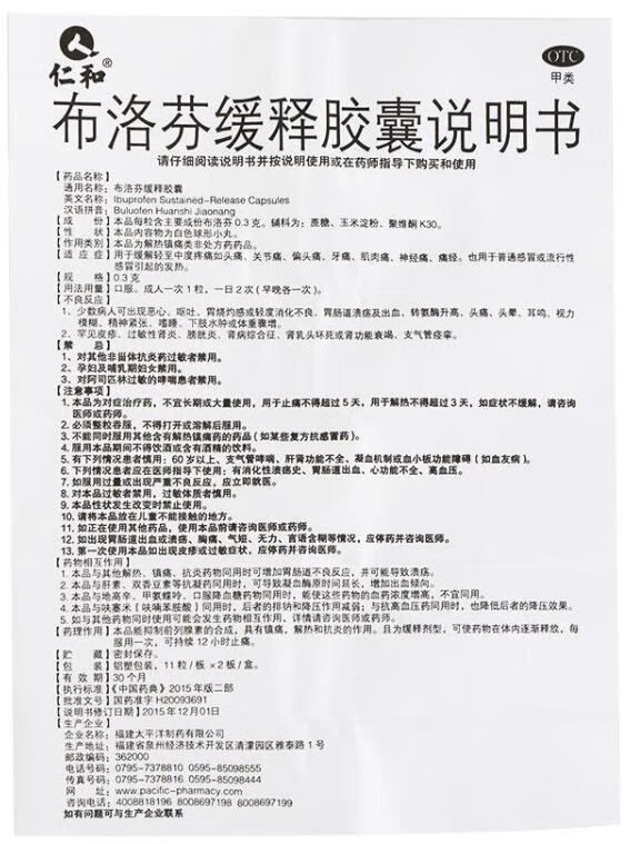 仁和 布洛芬缓释胶囊 0.3g*22粒 止痛药 痛经 退烧药 牙痛 肌肉关节痛 神经痛 头痛 偏头痛 感冒发热 流感