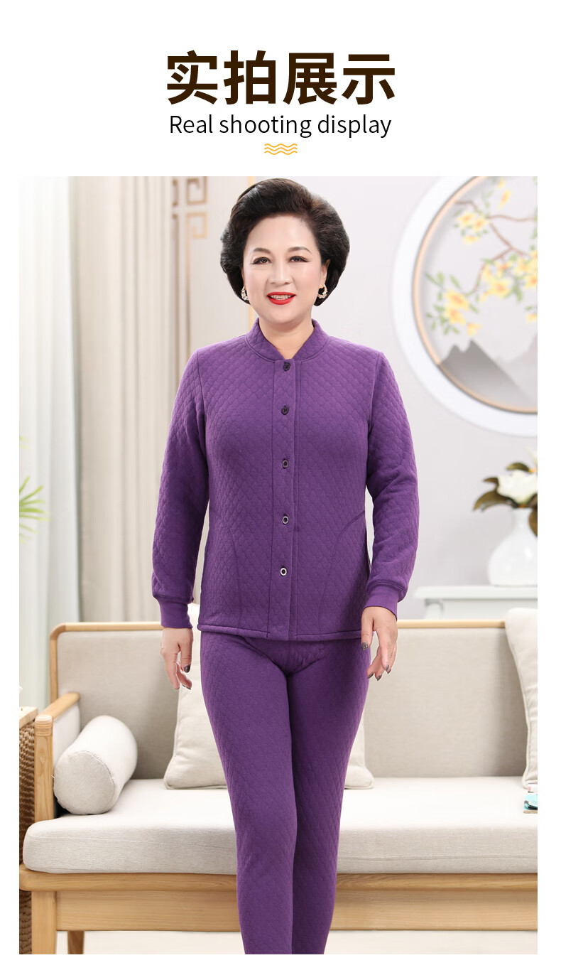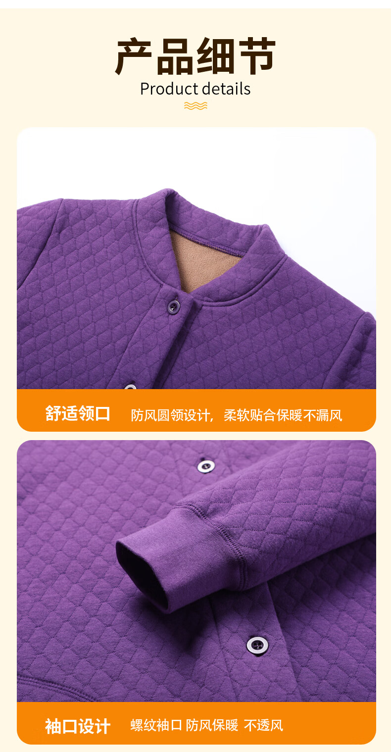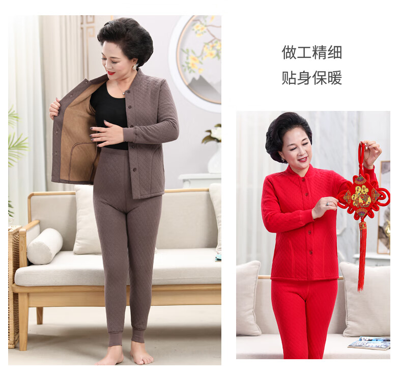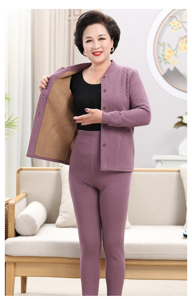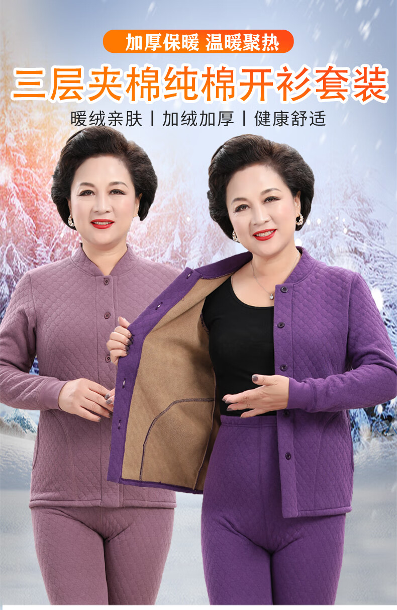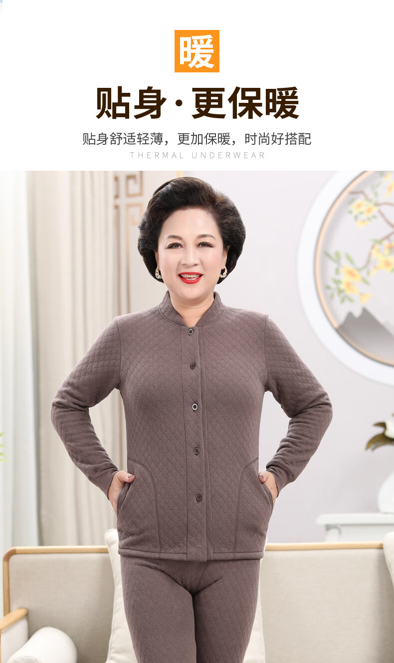 浪莎(LangSha)老年人加绒加厚保暖内衣女妈妈奶奶开衫开襟对开纯棉秋衣秋裤套装 女三层夹棉羊羔绒咖啡色(衣服+裤子) 4XL