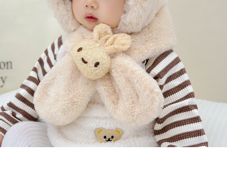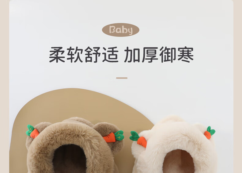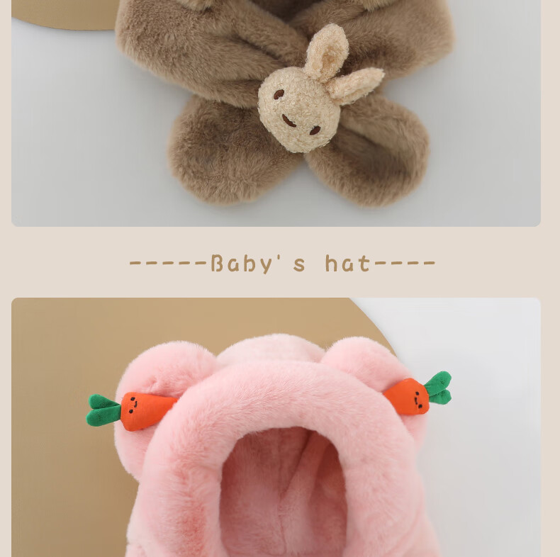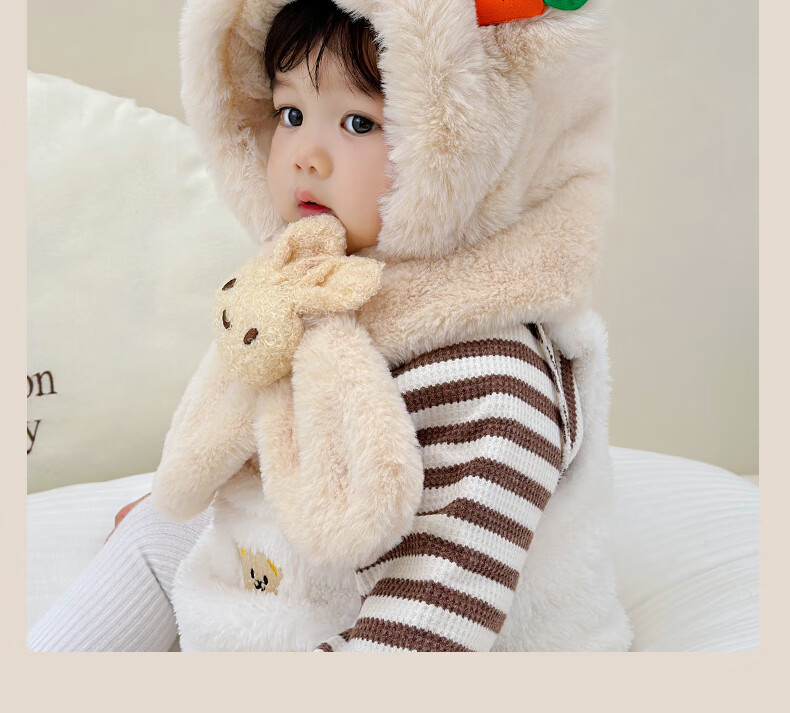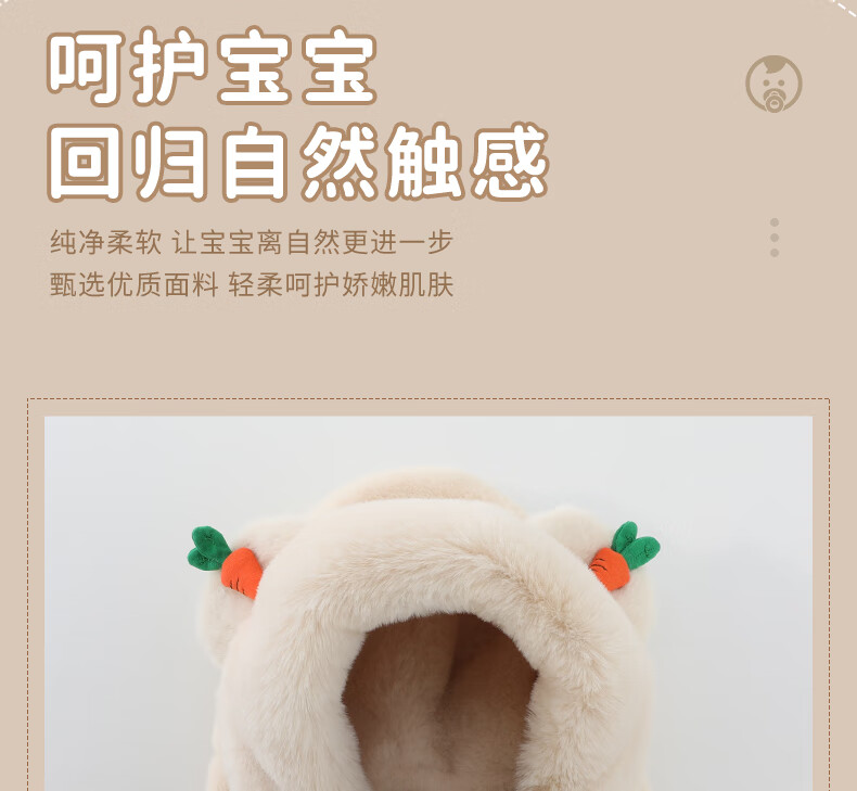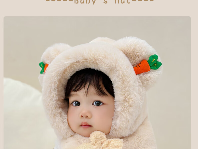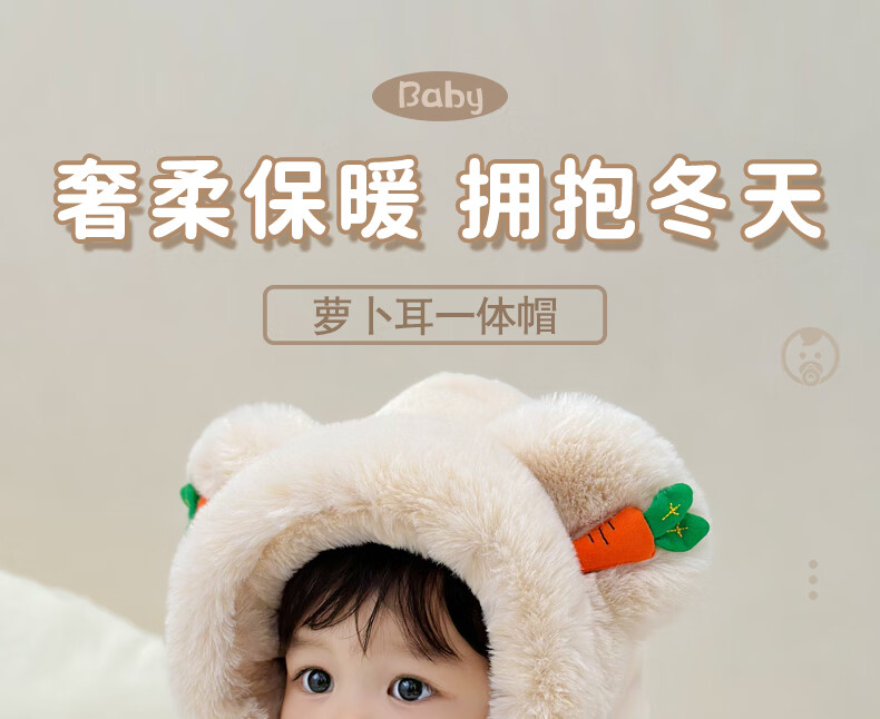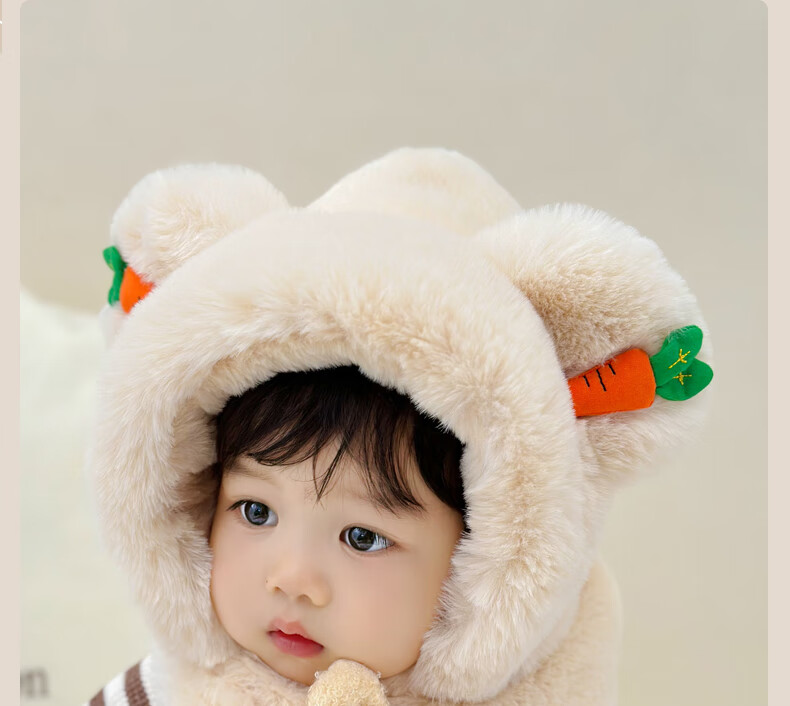 宝宝帽子冬季萝卜小兔婴儿围脖一体帽男孩女童秋冬加厚防风毛绒帽 儿童毛绒帽-胡萝卜款-米色-1个