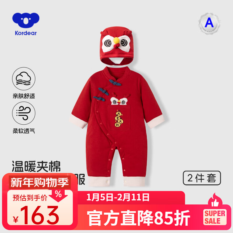 Kordear宝宝加厚夹棉保暖连体衣婴儿拜冬年服红色过新年服棉服 新年红+帽子 59cm