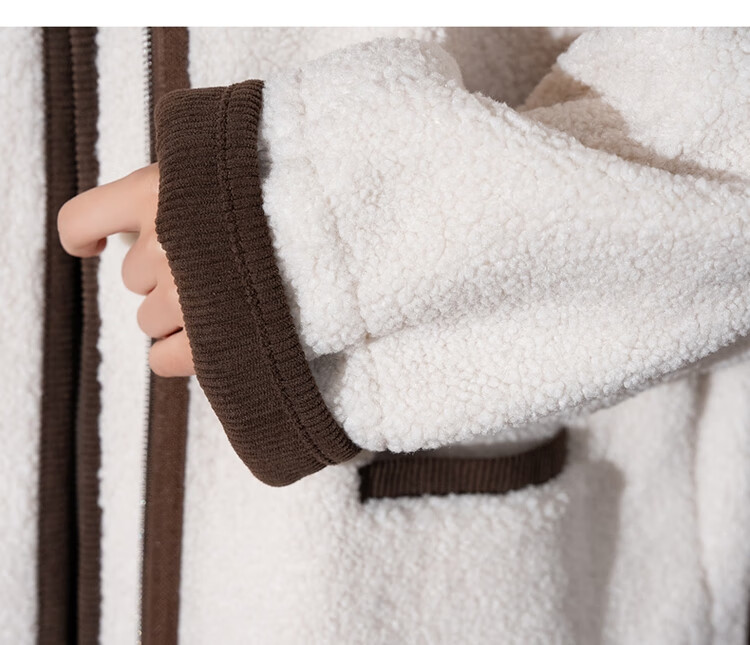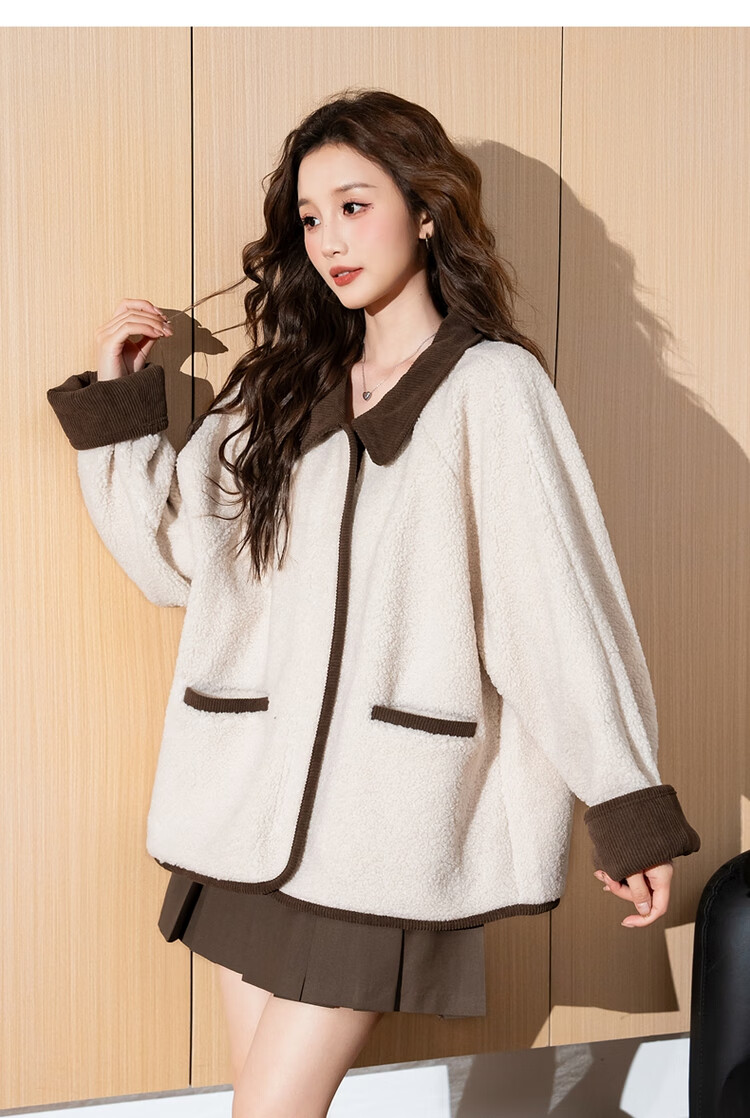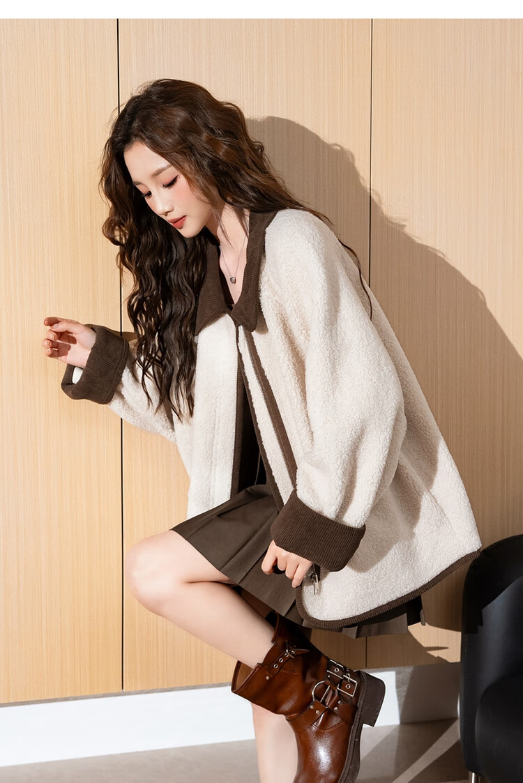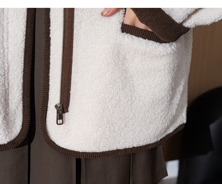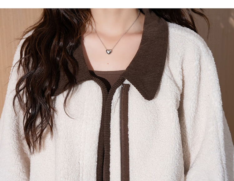 唐狮(TonLion)2024女翻领拼接女仿羊羔绒短款外套 浅杏色 M